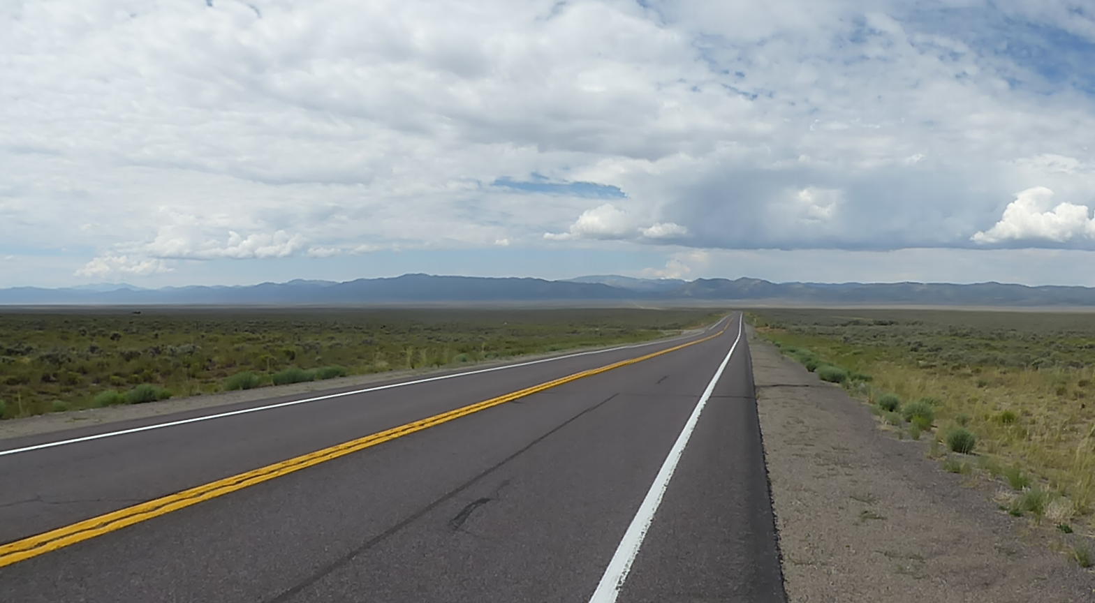 Instead, a bearded man with his face on fire looked out beyond his dog and shouted, with a vehemence that would blow a schooner adrift: "What the fuck you doin' over here? Git the fuck back over there, you motherfucker!" What made it better is that a sign every hour has told us we were on The Loneliest Road in America. No long lines of traffic snarled behind us.