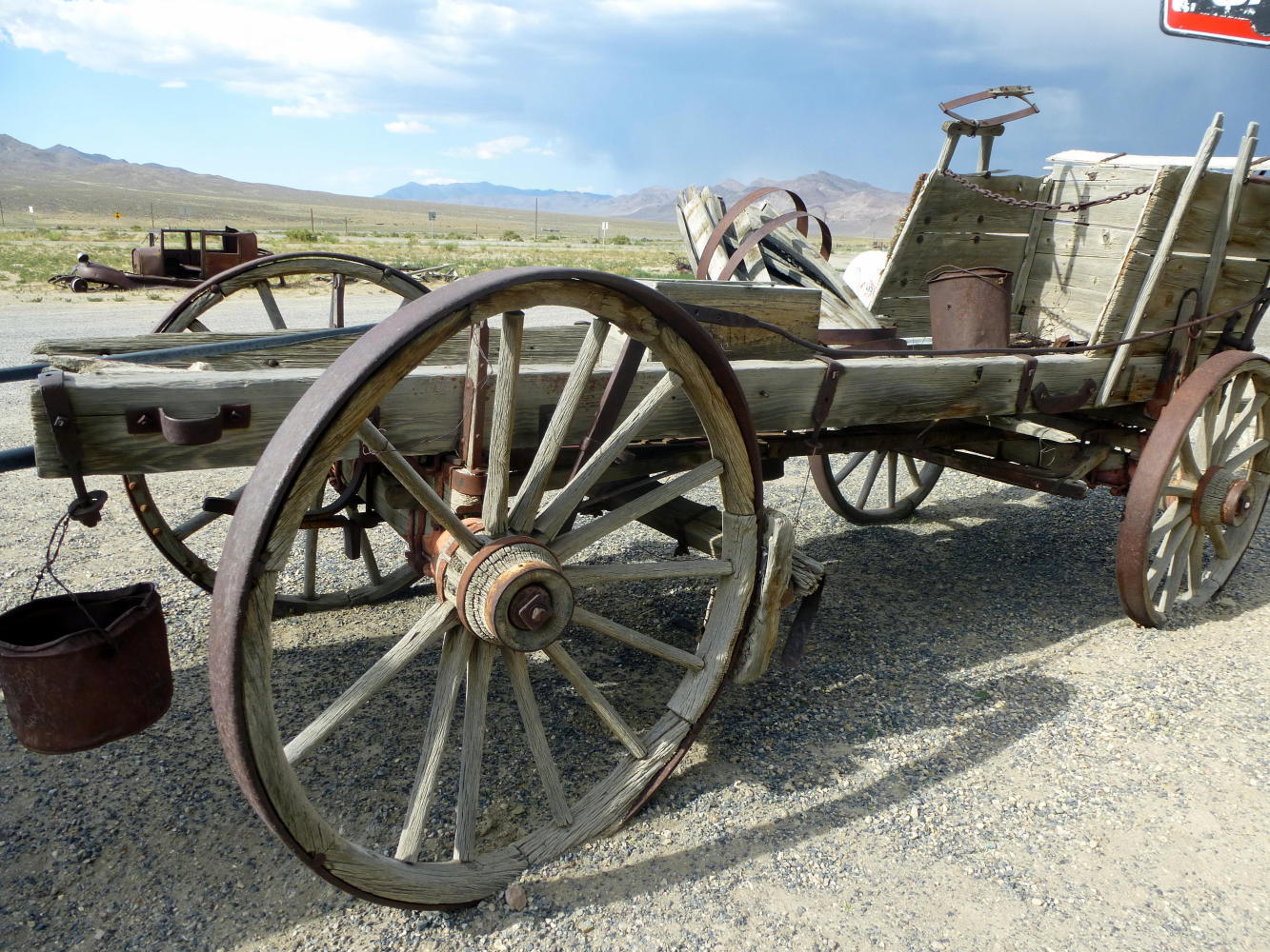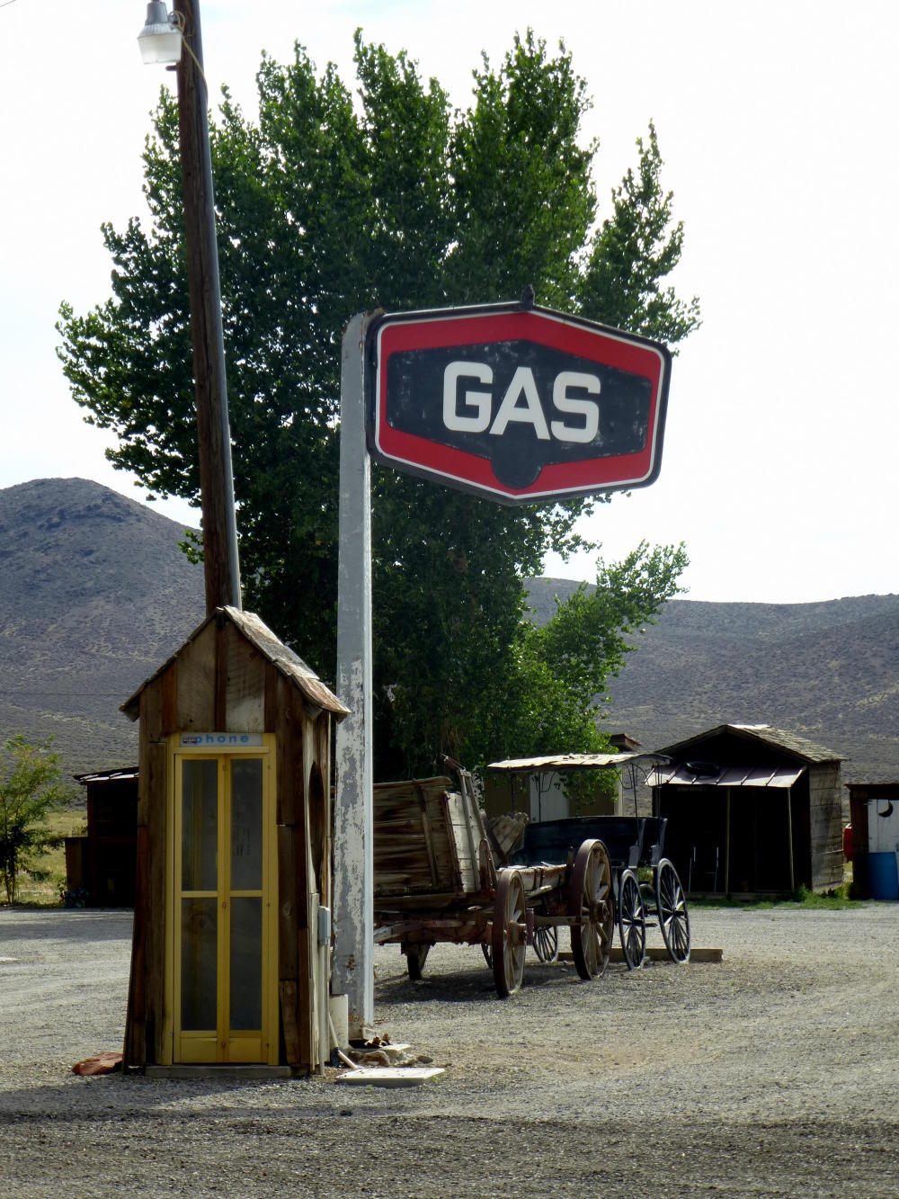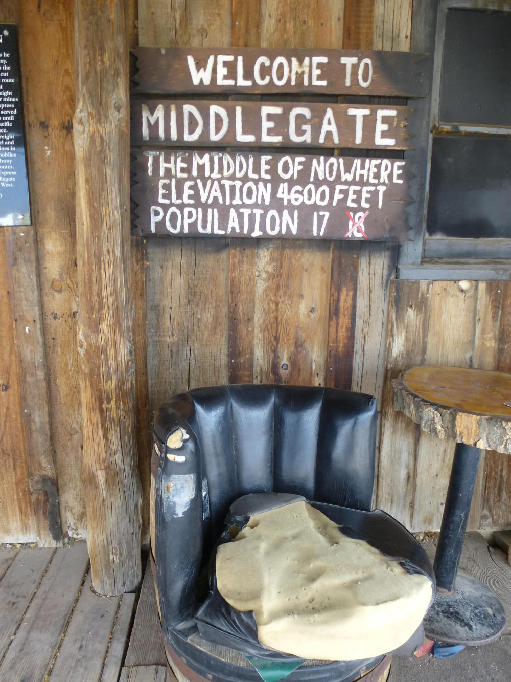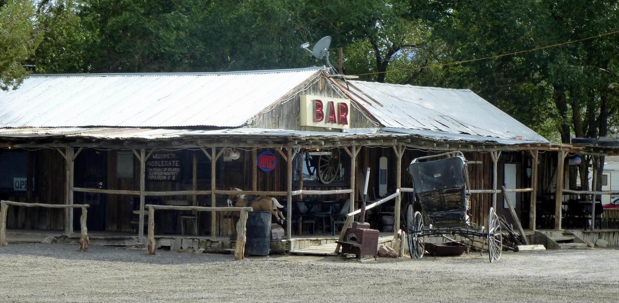 Don't be fooled by maps, those of Adventure Cycling or anyone else: Middlegate is not a hamlet, let alone a village or a town. It is a ramshackle bar, delightfully eccentric with the ceiling covered by signed dollars and part of one wall gummed with police badges from across the nation. Scattered about are wood cabins, old cars, a horse-drawn buggy which has long been without a horse, a phonebox with no phone, and a tank of petrol with instructions to serve yourself. A patch of intermittent grass serves as a free campground and, beyond that, a couple of bidon outhouses which I never investigated, largely because a man in a cowboy hat stood beside them grunting and stamping his foot.