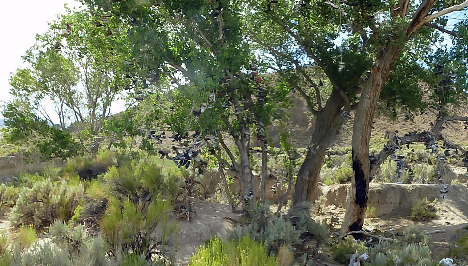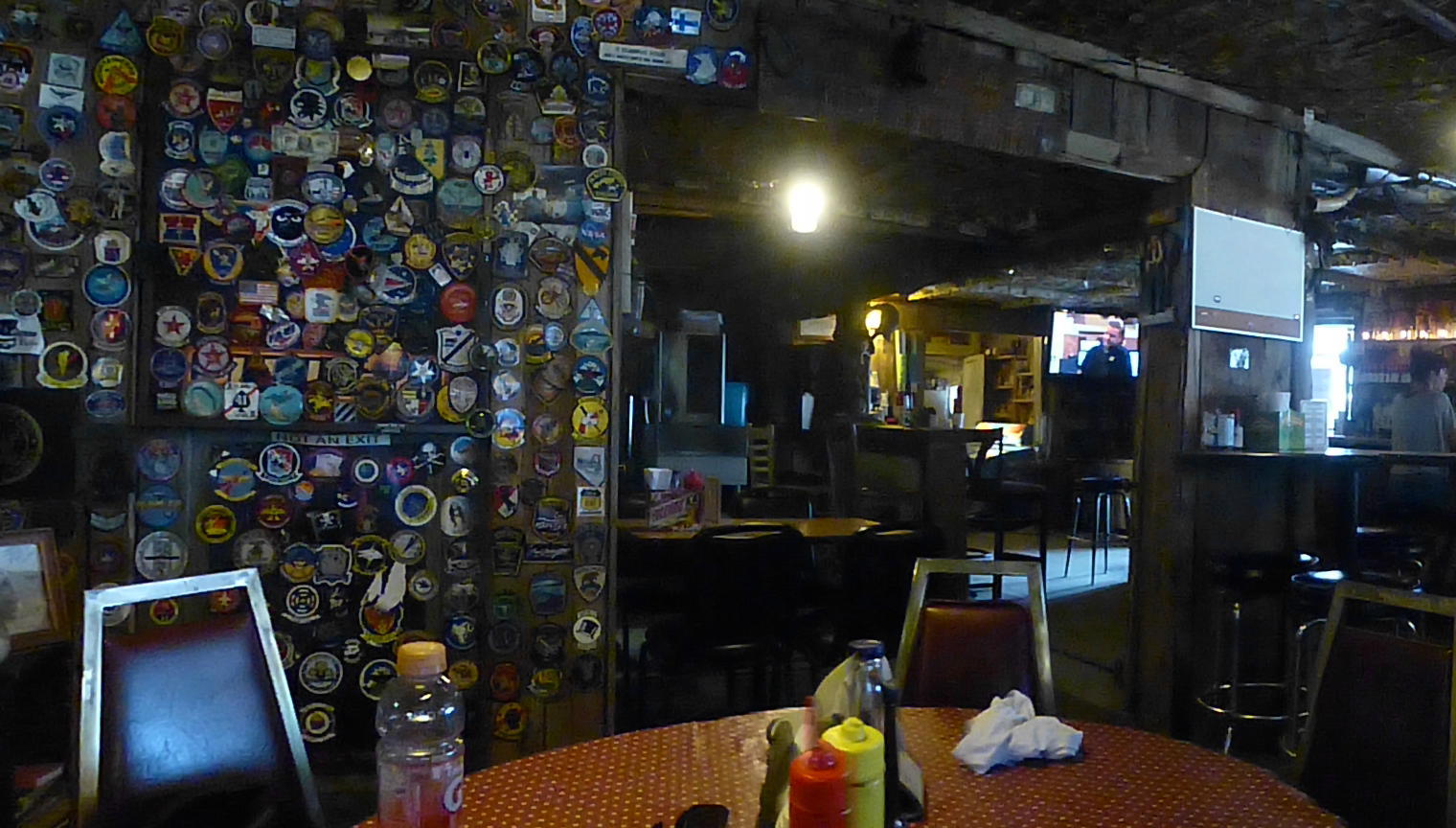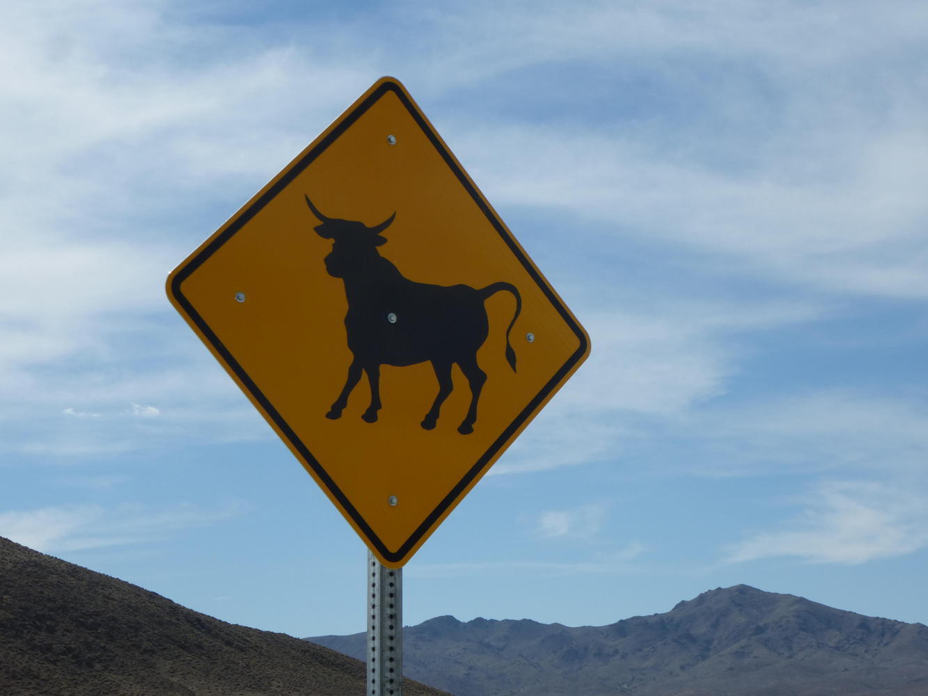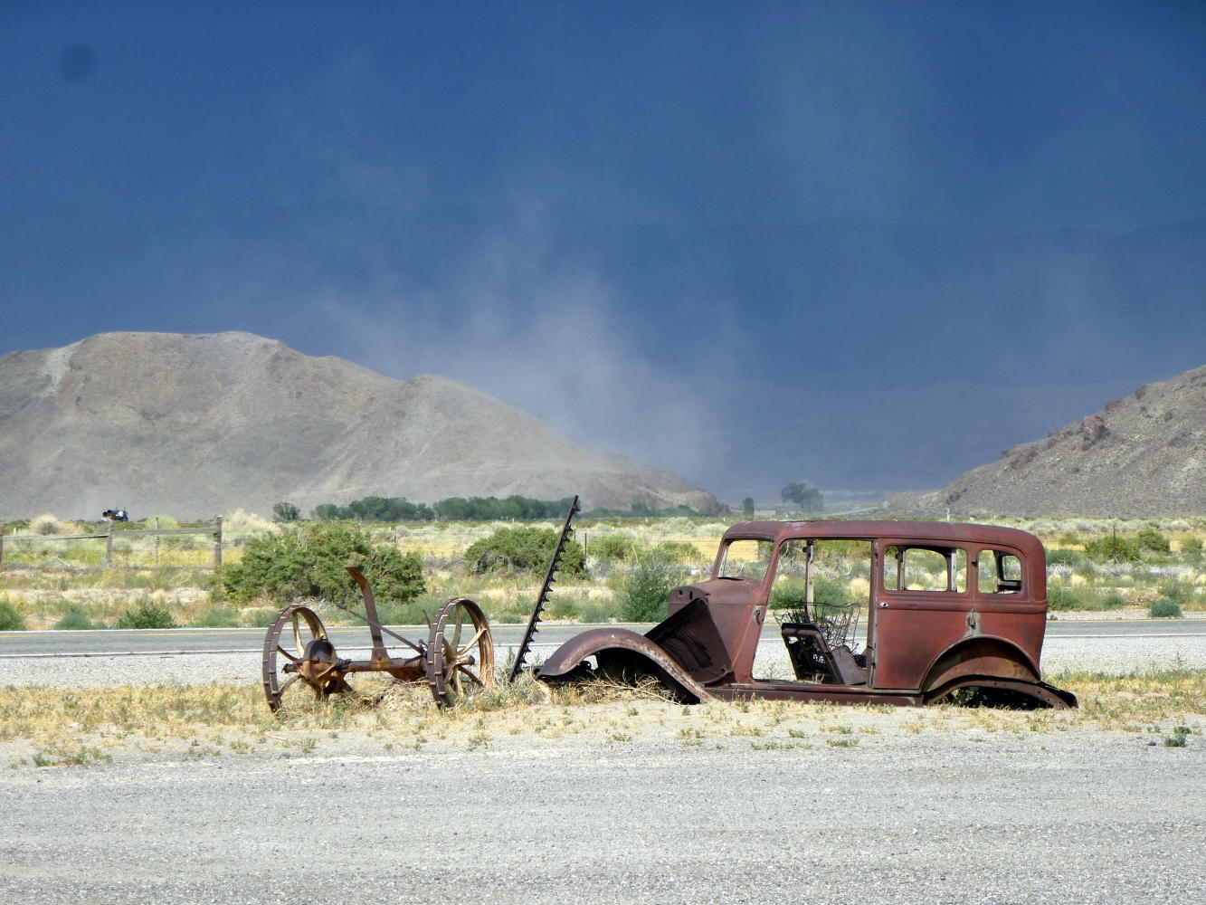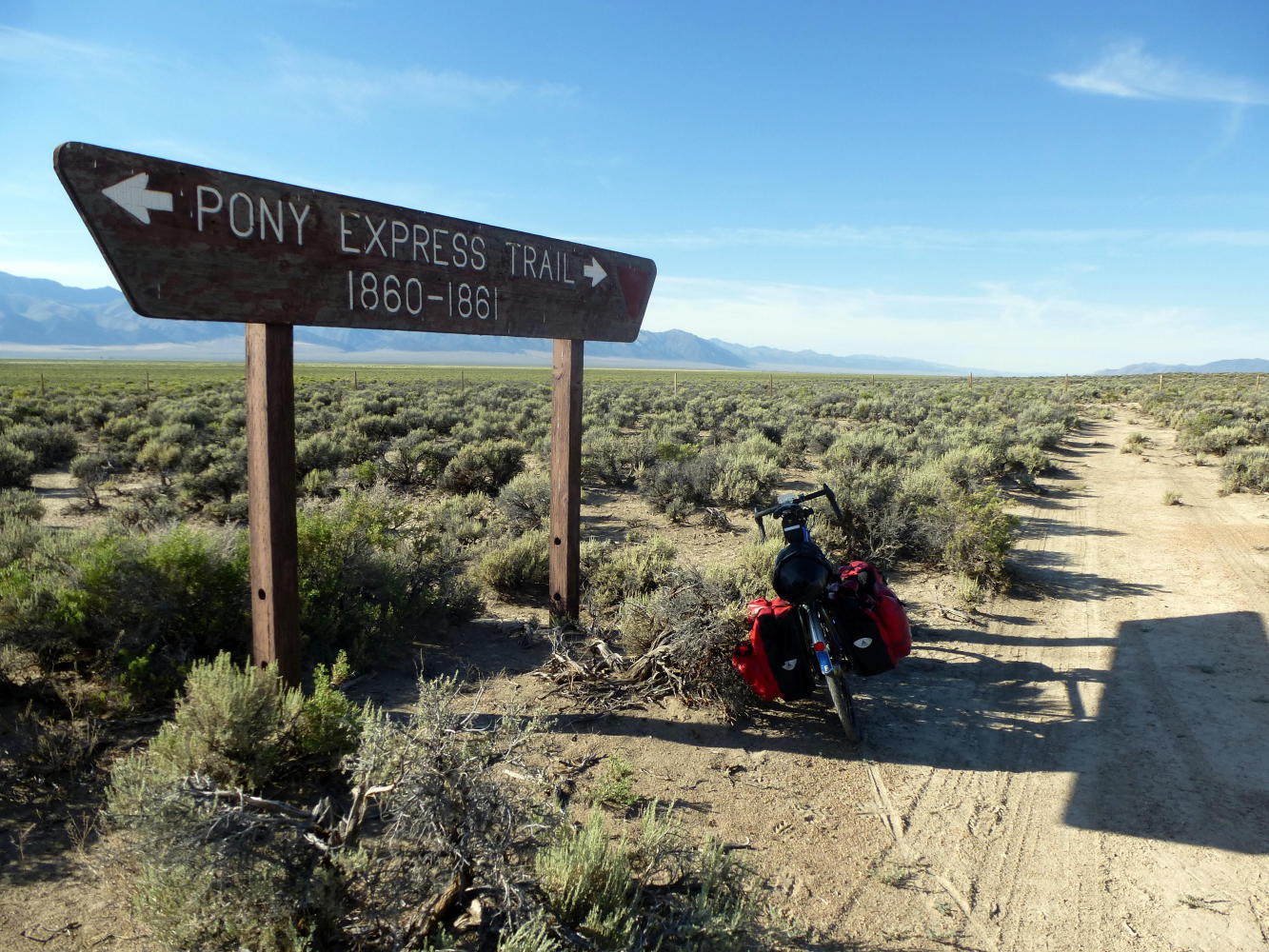 Don't be fooled by maps, those of Adventure Cycling or anyone else: Middlegate is not a hamlet, let alone a village or a town. It is a ramshackle bar, delightfully eccentric with the ceiling covered by signed dollars and part of one wall gummed with police badges from across the nation. Scattered about are wood cabins, old cars, a horse-drawn buggy which has long been without a horse, a phonebox with no phone, and a tank of petrol with instructions to serve yourself. A patch of intermittent grass serves as a free campground and, beyond that, a couple of bidon outhouses which I never investigated, largely because a man in a cowboy hat stood beside them grunting and stamping his foot.