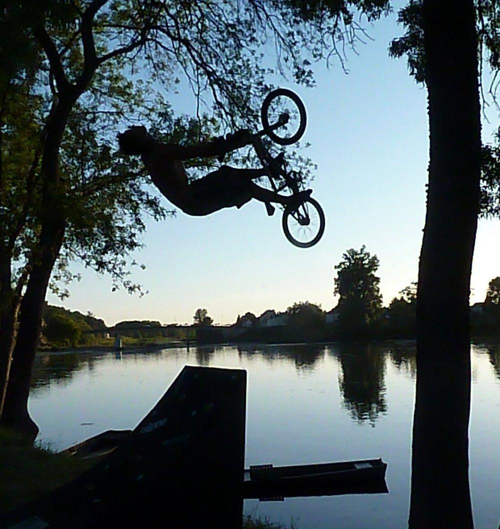 Later, after a dinner of bread, cheese, fruit and salad, oh, and cookies and pineapple juice, I went for a walk to take pictures and ran into some kids jumping their BMX bikes into the river off of a jump. COOL! Check out the pics I got. They had inter-tubes tied to the handlebars to keep the bikes from sinking.