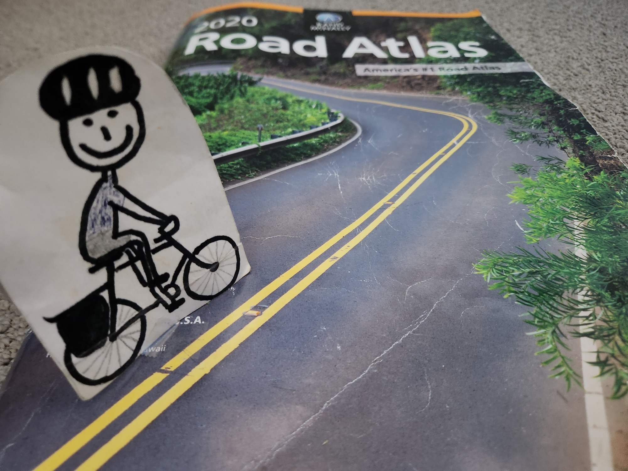 A few weeks ago, I started thinking about a new and interesting place for a bike tour. I consulted my most reliable resource--Rand-McNally. In today's world, a six-year-old road atlas is probably the LAST place most people consult for planning a bike tour. I'm not most people though. I'm ME, and Rand-McNally's book of maps is the FIRST place I look. It used to be the ONLY place I looked. I did not care about techno-maps at all. I love how paper maps reduce the world to a beautiful simplicity, which works out well for a simple-minded person like me.