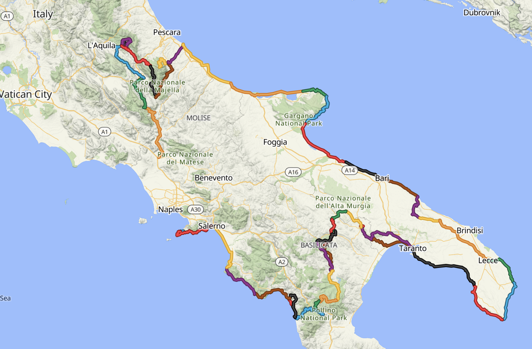 So here's the plan: fly to Naples, ferry to Sorrento, then ride down the coast until it's time to turn away from the Tyrrhenian Sea and climb into Pollino National Park. Stops in Gravina in Puglia and Matera to be followed by a loop around the heel and up and around Gargano, then into the mountains of Abruzzo until finding a train to Rome (probably from Sulmona but maybe Sora) or back to Naples from Vairano-Caianello. There might or might not be an excursion to the Tremiti Islands if the ferry is running from Rodi Garganico or Vieste (which would replace the ride from Rodi to Termoli).