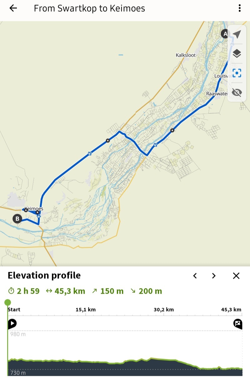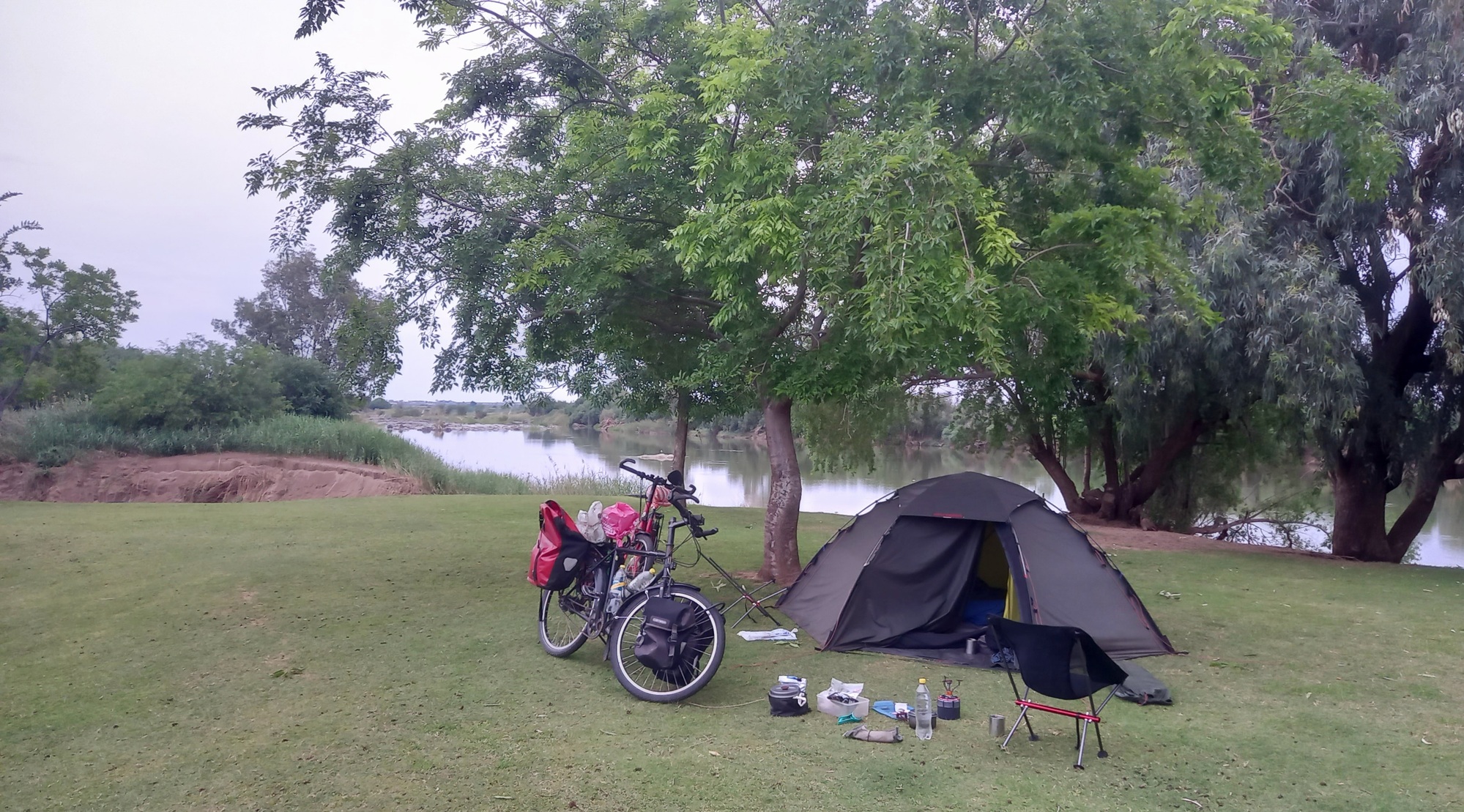 There are two camping facilities near Keimoes, both south of the town on the road to Kenhardt. This meant we had to first detour into town t8,8k9o buy groceries. The only decent supermarket is on the western edge of the town so we had to backtrack a few kilometers to get to our destination for the night. Once again it is on a farm on the river, this time a grape farm.
