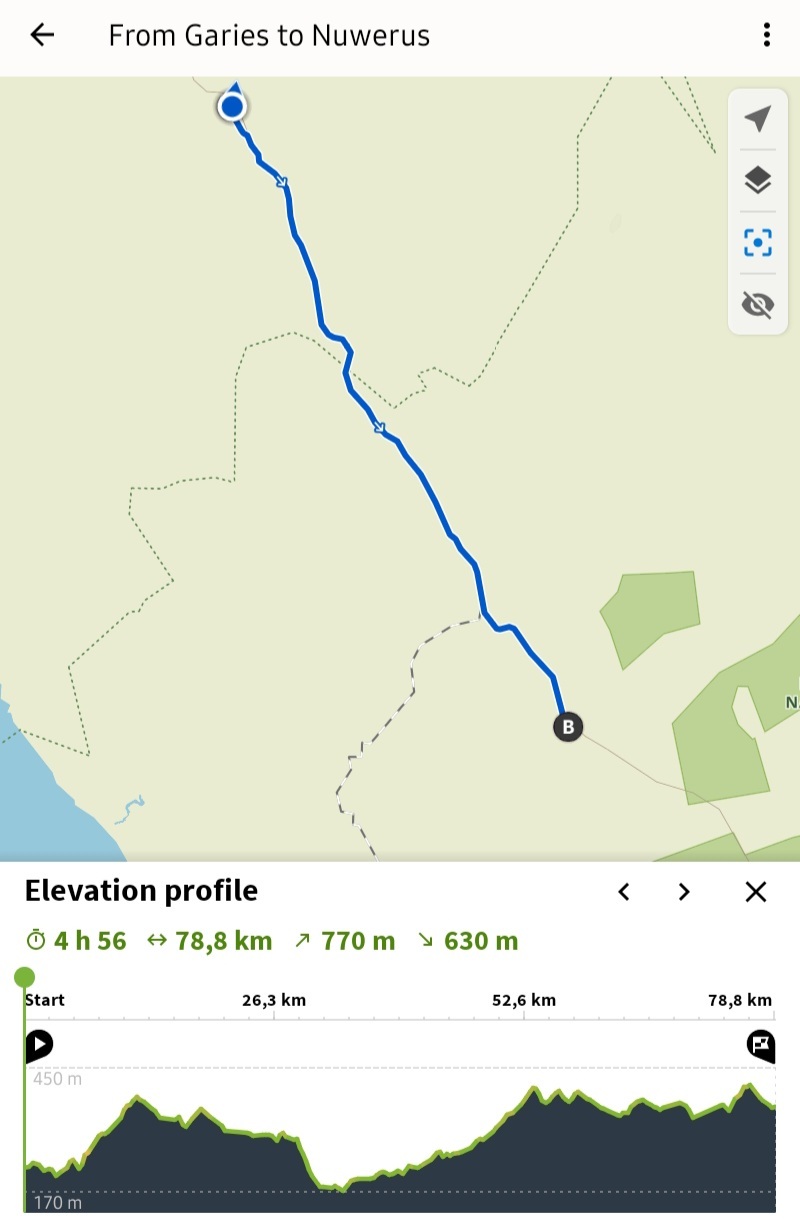 In the end the wind only troubled us over the last twenty kilometers and we rolled in to the Hardeveld Lodge at Nuwerus soon after two thirty. In fact, the never ending rolling hills were a far greater reason than the wind for the ride being rather strenuous. It felt as if we were constantly either climbing or descending.