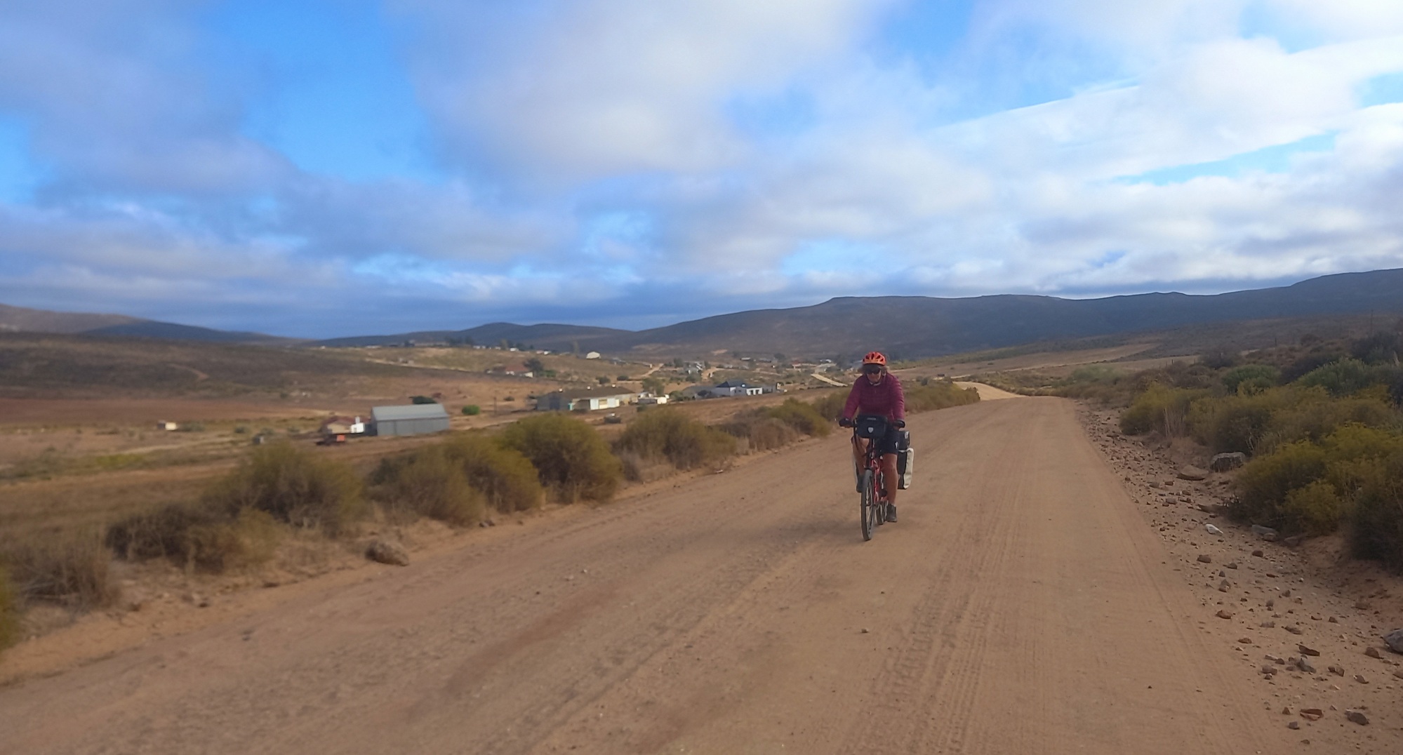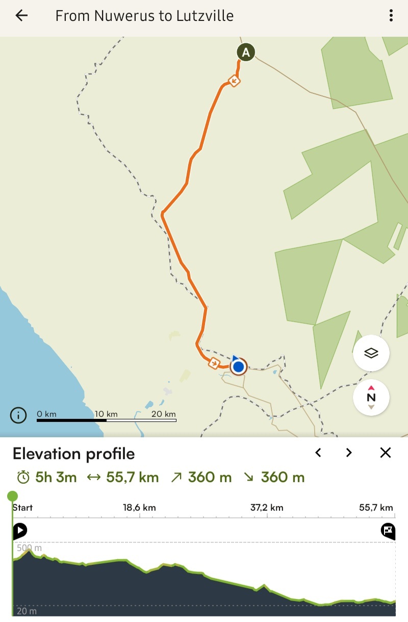 The wind that we mostly avoided on the way to Nuwerus was ready and waiting for us by the time we left at about a quarter past seven. In retrospect this was about an hour too late. Despite the general downhill trend, the headwind made today hard work.