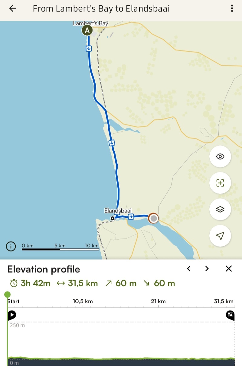 We had planned to head directly inland to Graafwater and Clanwilliam. Unfortunately the hotel in Graafwater, its only accomodation option, was fully booked and the distance and big climb needed to get to Clanwilliam wouldn't be prudent given Leigh's condition.