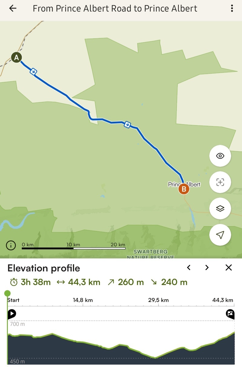 After yesterday's efforts, an easier day was called for and so it was until the last few kilometers into Prince Albert when a slow poison ascent combined with a fresh headwind to make it a bit of a slog.