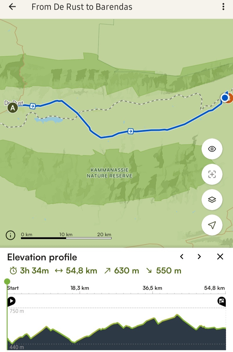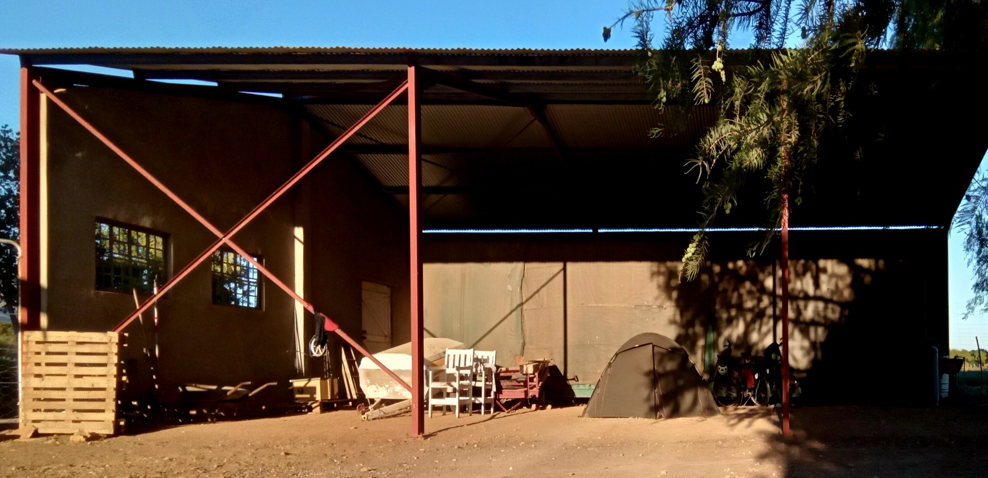 The distance from De Rust to Uniondale is less than a hundred kilometers but its a rather hilly route so we wanted to break it into two rides. The problem was that there seemingly is no accommodation available on the way. Google Maps showed a farm just over halfway that supposedly had a cottage rent but it is no longer operational. I asked if we could wildcamp on the farm and we were immediately offered the use of an open shed under which to pitch our tent and the use of a simple ablution facility.
