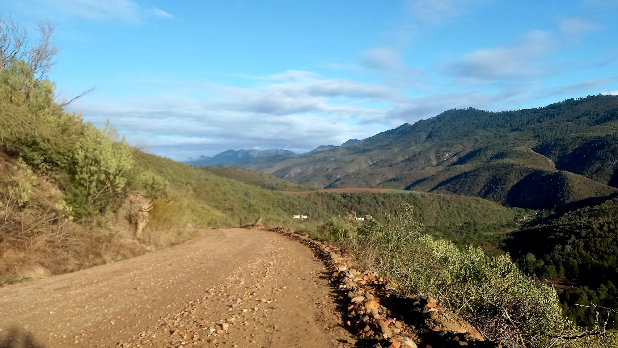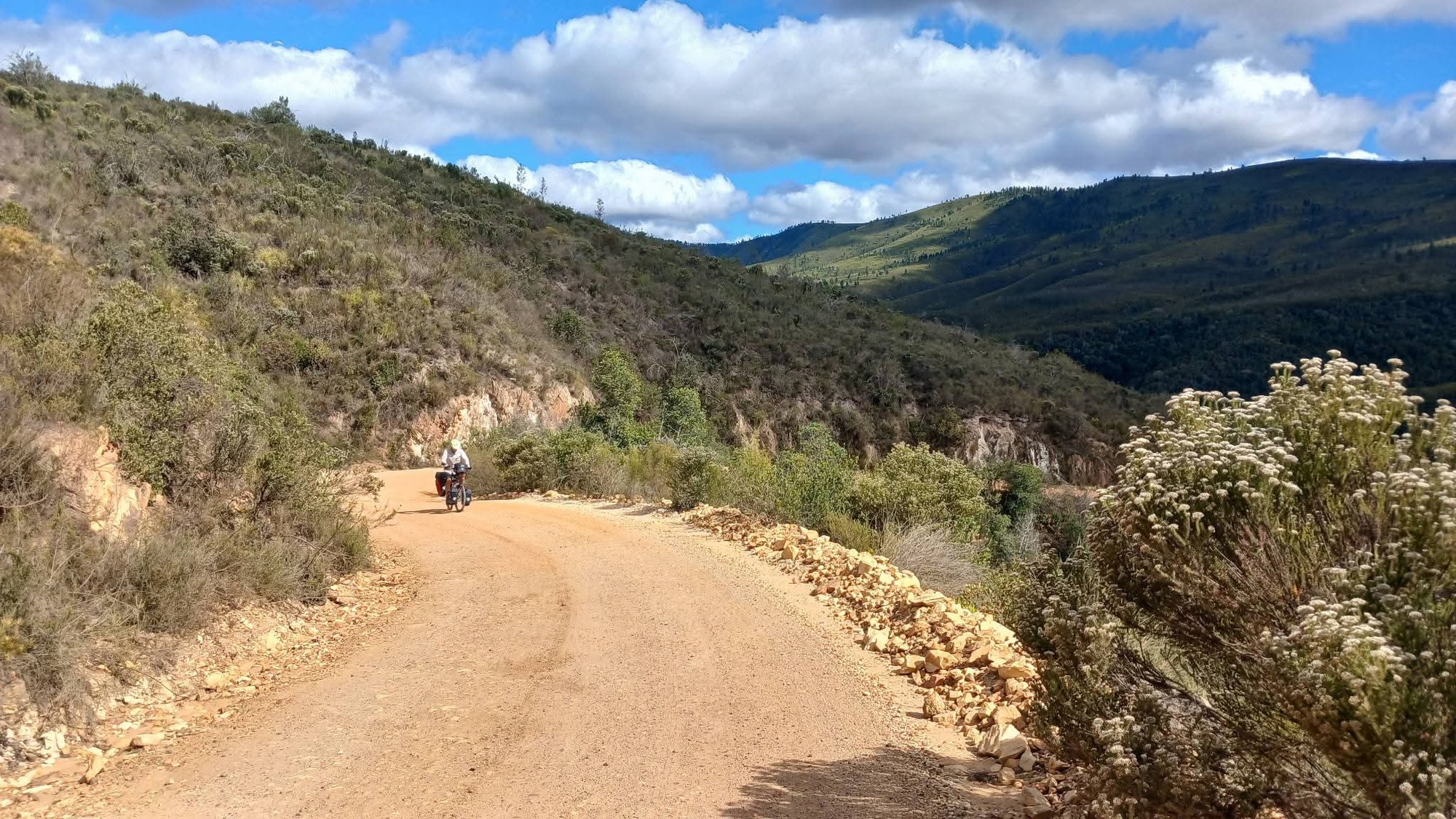 We had three big climbs today with lots of smaller ups and downs in between. The first climb of over three hundred meters started from the entrance to the campground and this set the tone of the day. Each of the three climbs had gradients over ten percent which were all rideable but the third climb had me walking about two hundred meters up a section of over fifteen percent. The road surface was pretty good until before the third climb at which point the it changed from packed earth to loose gravel with lots of corrugations. Thankfully the tar returned for the last seventeen kilometers of the ride.
