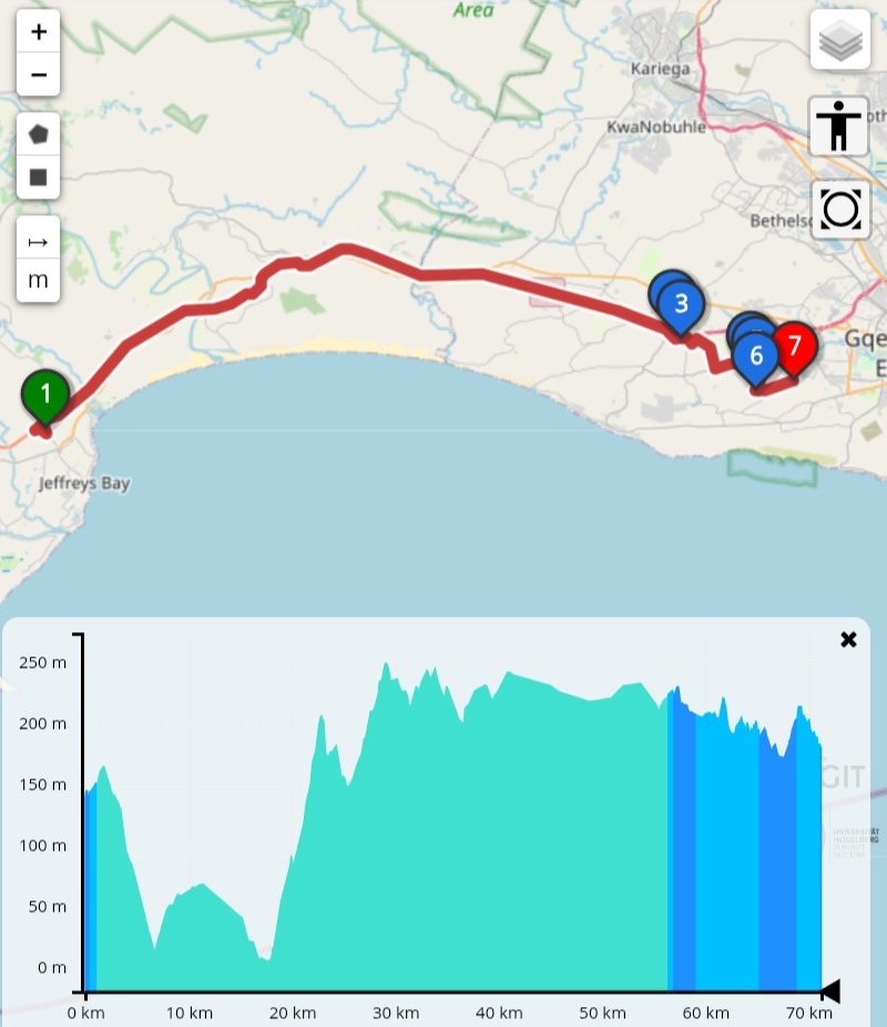 This is a large roadside services area that is a popular destination for cyclists from Gqeberha and for good reason with easy access, bike racks and even a mini cycle track with free bicycles. The farmer on the opposite side of the N2 has built styles to enable cyclists to cross his fields and access the facility without having to ride on the N2. We often ride out here using various backroads that range from good sealed surfaces to some rather rough tracks. So it was impossible not to stop here for a second breakfast before riding the last twenty five kilometers home on a familiar route.