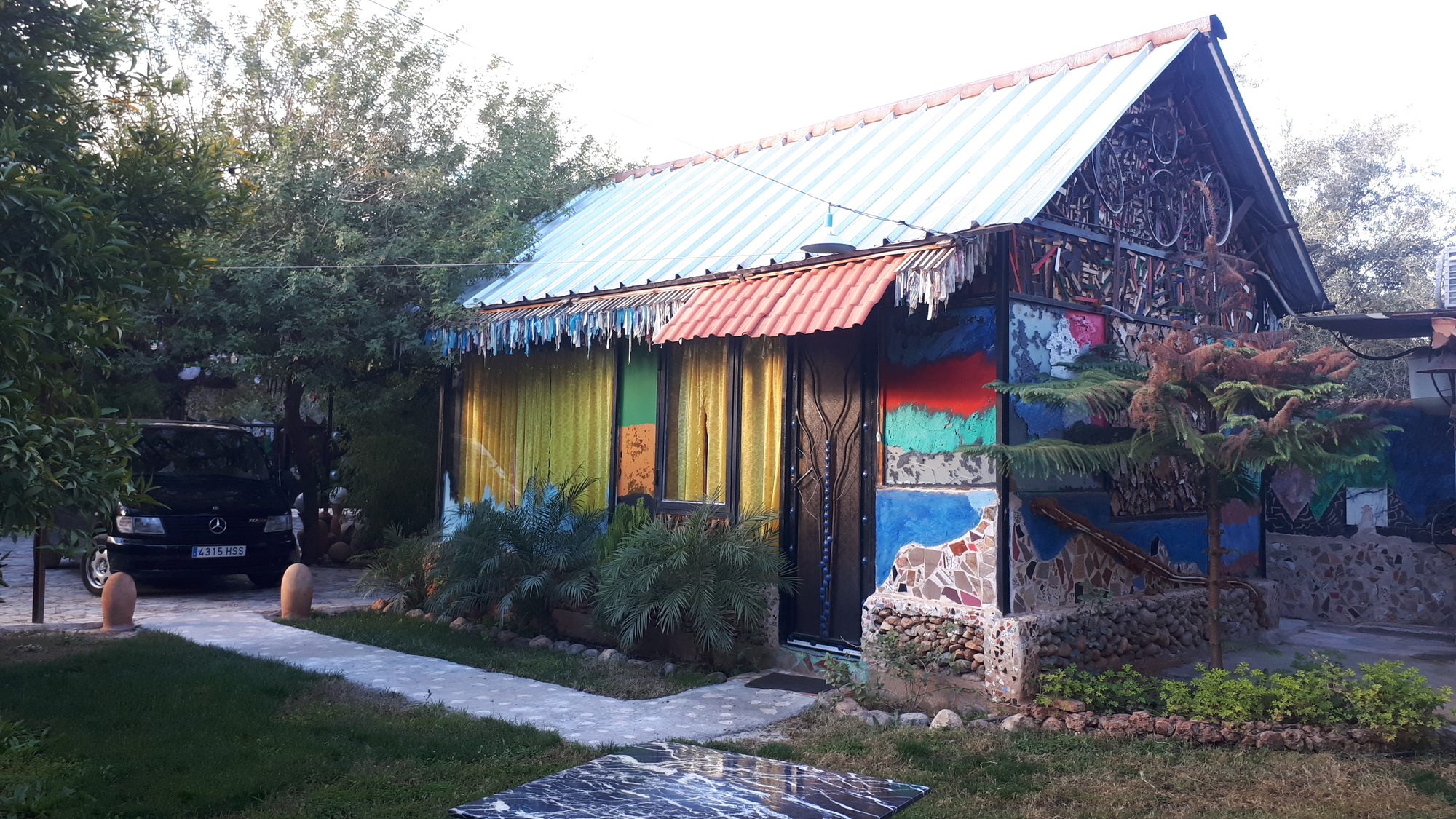La maison d'hôtes est vraiment exceptionnelle, tout est décoré avec des objets de récupération. On m'explique que les innombrables bouteilles qui ornent l'endroit ont été ramassées dans les bas côtés de la route. On aprecie ou pas le resultat, mais c'est une belle initiative.