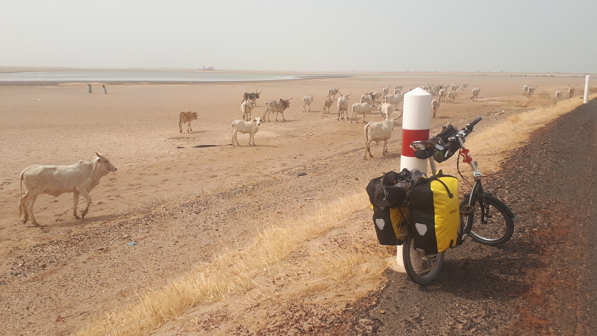 L'etape d'aujourd'hui est assez courte et sans vraiment de relief pour aller a Palmarin. Je démarre tard, le soleil ne tape pas trop. Sur le debut de parcours j'ai un vent de face, je plafonne a 16-17 km/h. Sur la route il y a un baobab sacré, le plus imposant du pays paraît il, en tous cas impressionnant.