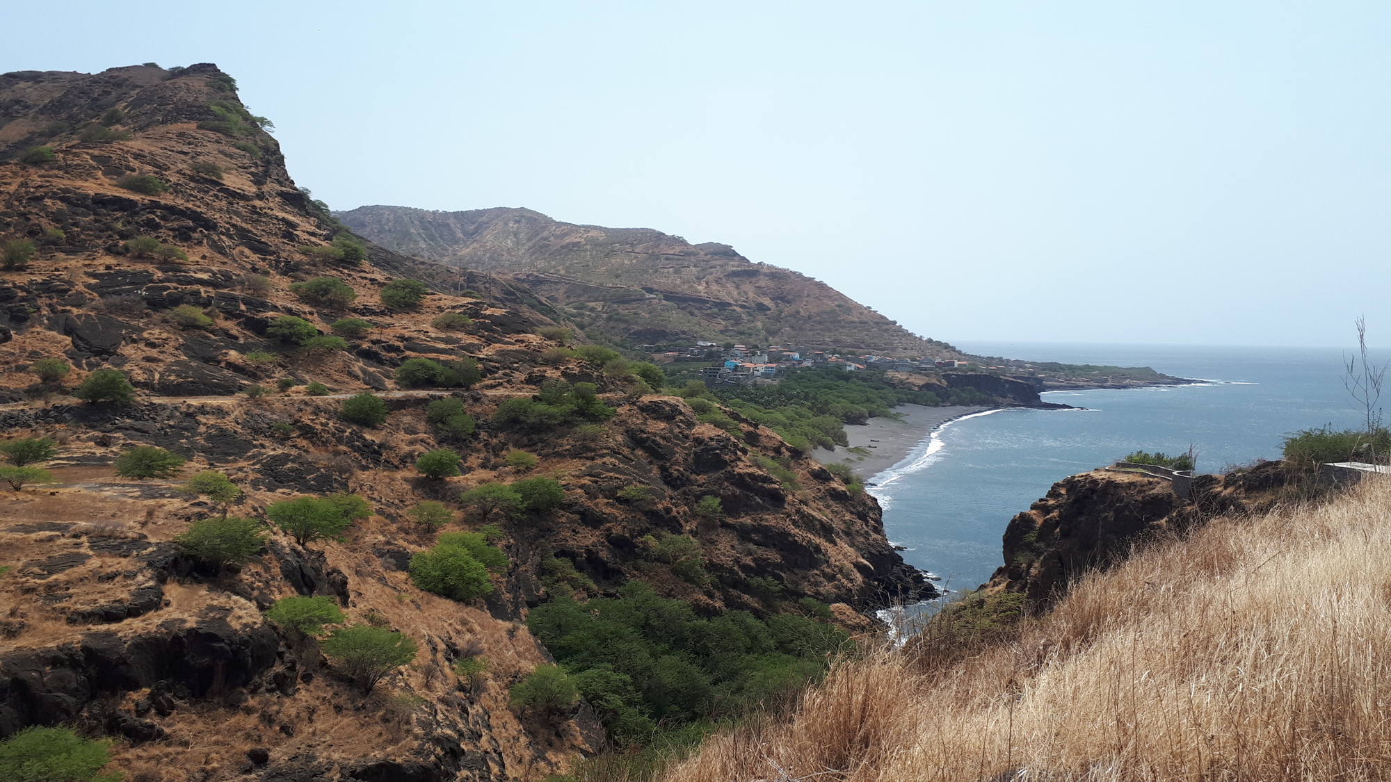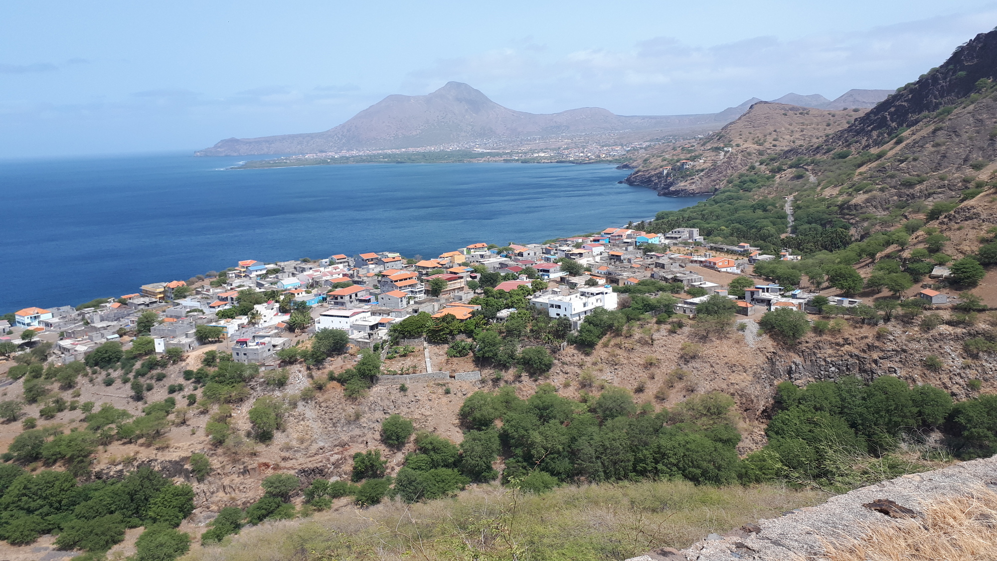 Cette étape est aussi belle que celle d'hier. Je démarre par une douce descente puis une lente remontée jusqu'à un croisement où se separent la route de Tarrafal et celle qui passe par Riveira da Prata. Je biburque à gauche sur la seconde, ça recommence a descendre fort puis, très rapidement, je retrouve une pente raide sur 250m de D+. J'arrive au village de Figueira da Naus, d'où on a un superbe point de vue sur la baie de Tarrafal.