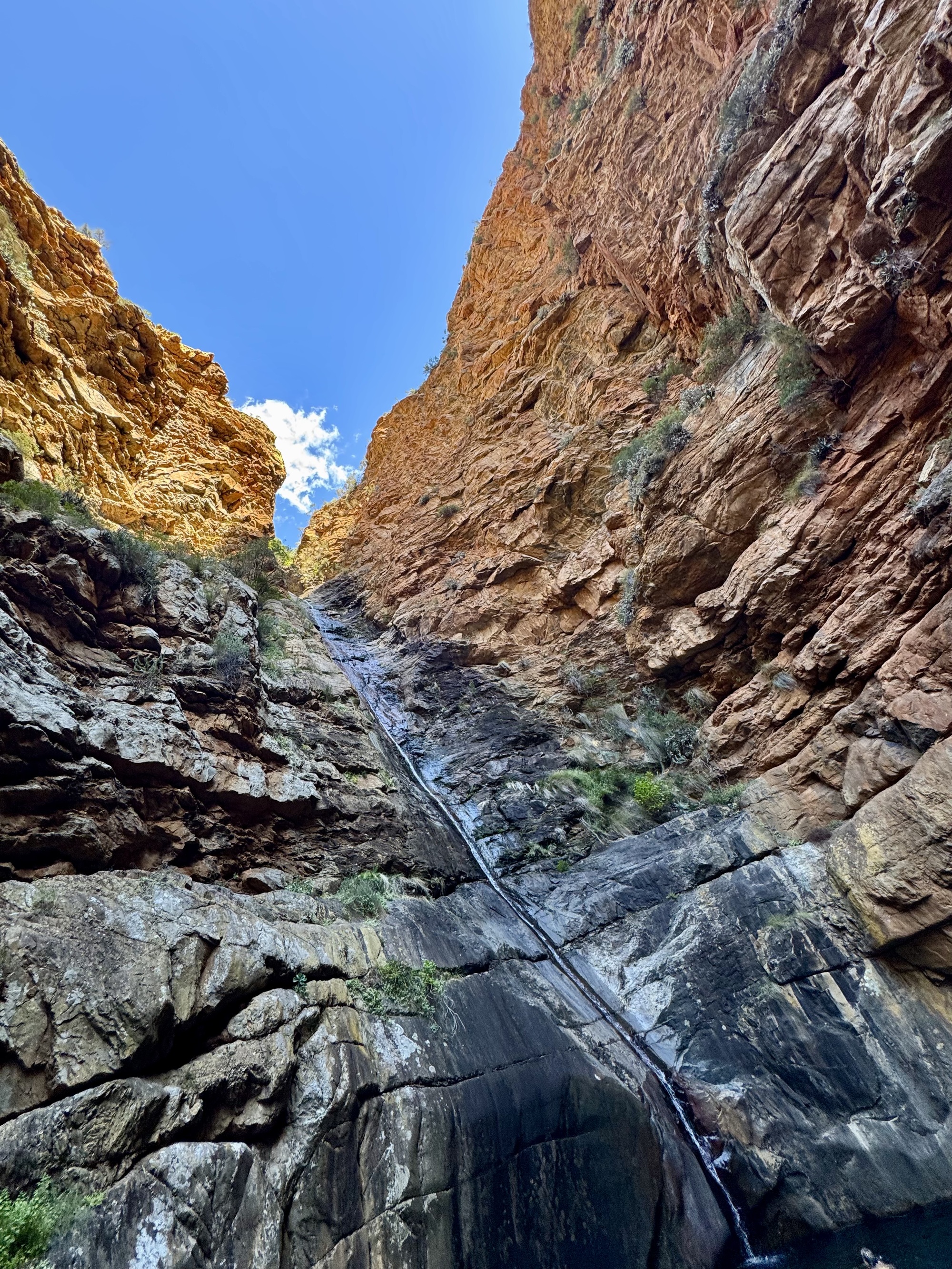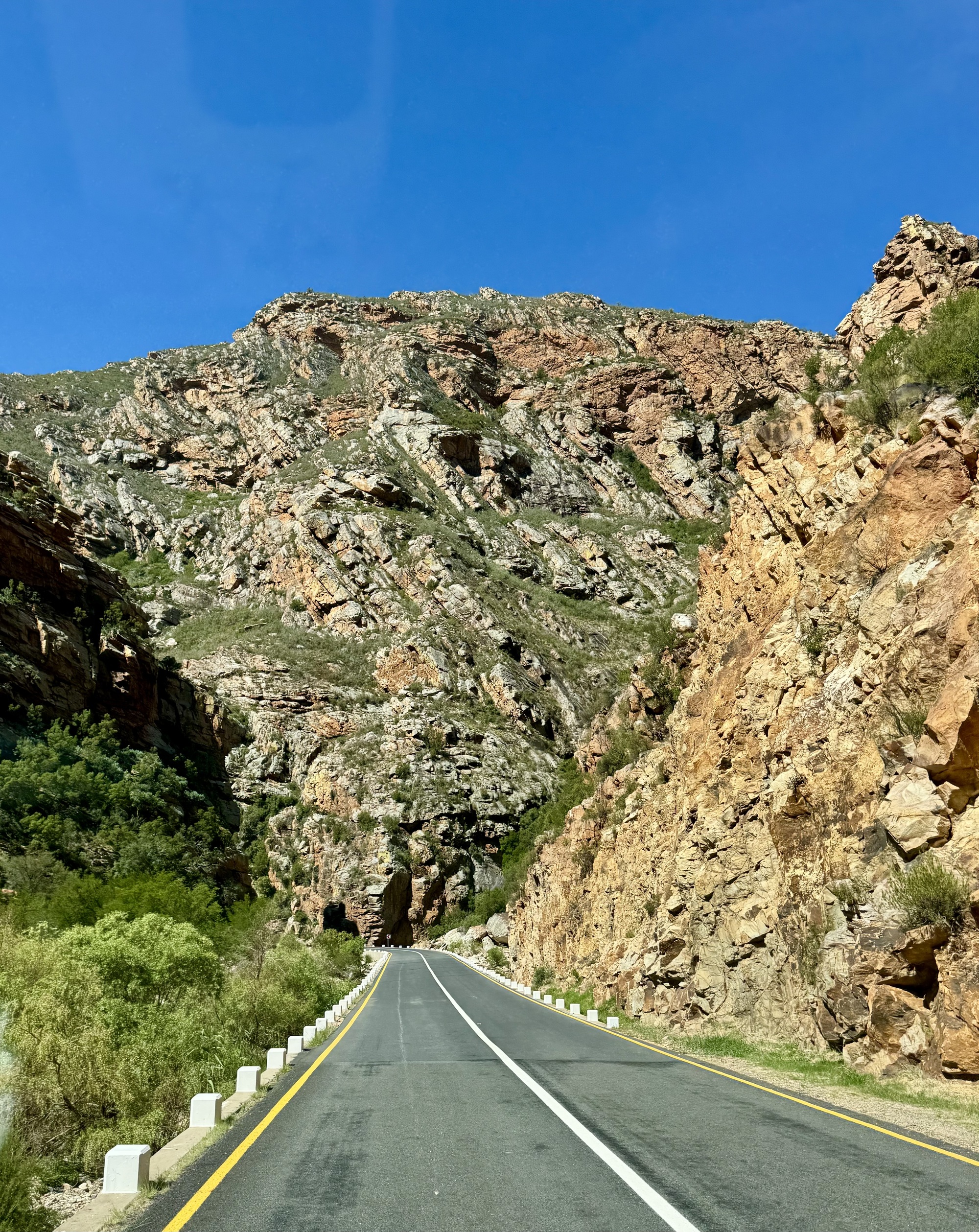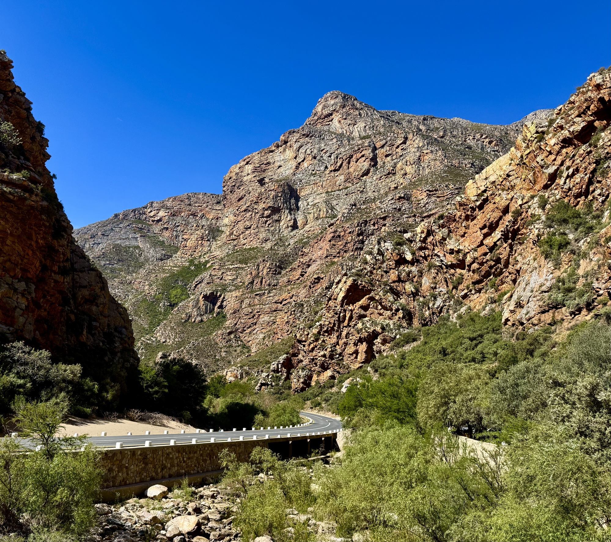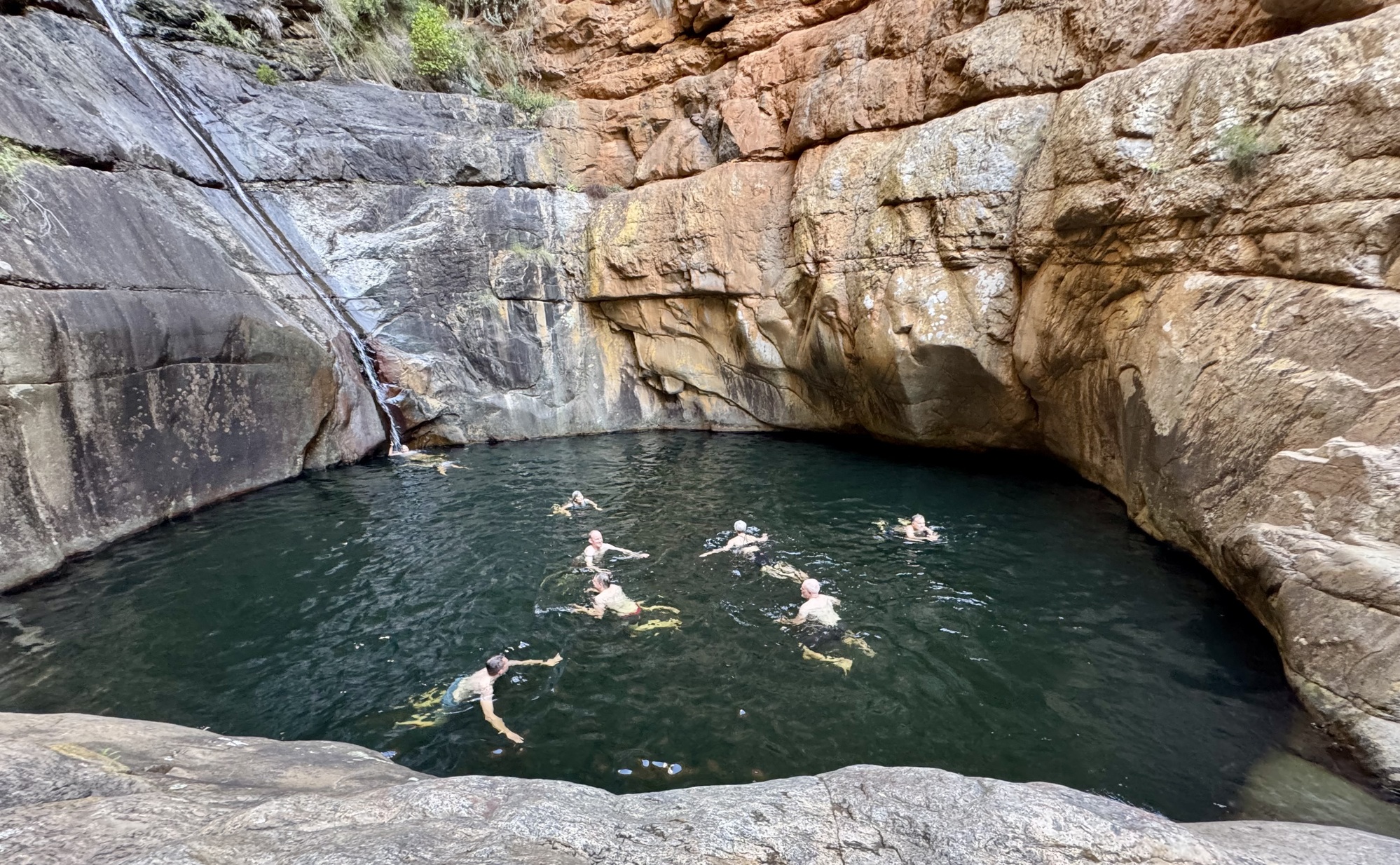Today was an amazing day riding through the Klein Karoo desert. The route was not that tough except for the heat but not about that in the photos. We rode 57km to the village of De Rust where we stopped for lunch. Then all but 3 of us rode to the Meiringspoort waterfall through the spectacular Meiringspoort pass to the Meiringspoort waterfall and pools. I chose not to ride but rather stayed in the van due to the heat and that I have been battling a bad cold for 5 days. I sound like I am coughing up a lung half the time. I also volunteered to be the photographer while everyone else took a plunge in the pools. It was my way of avoiding the cold water since I am really a wimp. We didn’t see many animals on the ride because they were smarter than us and sought shade. The phrase mad dogs and Englishmen in the midday sun was appropriate for today.