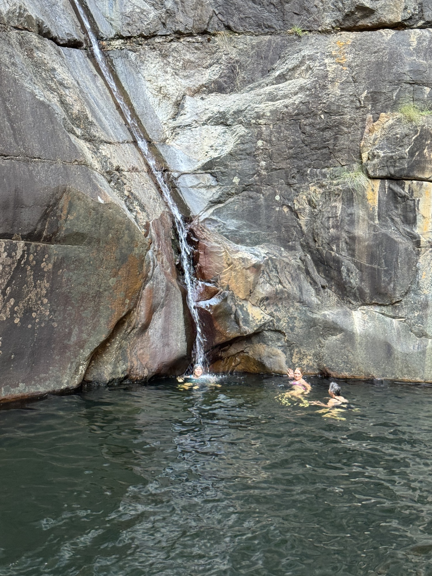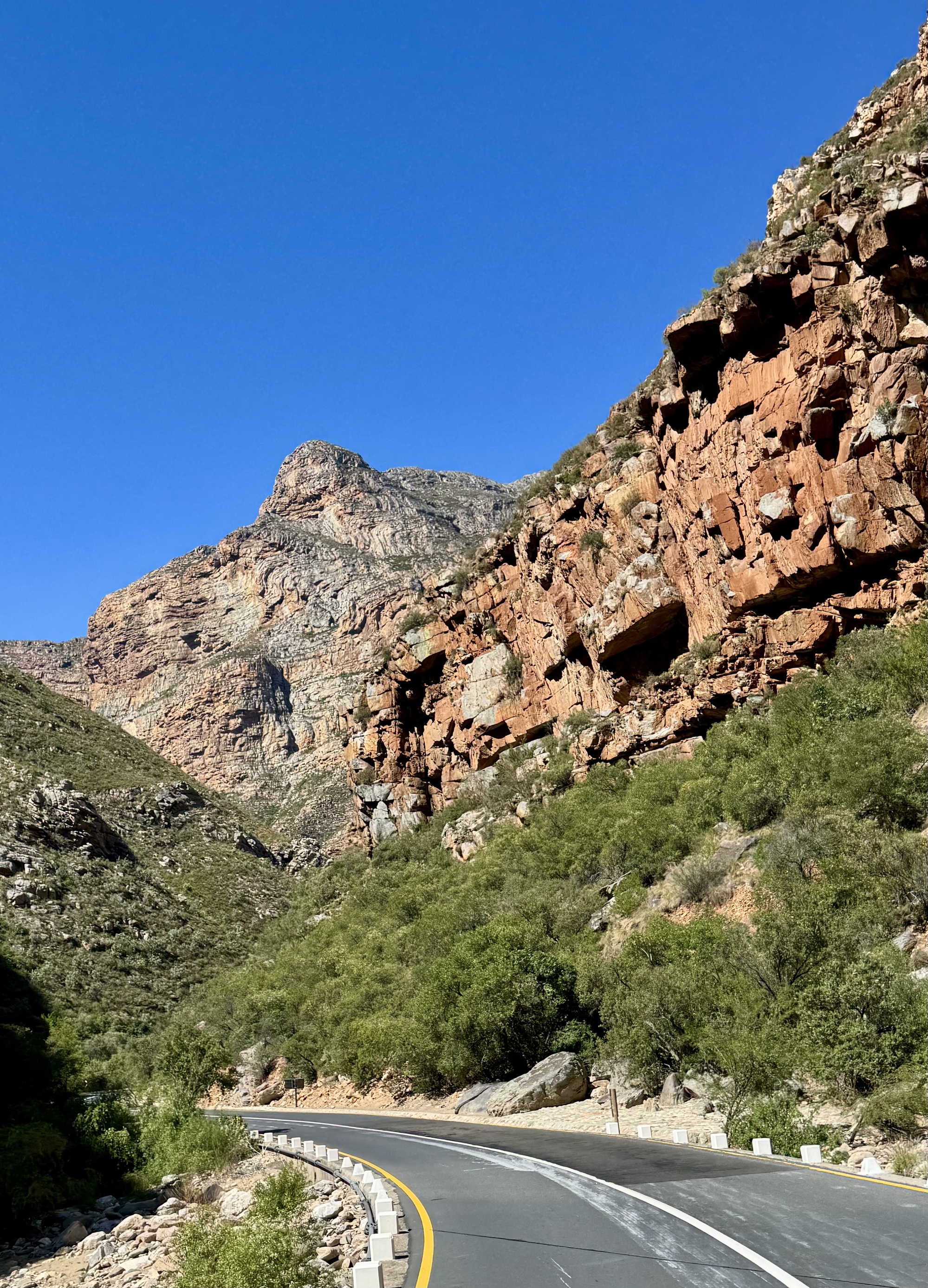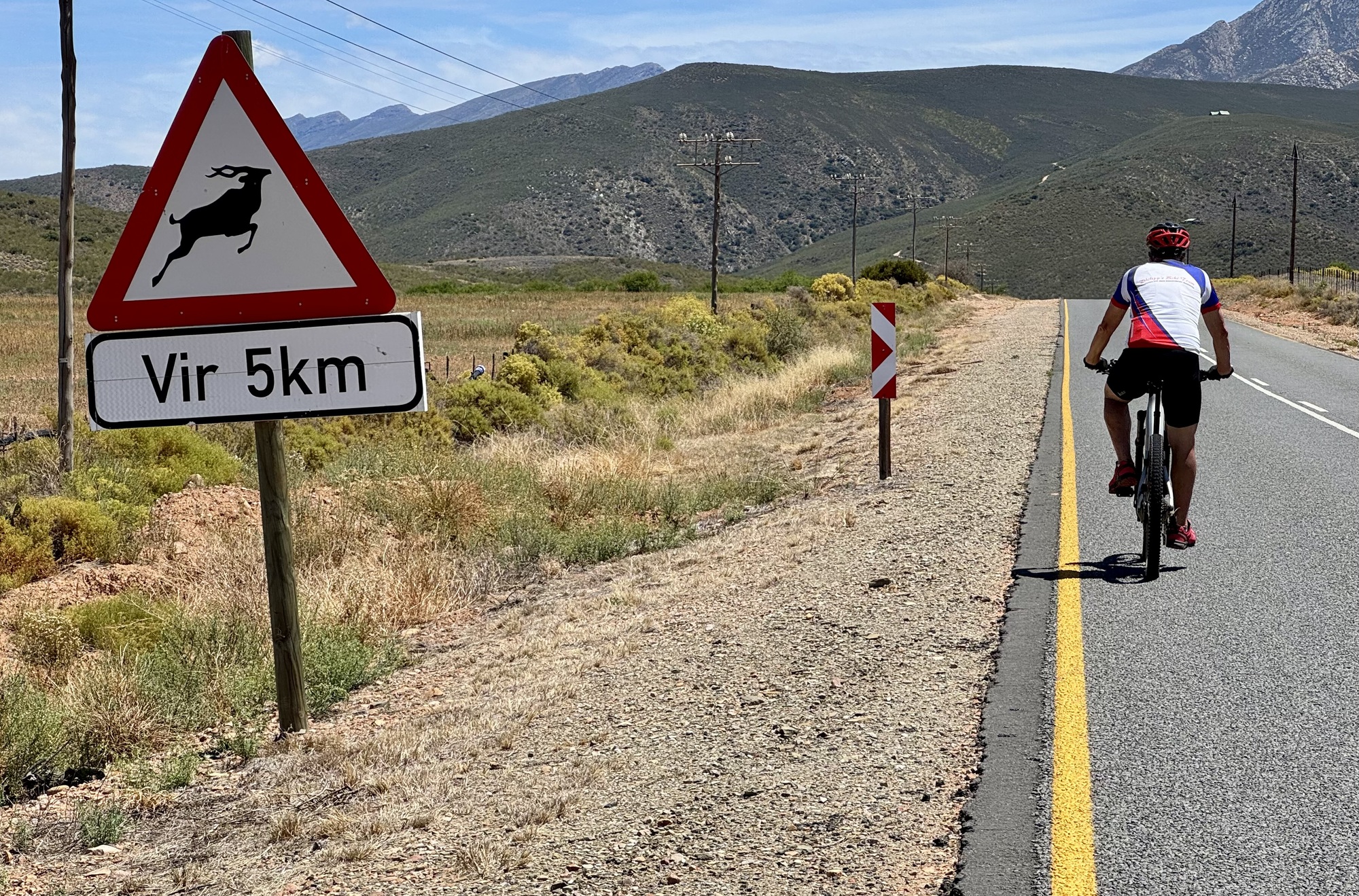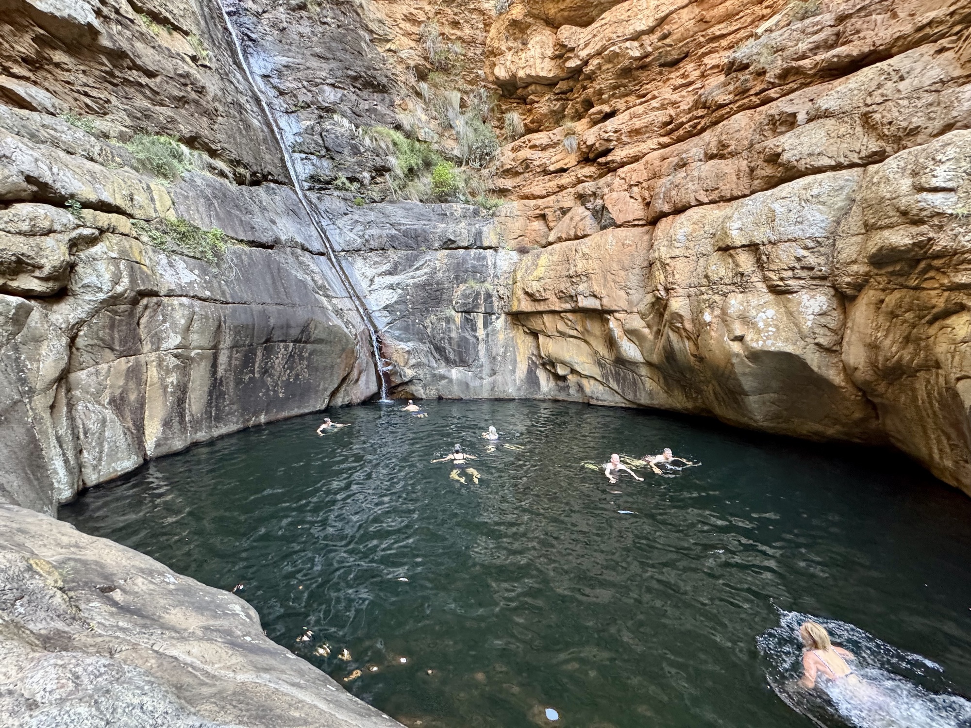 Today was an amazing day riding through the Klein Karoo desert. The route was not that tough except for the heat but not about that in the photos. We rode 57km to the village of De Rust where we stopped for lunch. Then all but 3 of us rode to the Meiringspoort waterfall through the spectacular Meiringspoort pass to the Meiringspoort waterfall and pools. I chose not to ride but rather stayed in the van due to the heat and that I have been battling a bad cold for 5 days. I sound like I am coughing up a lung half the time. I also volunteered to be the photographer while everyone else took a plunge in the pools. It was my way of avoiding the cold water since I am really a wimp. We didn’t see many animals on the ride because they were smarter than us and sought shade. The phrase mad dogs and Englishmen in the midday sun was appropriate for today.