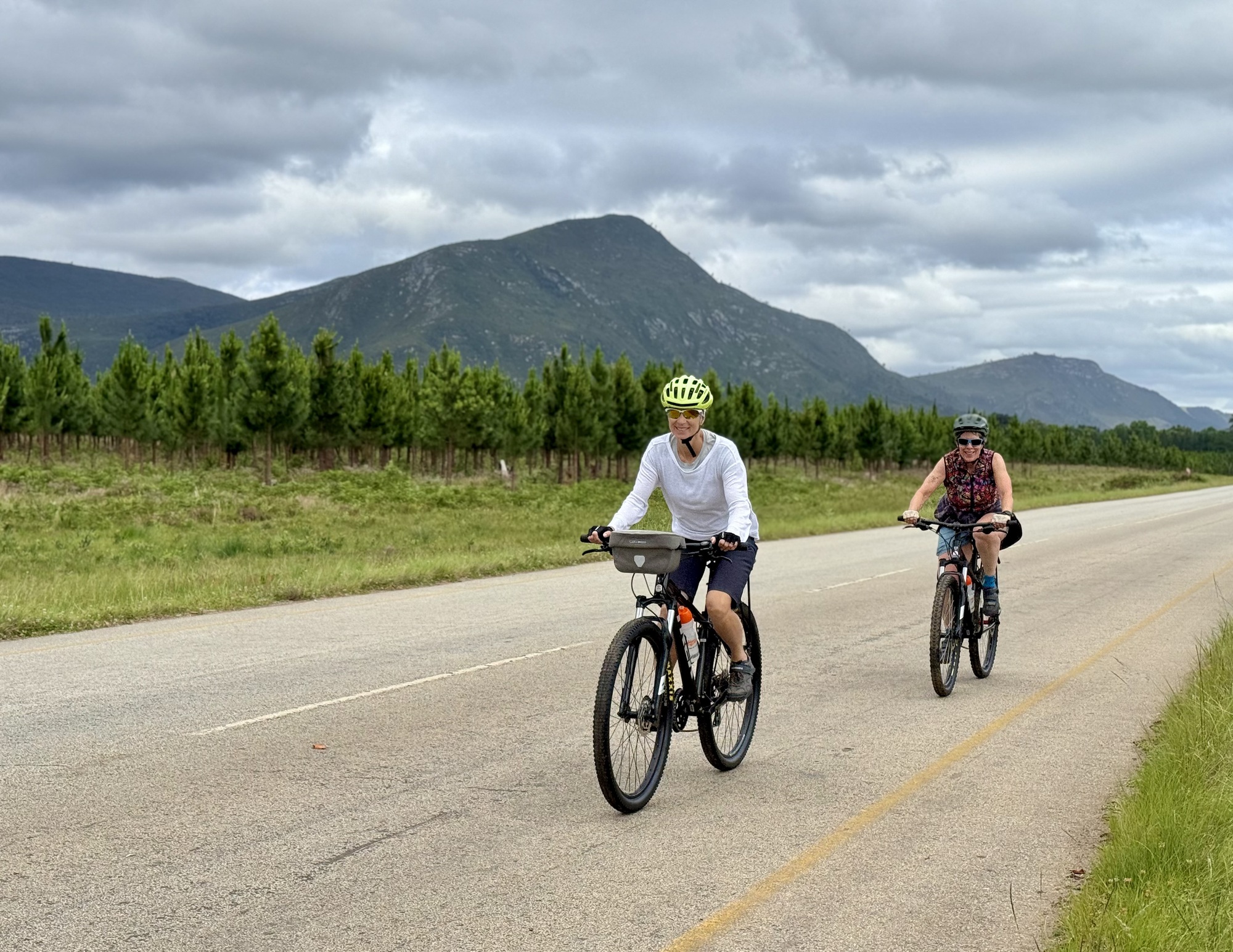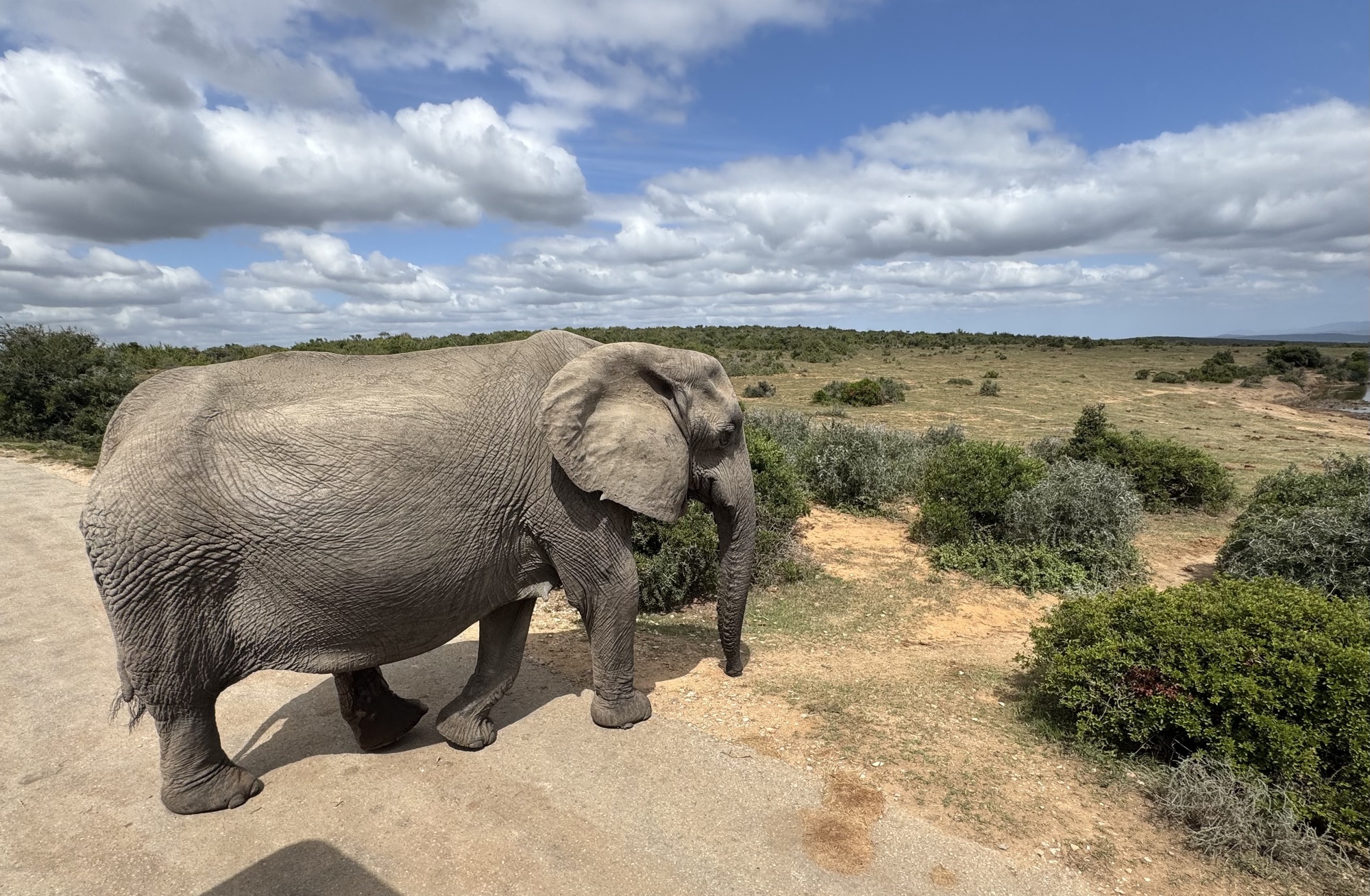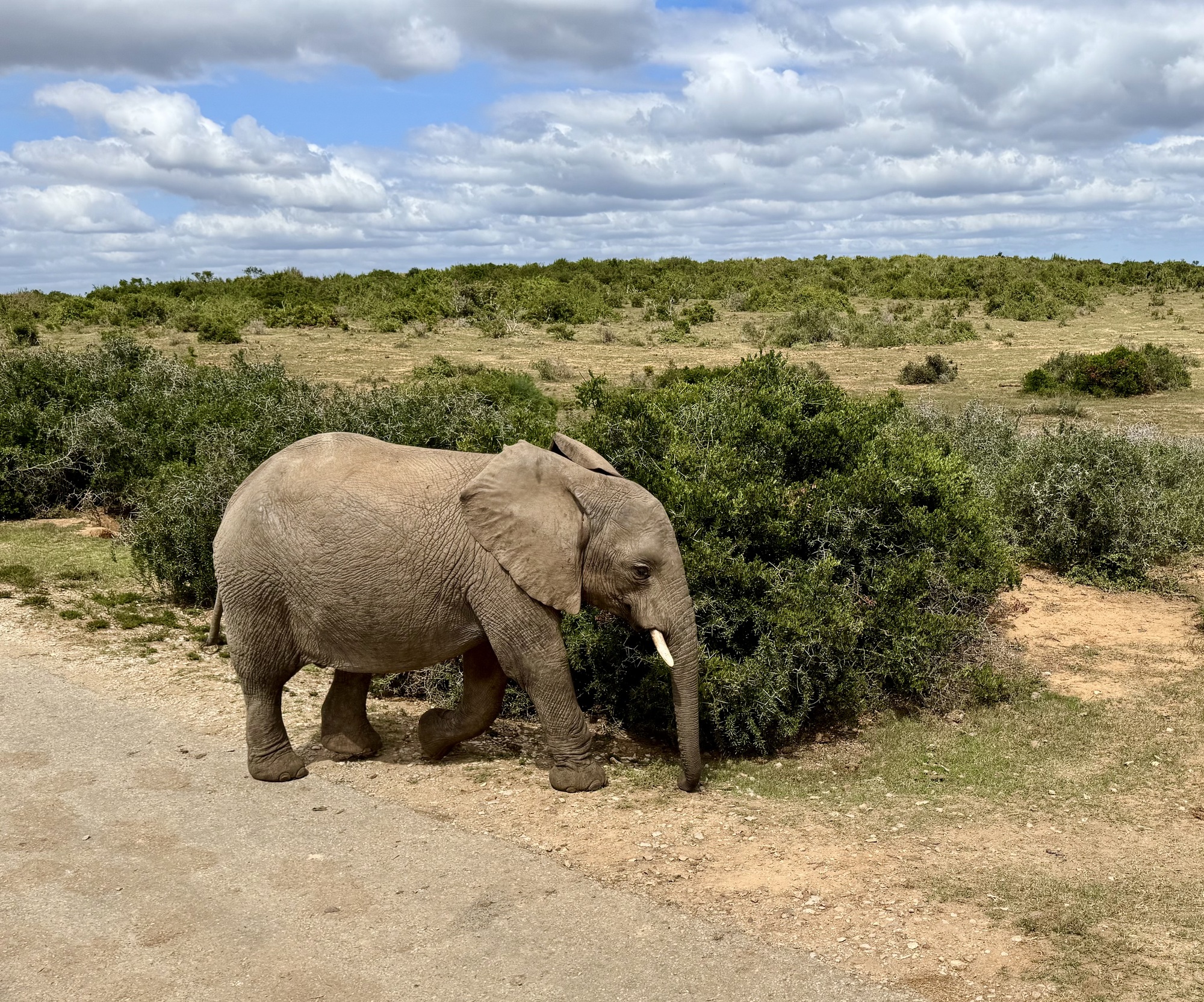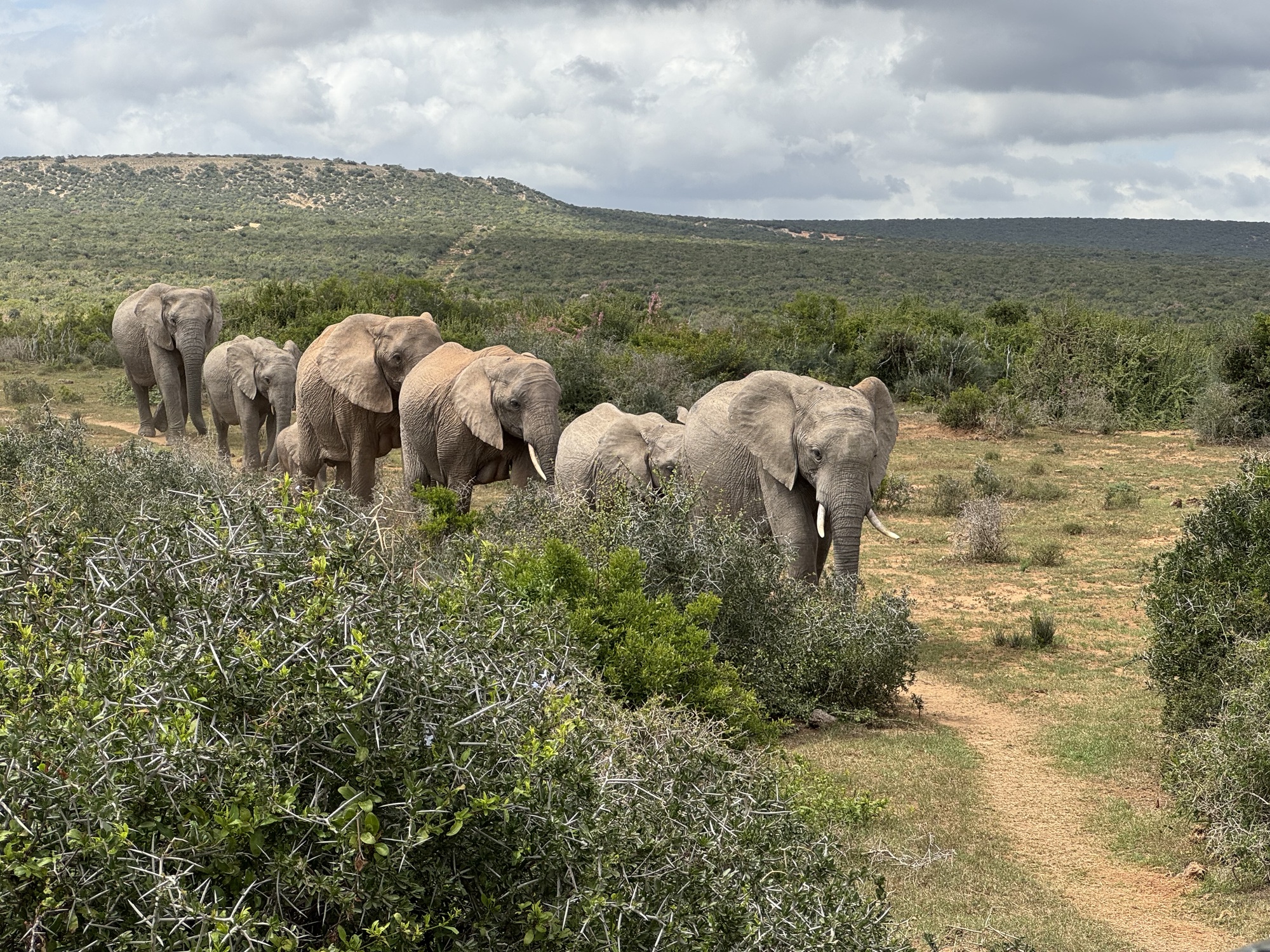 Our day started with an amazing visit to the Addo Elephant Reserve. Over 2 hours we saw elephants, wort hogs, zebras, secretary birds (which are rare to see), meerkats and yellow mongoose. Most of the elephants in Addo do not have tusks. It is an adaptation from inbreeding to prevent poachers from killing the for their tusks. The ones with tusks have been introduced from Kruger NP to expand the gene pool. When the park started they had only 30 elephants now there are over 700. After the visit we had a 2 hour drive that was no fun but then we finally got on our bikes for an easy shakeout ride on tarmac and gravel. Tonight we are in the Tsitikama national park.