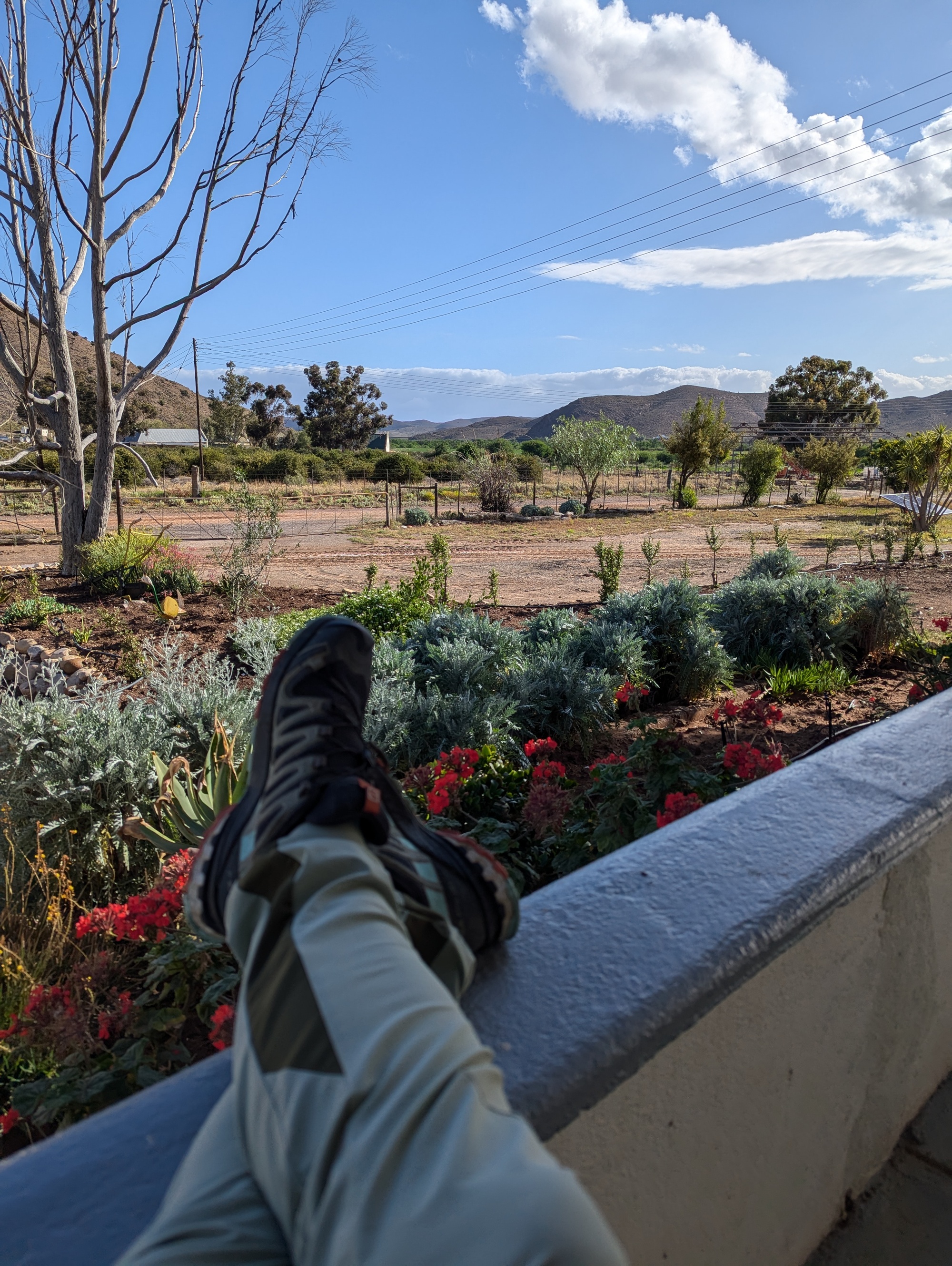 The forecast was right. It rained most of the night and then most of the day Monday. Hard enough and long enough that we weren't going anywhere. Our marvelous host, Michelle, offered to pick up some food for us in Ladismith to stop us running out. So we did what you do when you're stuck: eat all day.