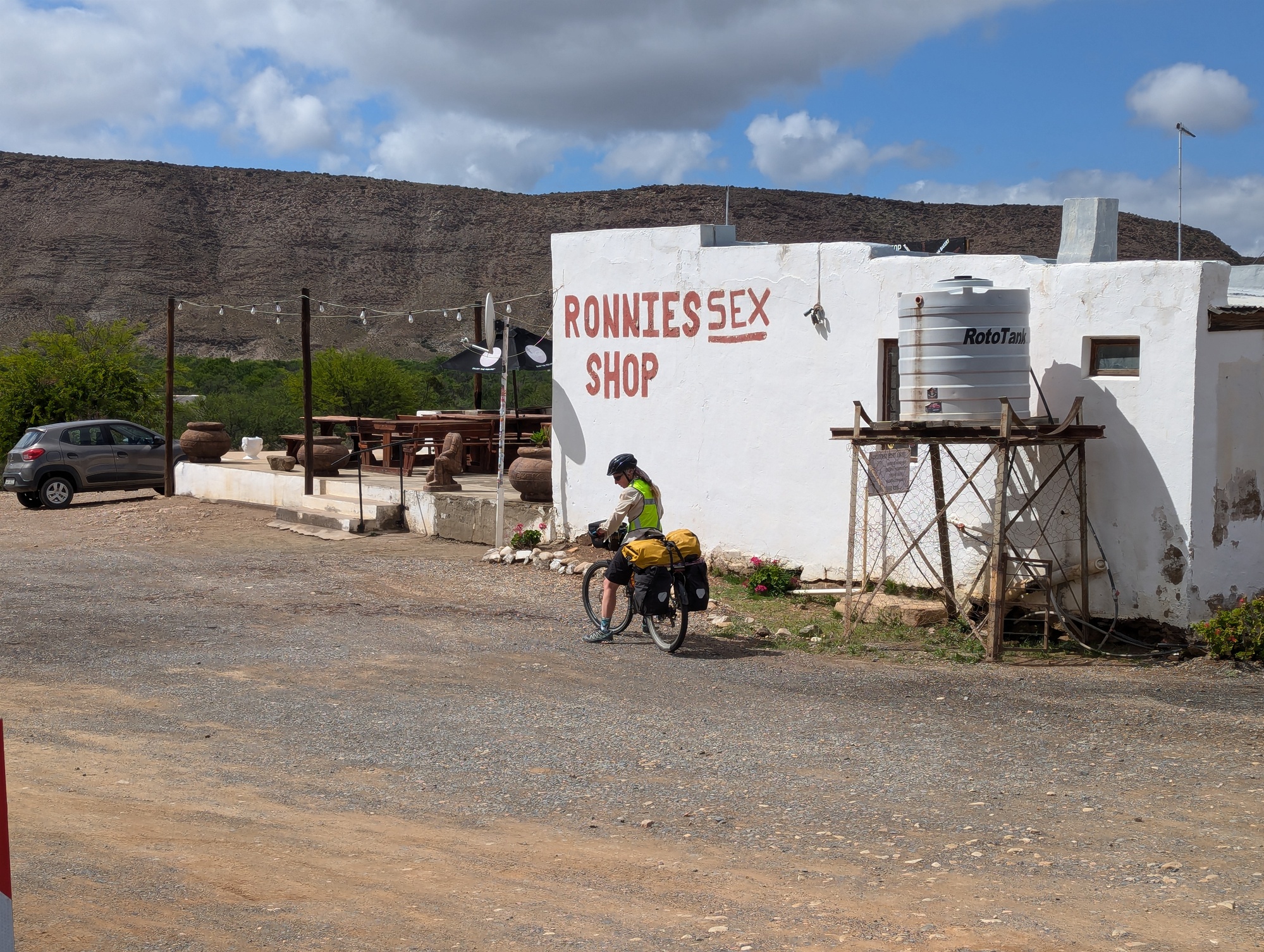 We have been setting out early most mornings, half on purpose (the wind is weakest in the morning and who knows from which direction it will blow in the afternoon) and because the sun comes up and the birds start chirping before 5am at this time of year. This put us at Ronnie's Sex Shop by 9:30am. A little too early for a milkshake. We were at first a bit surprised to have Ronnie's Sex Shop the landmark of choice used by a religious man describing to us the way to some hot springs. But, it seems this shop, the sign of which was vandalised by the owner's mates to include the word sex, is actually a pub, in a place where there isn't too much else. Pretty good marketing, pretty good land mark. But alas it was too early for us and so we pushed on to Barrydale.