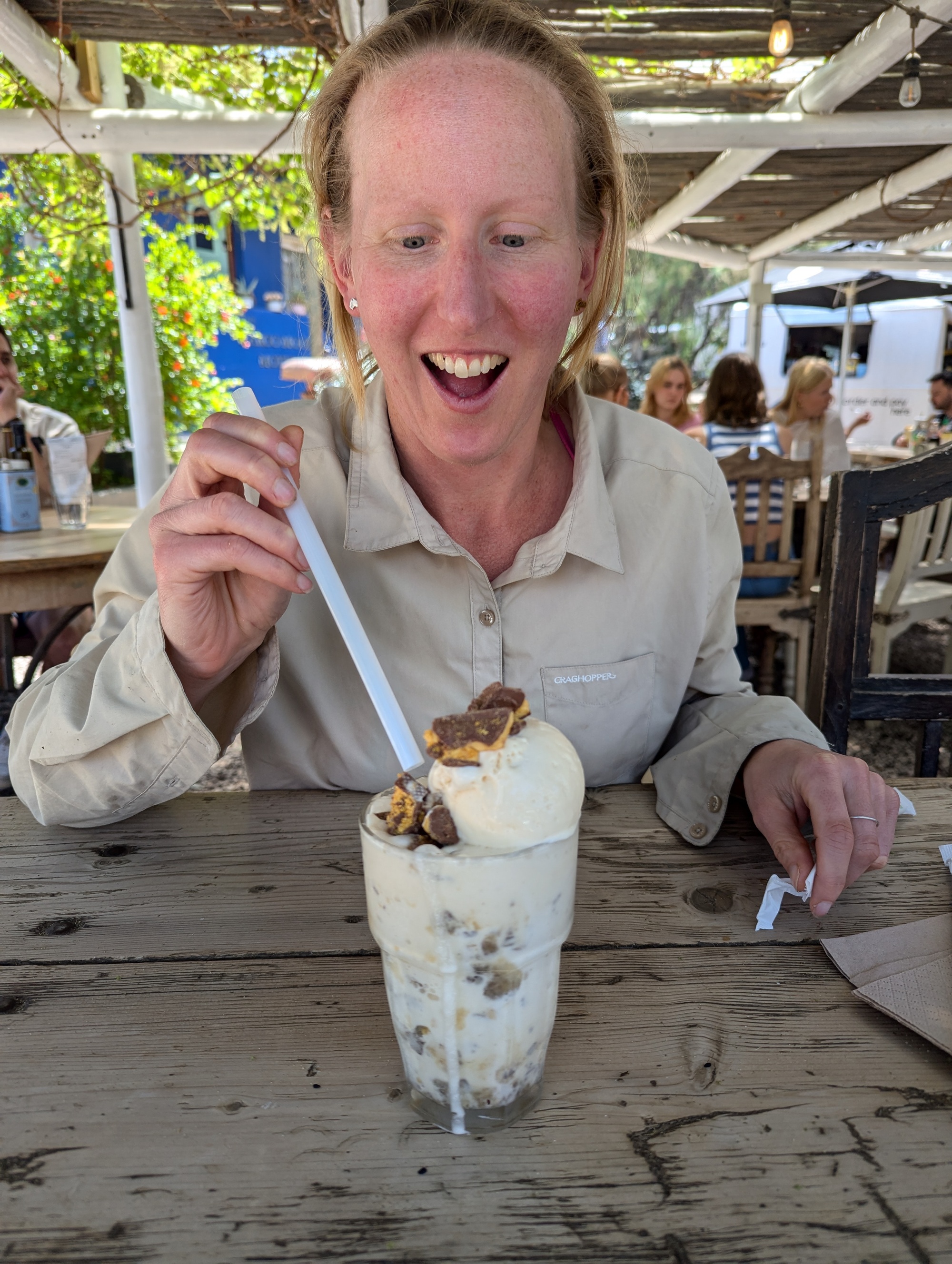 On rolling into Barrydale, Cath ended up with regret over skipping the milkshake at Ronnie's Sex Shop so stuck her lip out, quivered it a bit, and Stevo suggested stopping at a cafe up the road. Soon after we were devouring burgers and what can only be described as an "icecreamshake" (there wasn't much milk), and a message from Amanda arrived saying that someone has seen us on the road, taken a picture, sent it to Connor, who has sent it to Amanda, who has sent it to us, we have replied back saying it's us - yay. Amanda has messaged Connor and then we have a conversation with Connor, through Amanda, to find out he is down the road getting fries. Enter Connor.