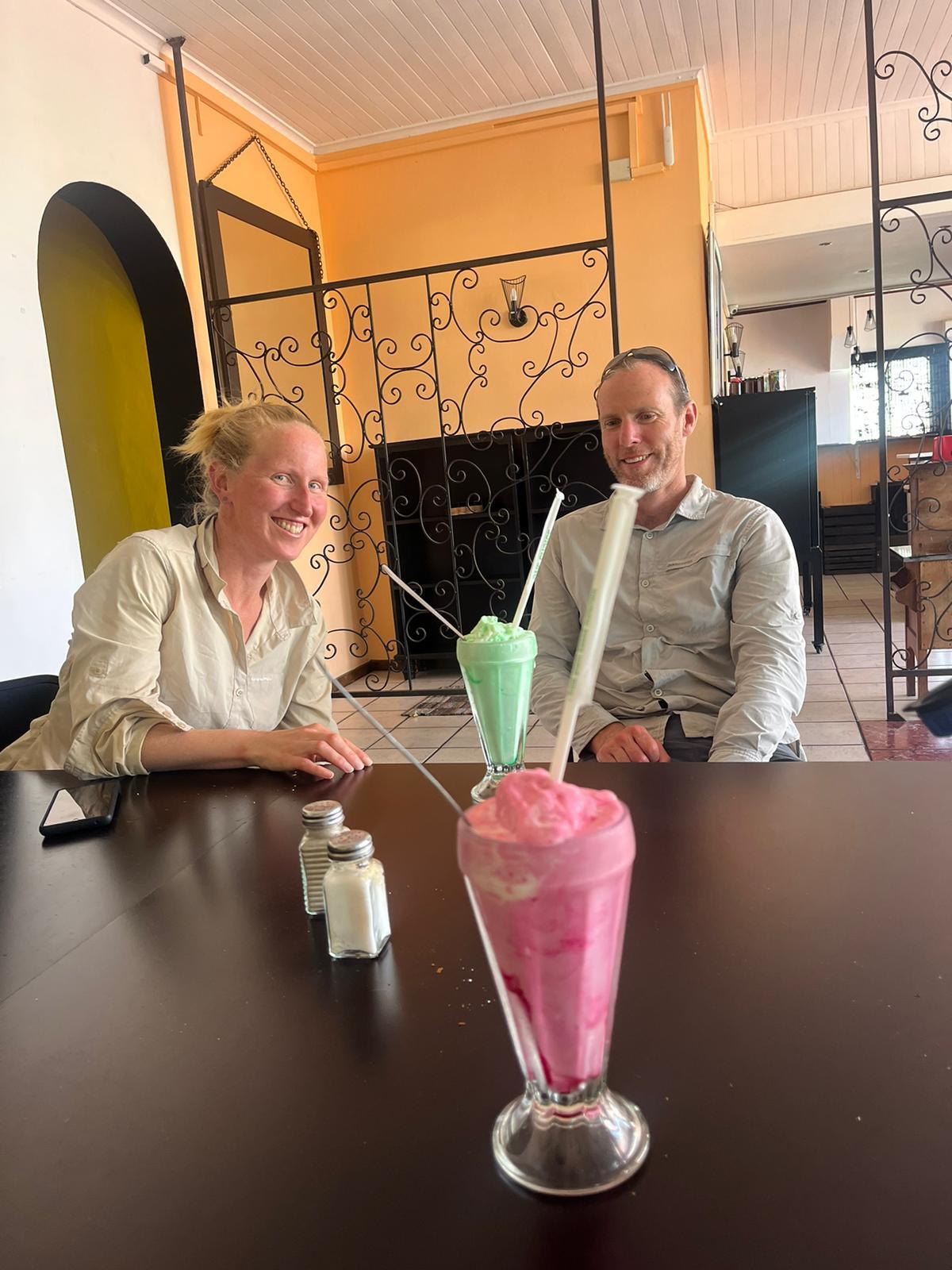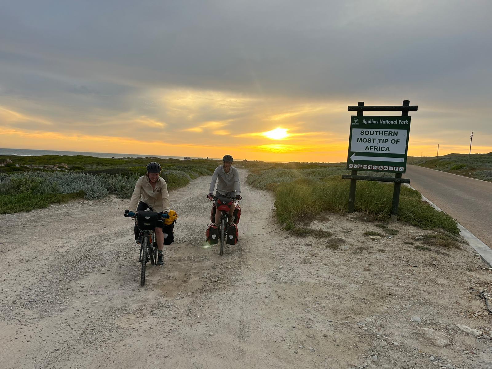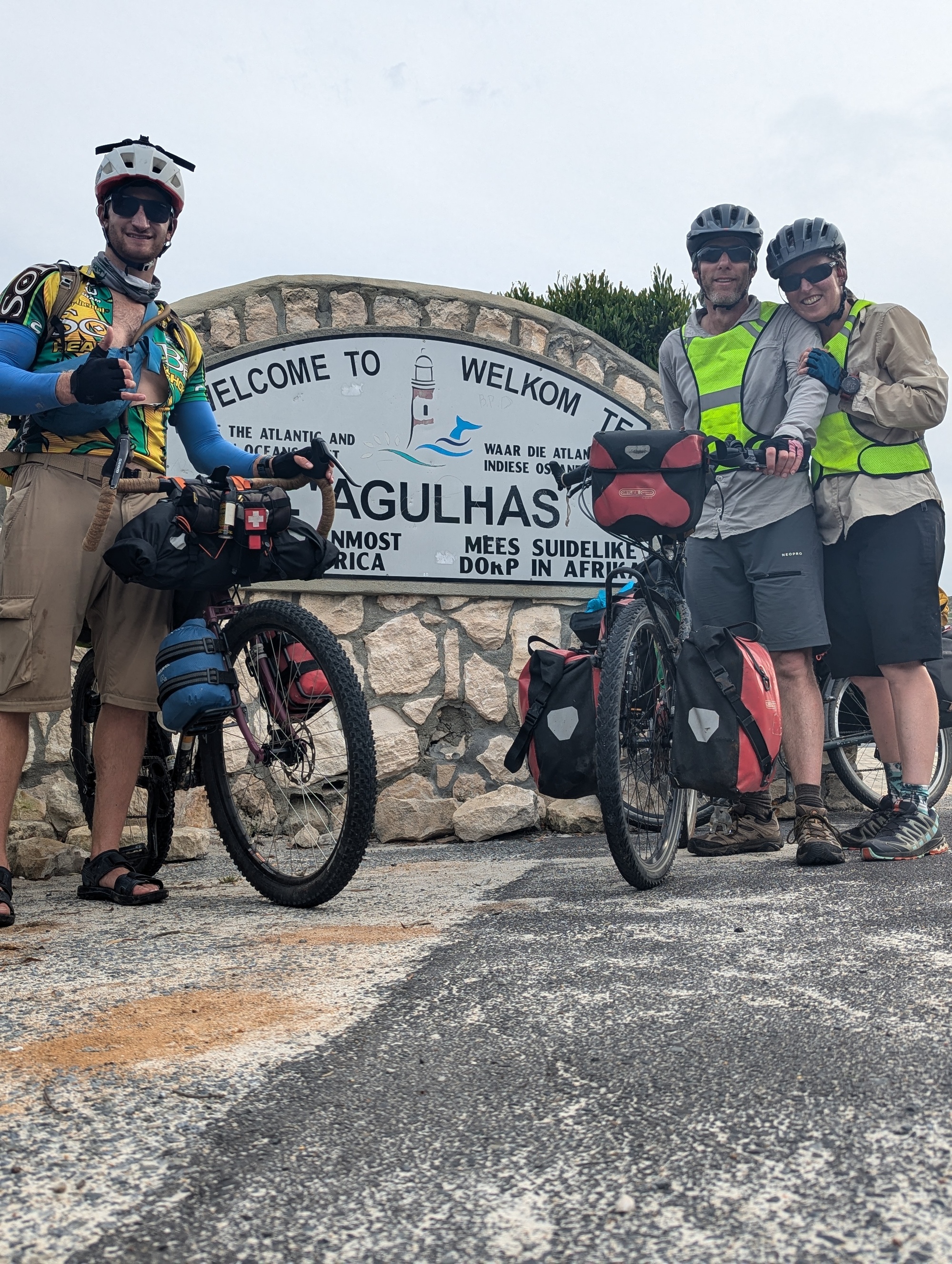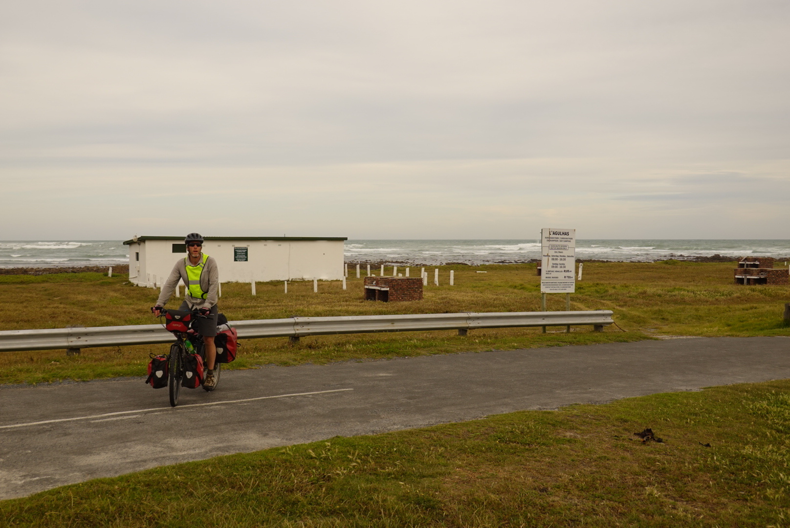 Lunch was had in Bredasdorp while we waited for the heat of the day to pass, and the southerly to build. Four pizzas (Connor can eat!) and another milkshake fueled us for the last push into the wind to L'Agulhas: the southern-most point in Africa.