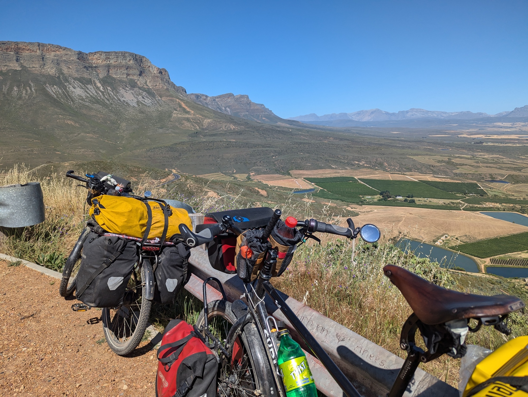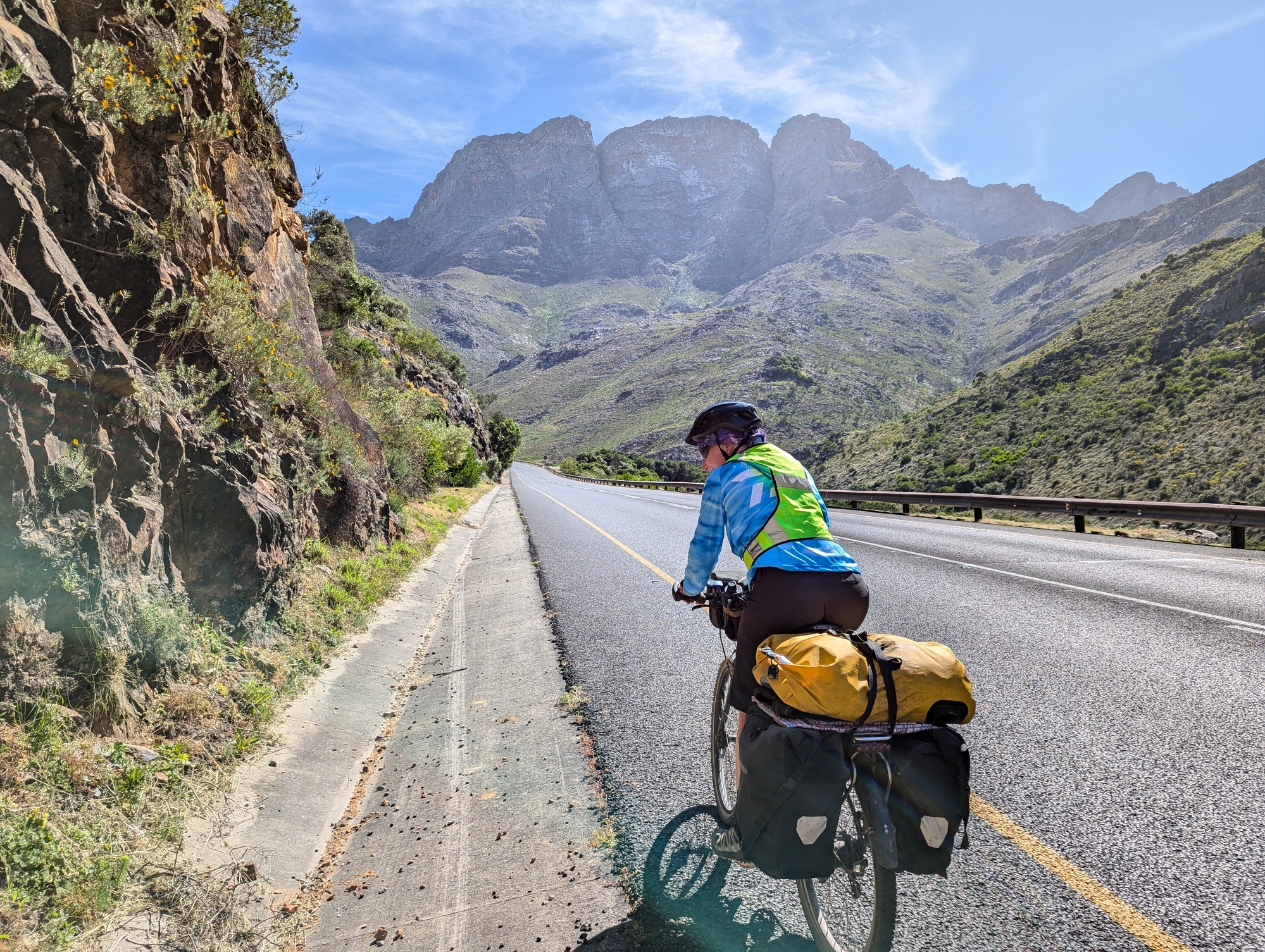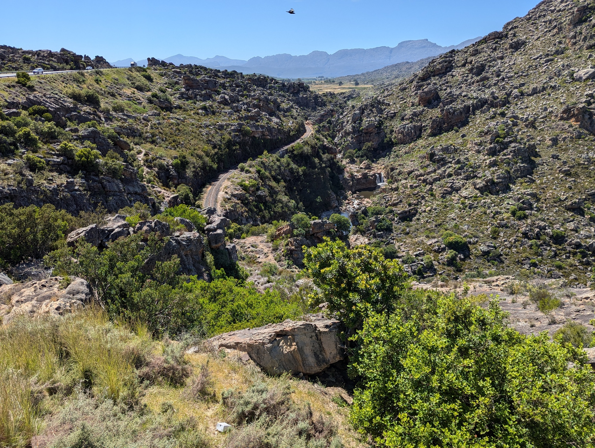 We left Amanda's house relatively early hoping to take advantage of the tail wind. Rolling hills into Stellenbosch and plenty of morning commuter traffic. Great road surface, lots of grapes and some mountains in the distance - this could be northern Italy (or another of the many wine growing regions). The traffic cleared up as we crossed the N1 and we stuck to the wide shoulder of the R44 into Wellington. Stopped for some lunch at a supermarket, then attacked the gentle climb of the Bains Kloof pass. We didn't expect such a nice climb (on perfect asphalt) or a dramatic gorge on the other side. Glad we were recommended this road (R301 out of Wellington).