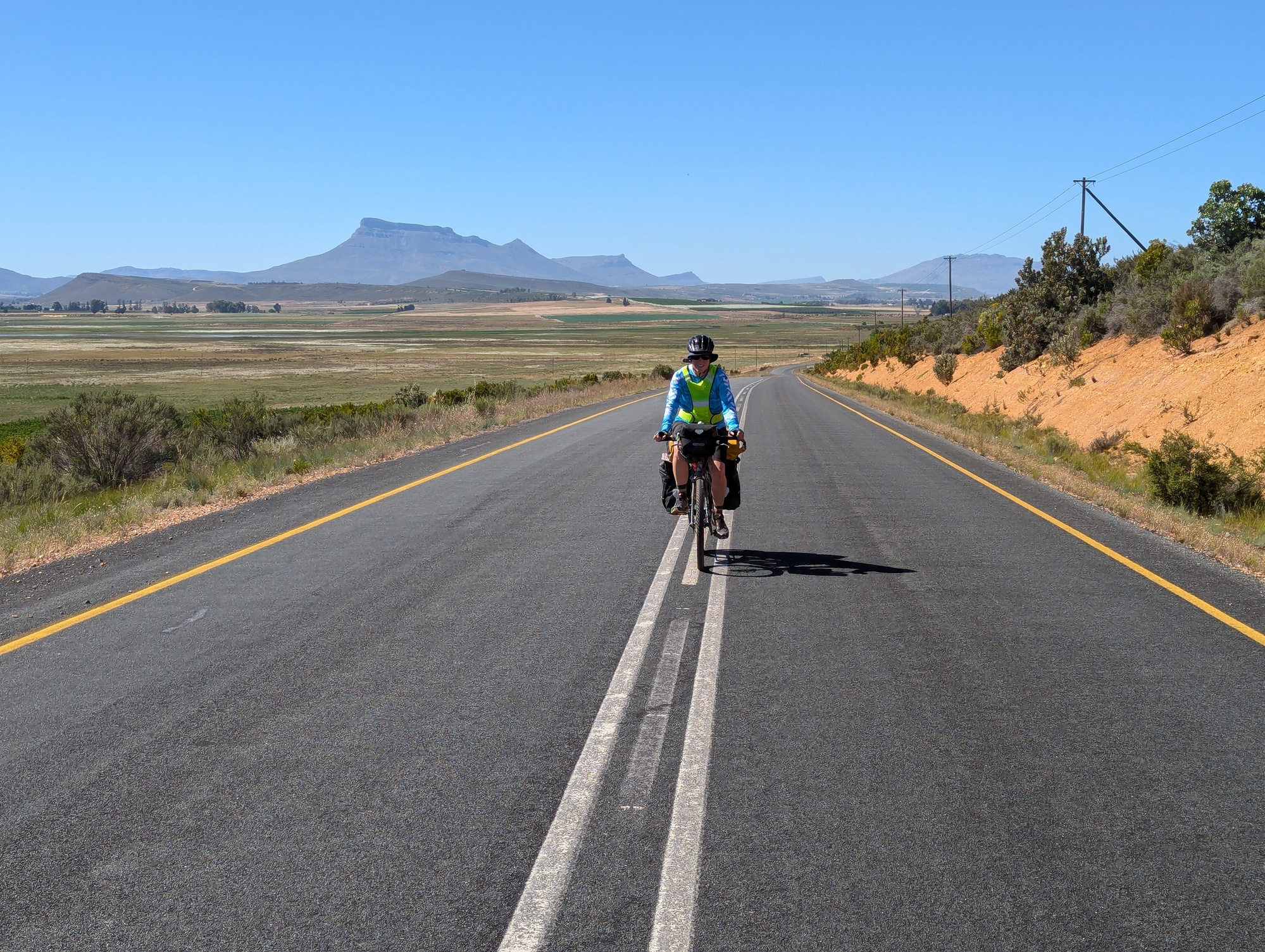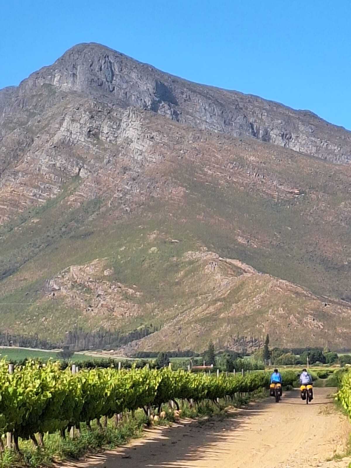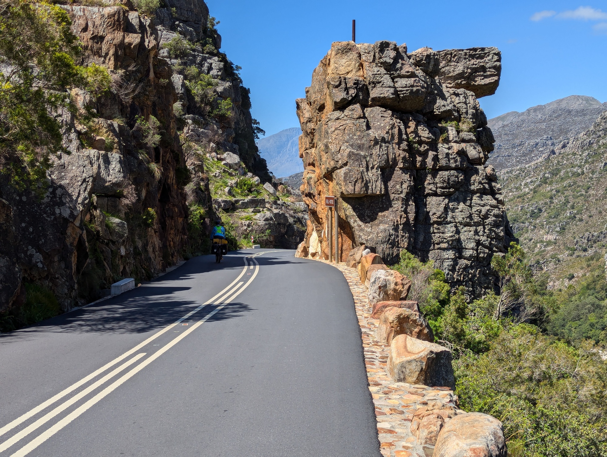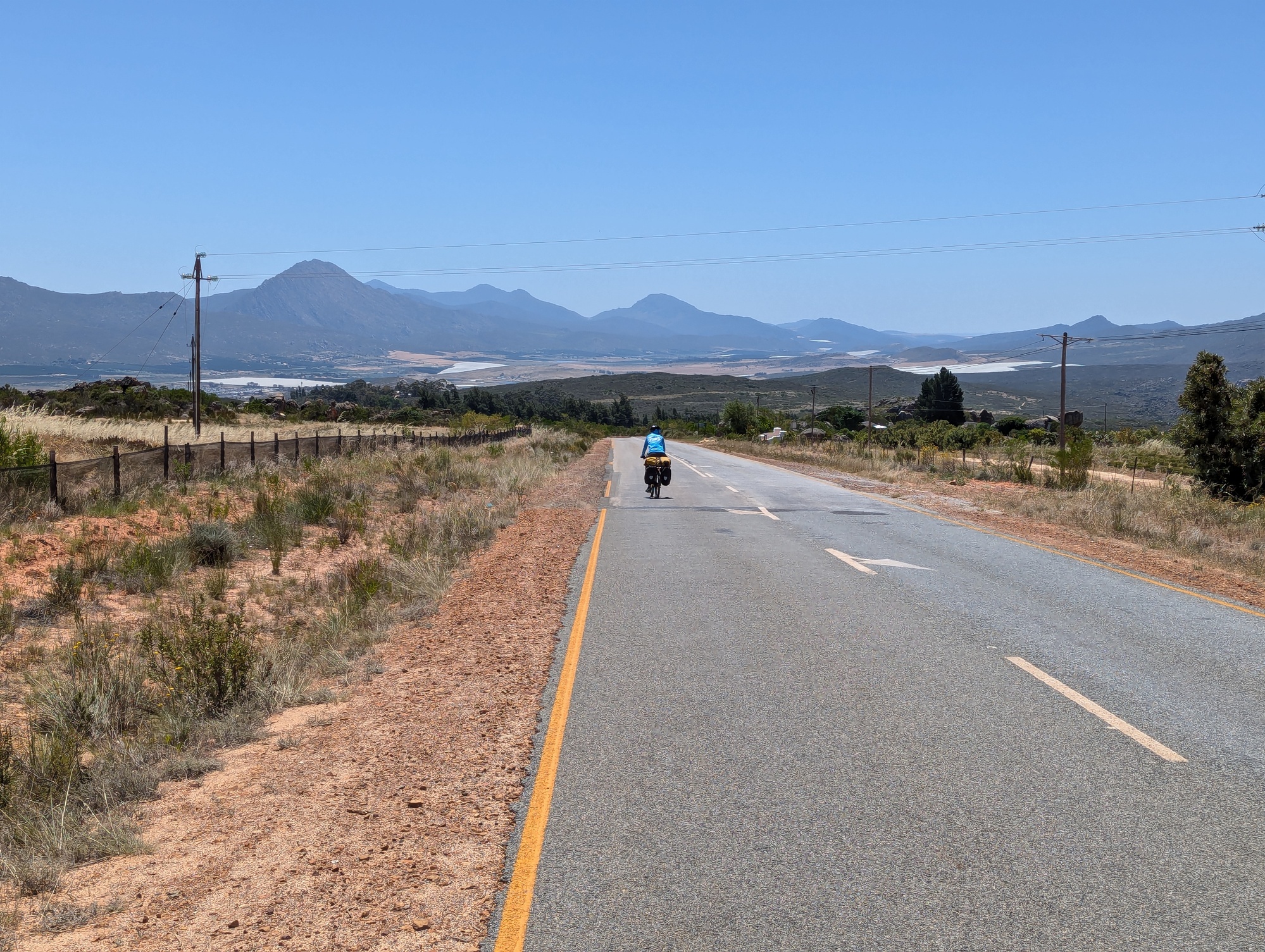 We left Amanda's house relatively early hoping to take advantage of the tail wind. Rolling hills into Stellenbosch and plenty of morning commuter traffic. Great road surface, lots of grapes and some mountains in the distance - this could be northern Italy (or another of the many wine growing regions). The traffic cleared up as we crossed the N1 and we stuck to the wide shoulder of the R44 into Wellington. Stopped for some lunch at a supermarket, then attacked the gentle climb of the Bains Kloof pass. We didn't expect such a nice climb (on perfect asphalt) or a dramatic gorge on the other side. Glad we were recommended this road (R301 out of Wellington).