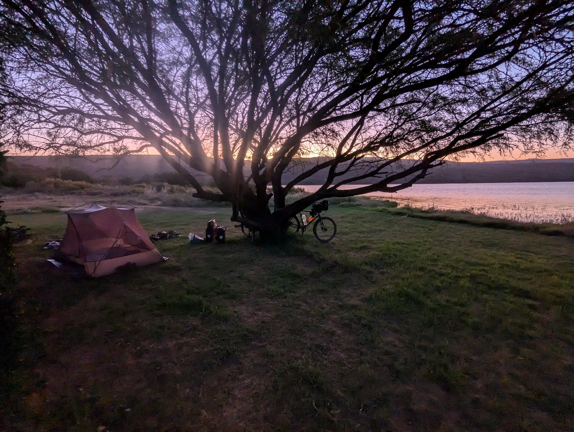 Flanked by apple orchards we rolled down the road toward Op Die Berg. Having climbed out of Ceres at about 2pm, the hottest time in the day, we were a bit hot and bothered on arrival. The supermarket delivered cold drinks and ice blocks. A luxury we are unlikely to have in a week or so.