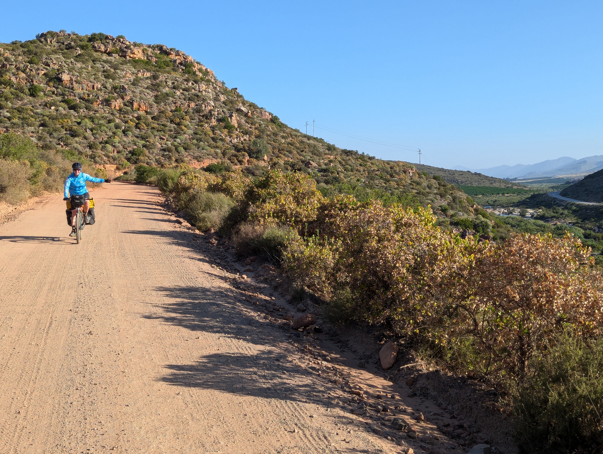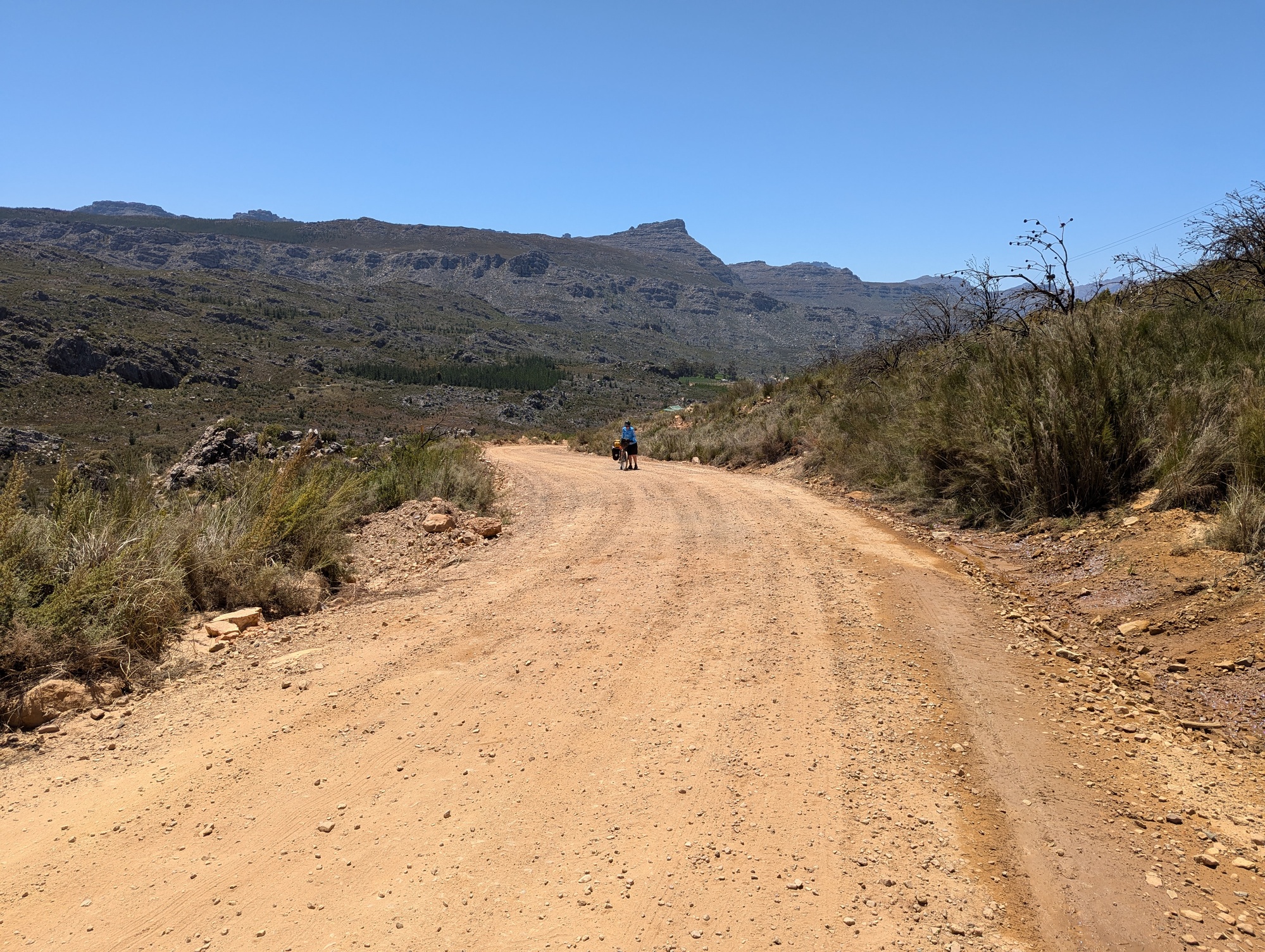 Instead, we rode up the road to Op Die Berg, up the valley over a pass and down into Citrusdam. Despite not having planned this route, the valley was lovely. It was a great ride. Hopefully better than the alternative straight up the highway. The pass was dirt though - making it significantly harder, but keep a lot of the cars, and all of the trucks, away.