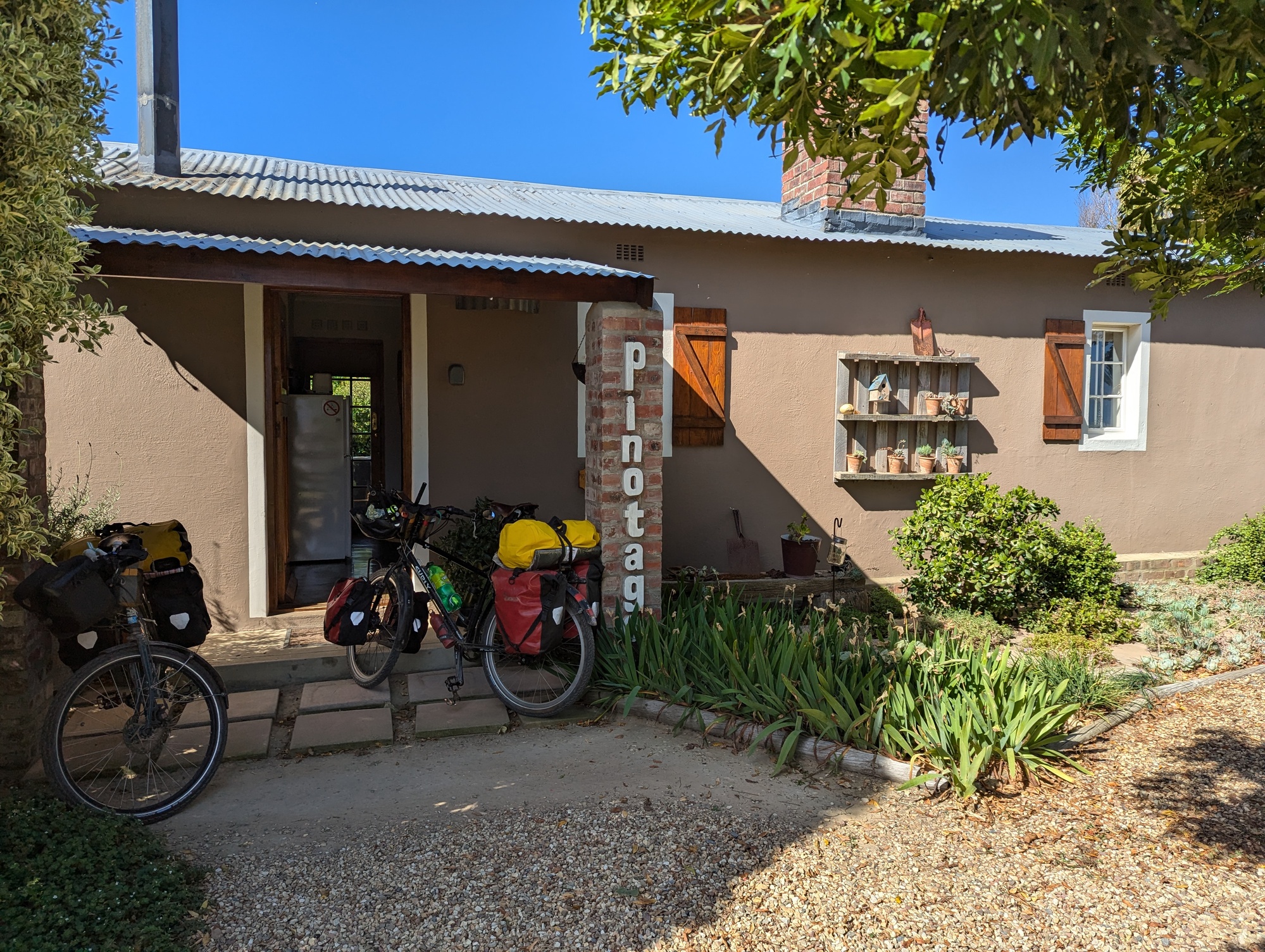 This took us down to Breerivier, and the 7 Oaks Winery. A WarmShowers host. Patrick was out of town, but Jacqui and Willem (property manager) prepared one of the cottages they usually rent out to guests for us to stay in. It's a lovely little cottage, with a hot tub and a grand view of the Waaihoekberge mountains to the east. The mountains caught fire as the red light from the sun setting hit them. We're very lucky to be able to stay here for the night!