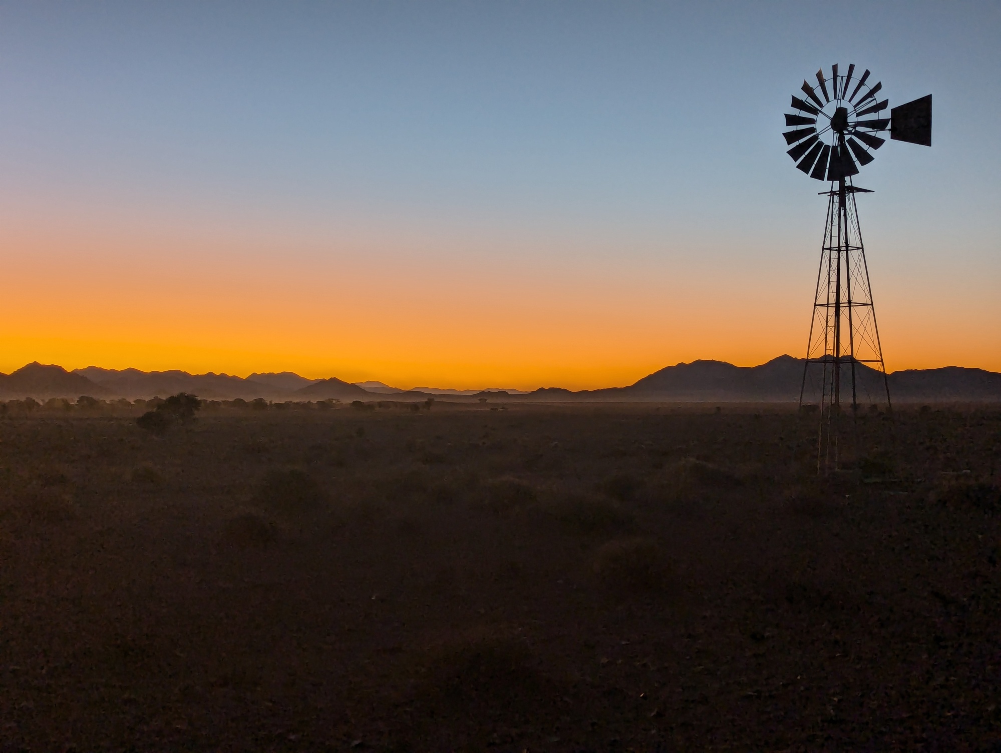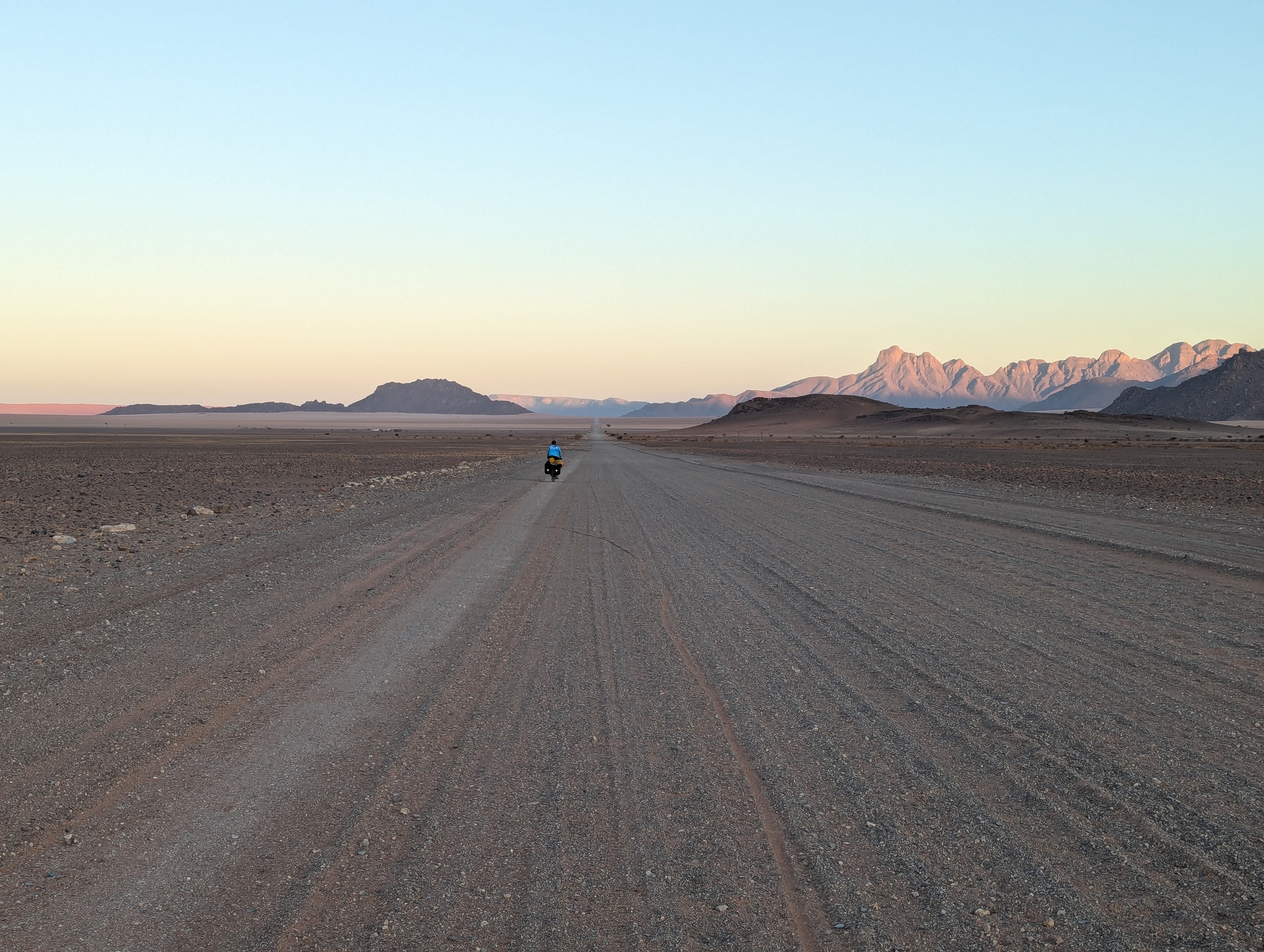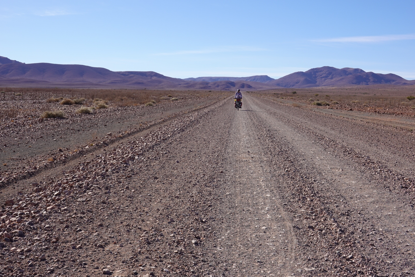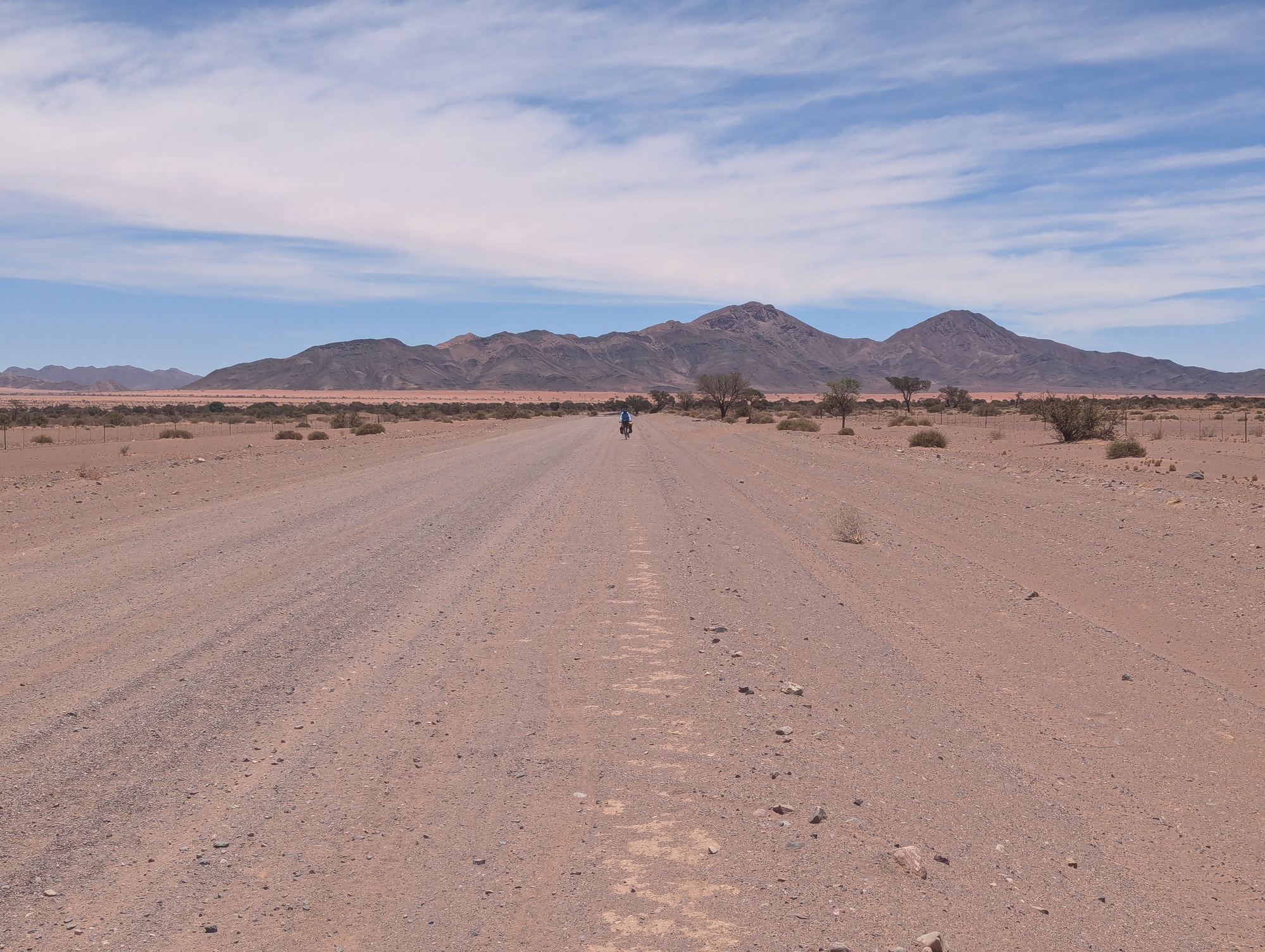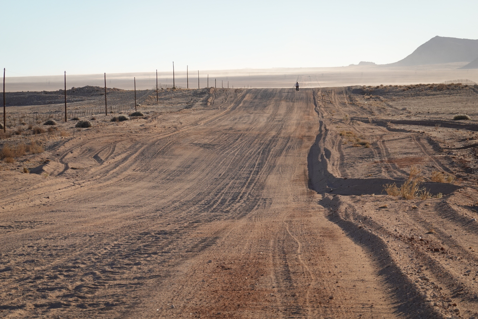 The little villages shown on the map are spaced about 100 km apart on the road – villages that get smaller and smaller, until they’re basically a petrol pump outside of a farmhouse (at Betta). To get a jump on the first 100 km stretch to Helmeringhausen, we left late in the day to avoid the worst of the heat and started down the dirt.