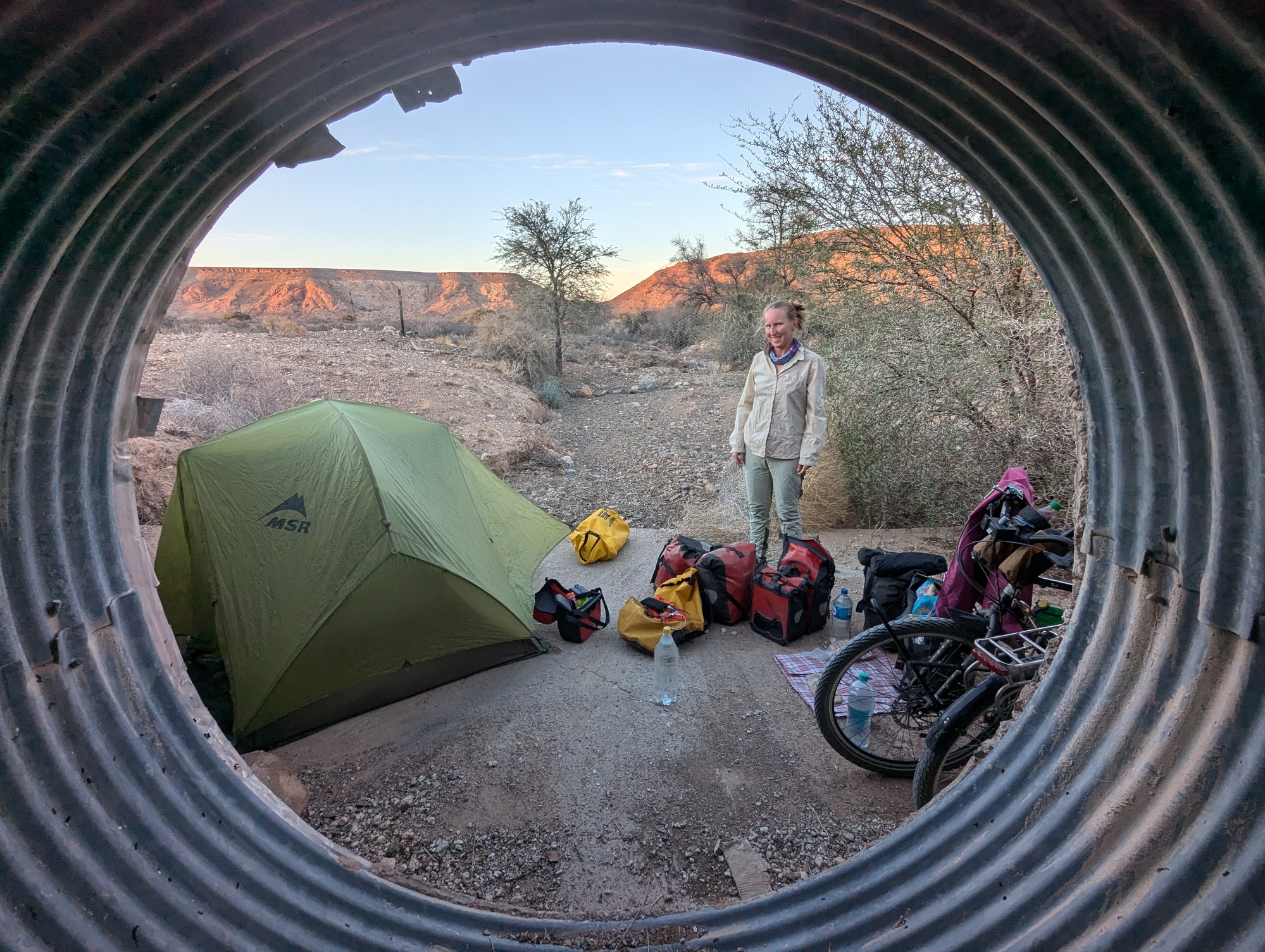 The first few hundred meters were smooth as asphalt. We had a ridiculously strong tail wind, and we were going downhill. And a few km later, we were pushing our bikes through a sand patch (fighting to hold the bikes in the wind). Long story short, we fought through soft, corrugated road for about those forecast 40 km. We saw the grader working on the road the next morning – it was far less corrugated where they had been, but still soft. Yuck. We survived that bit.