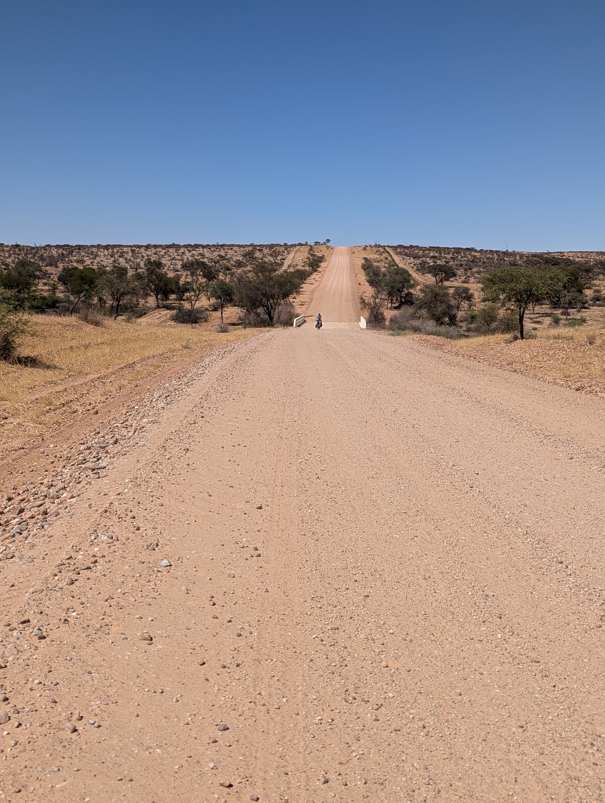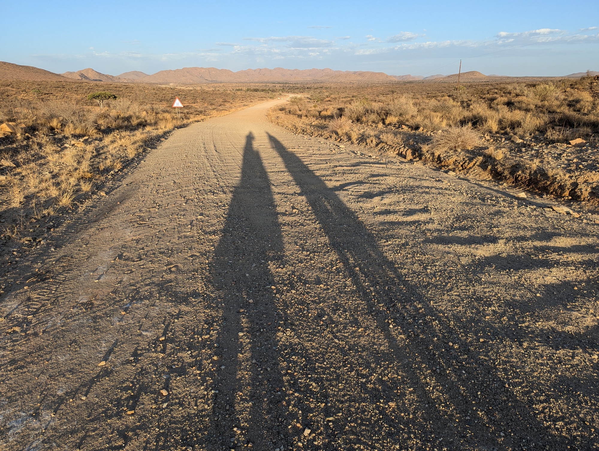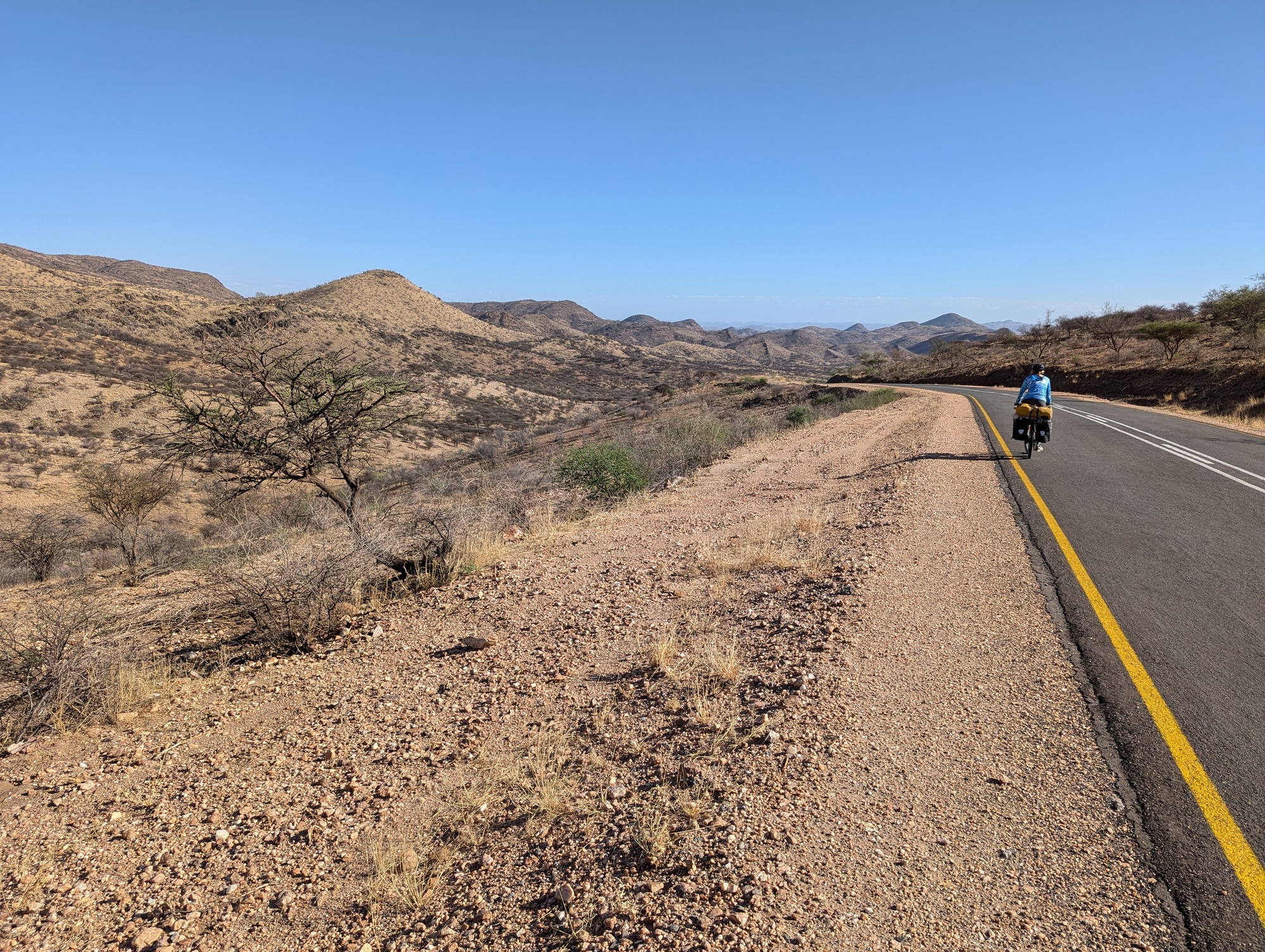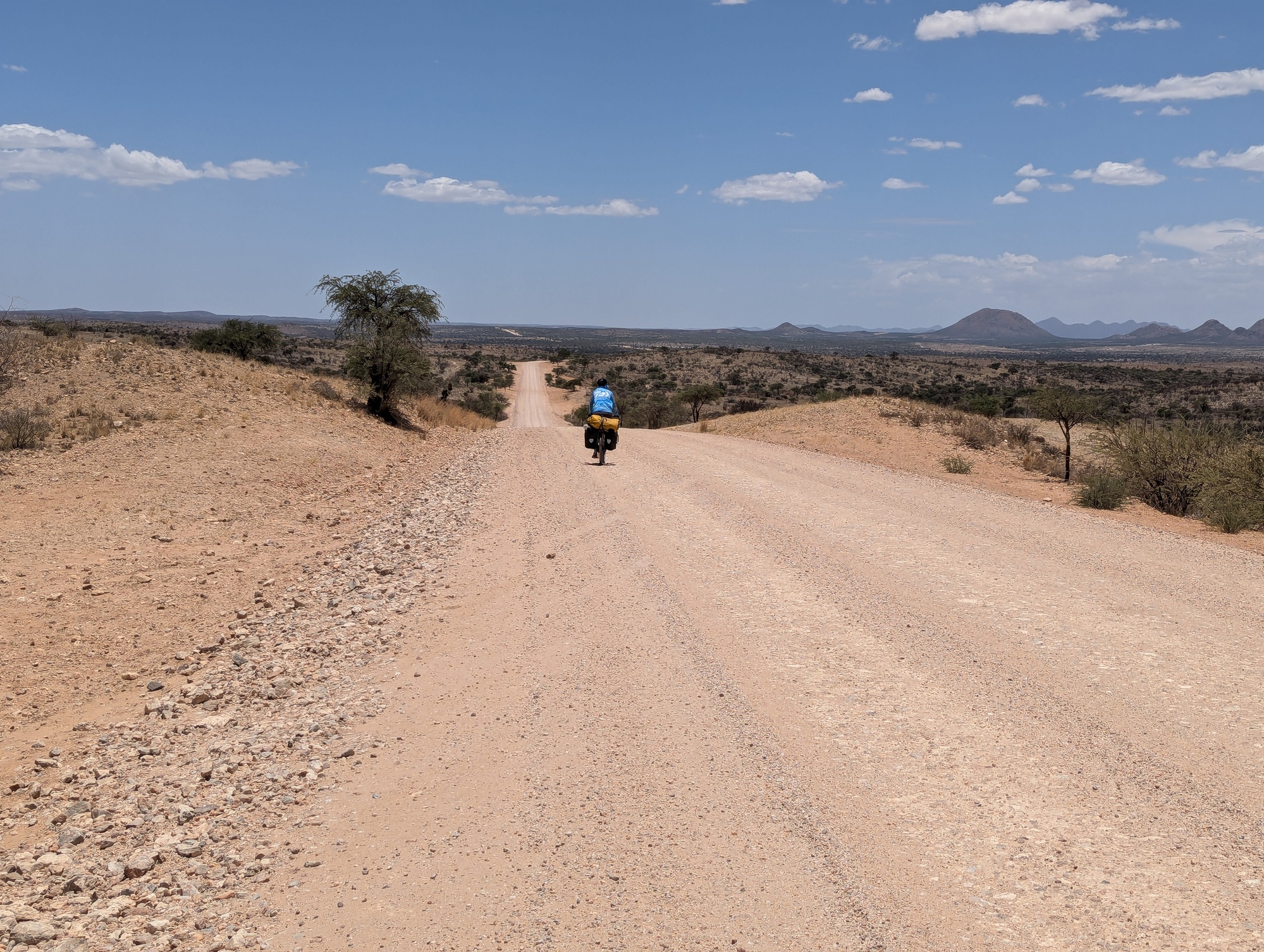 There was a small hill on the way to Solitaire. About 100 m of elevation over 5 km. It looked like nothing much on the map. It took 40 minutes (felt like longer). Quite dispiriting to look at the bike computer continuing to show 6 km/h while slogging up a sandy and bumpy road. In the sun.