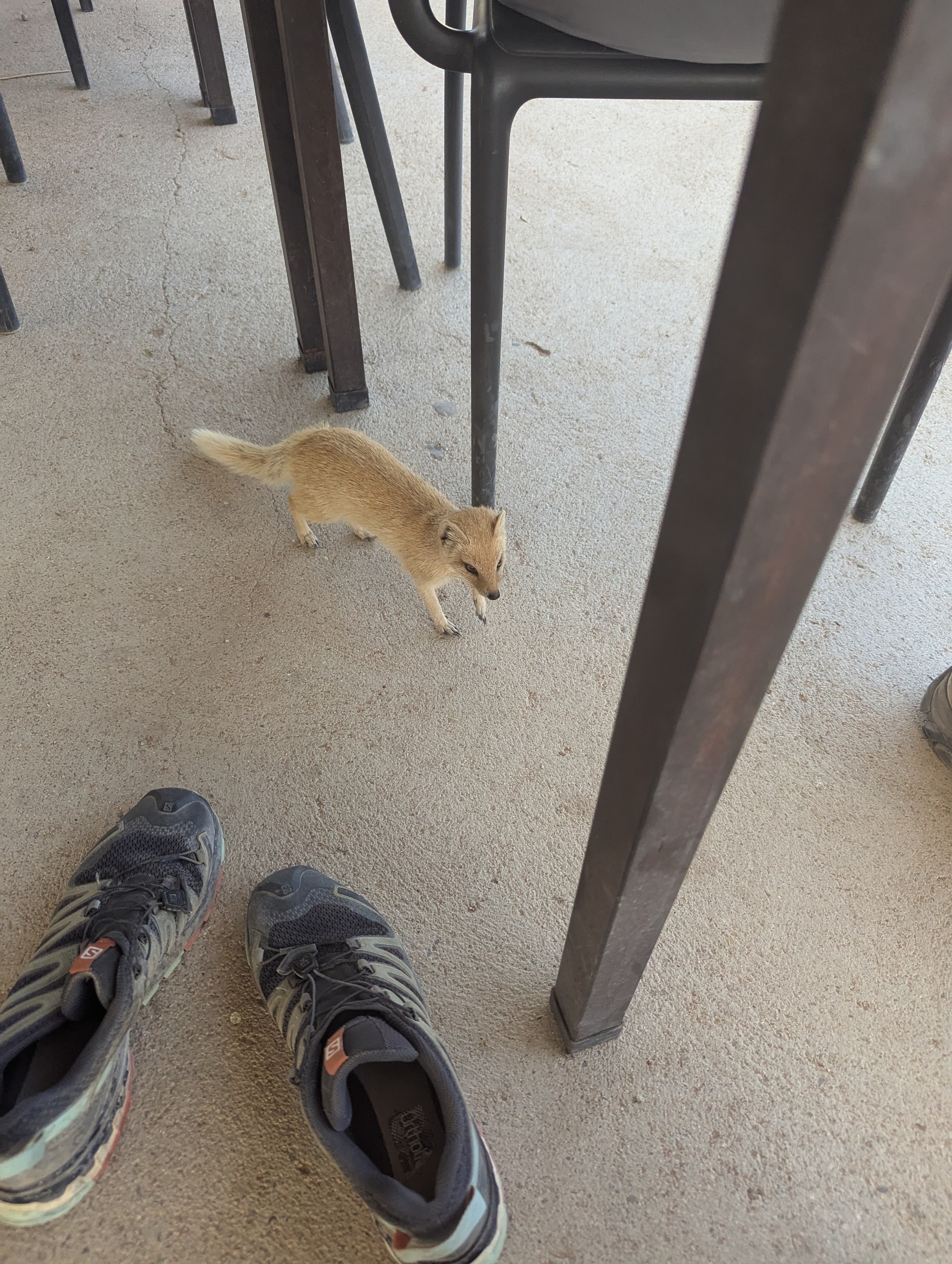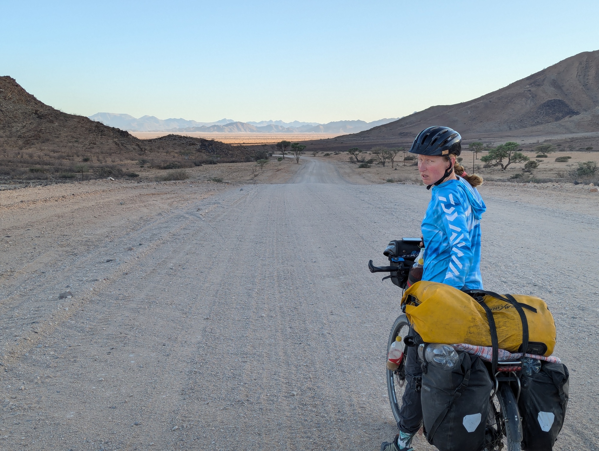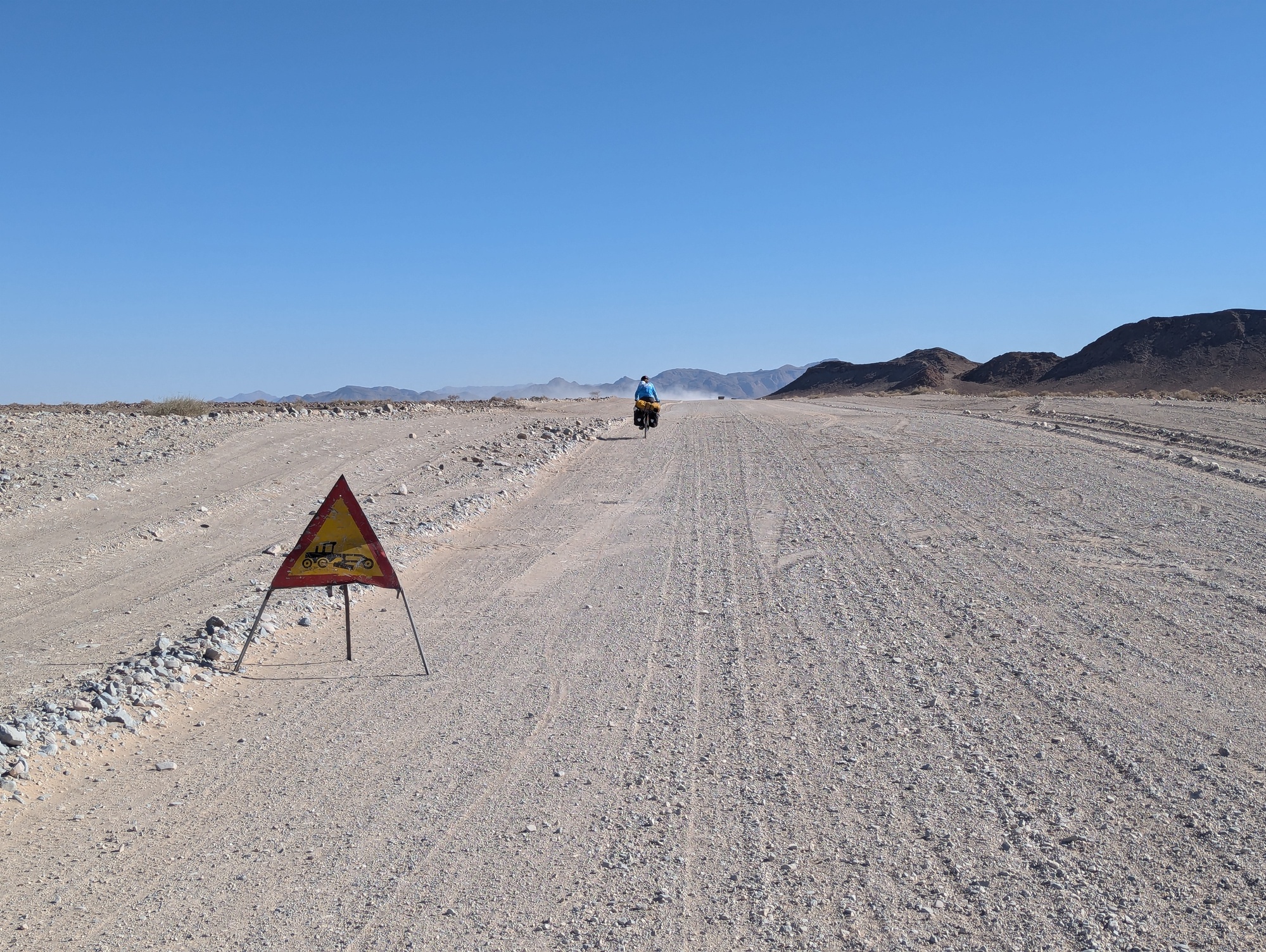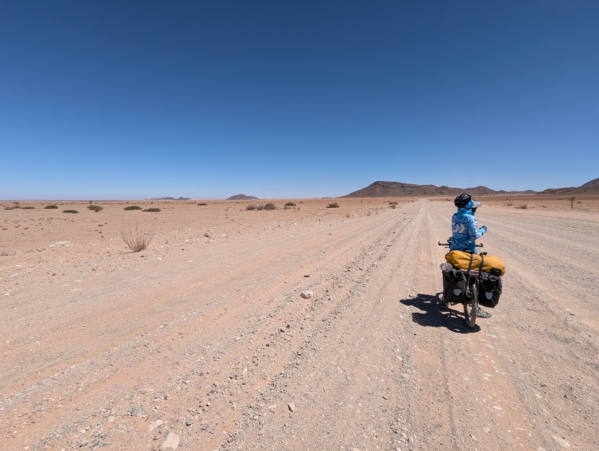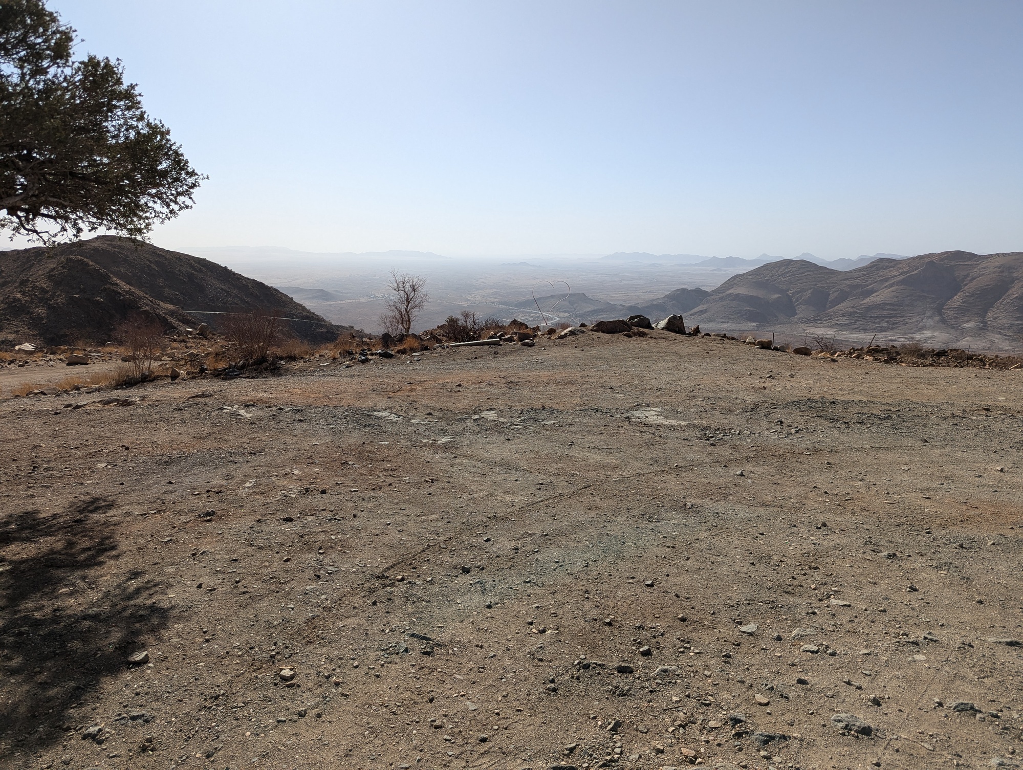 There was a small hill on the way to Solitaire. About 100 m of elevation over 5 km. It looked like nothing much on the map. It took 40 minutes (felt like longer). Quite dispiriting to look at the bike computer continuing to show 6 km/h while slogging up a sandy and bumpy road. In the sun.