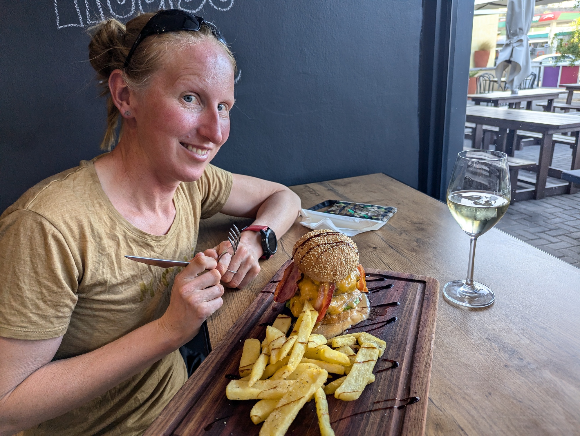 Not a lot of water available for a 100 km stretch, so we filled up at a farm house and did that stretch in a long day. At least it was flat and the road hard (if bouncy). No breaks to avoid the heat today – not sure why, something to do with it being Cath’s birthday and she just wanted to get to a place with shade and a breeze so she could relax, but it didn’t happen (although there were plenty of spots available if we’d tried).
