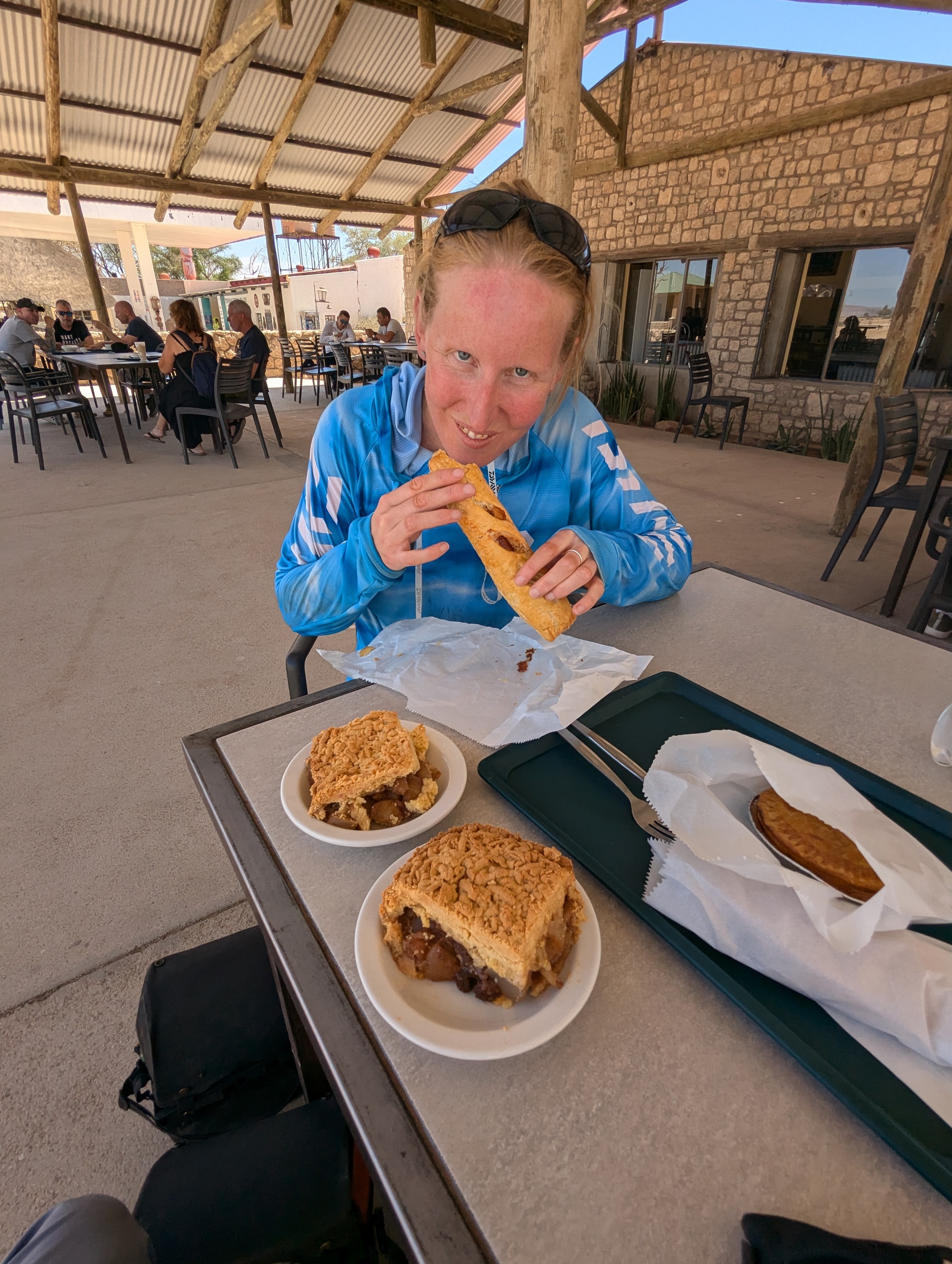The good news is the road got better as we approached Solitaire. Only 8 hours to ride 83 km. We had a plan to go on a little (make the next few days a bit easier). But after we ate everything left in the pie warmer at the bakery, and a couple of slices of (no-longer-Namibia’s-best-since-the-baker-passed-away) apple pie and had a snooze, it was getting late. We pitched the tent in the Solitaire campground and fell into the swimming pool.