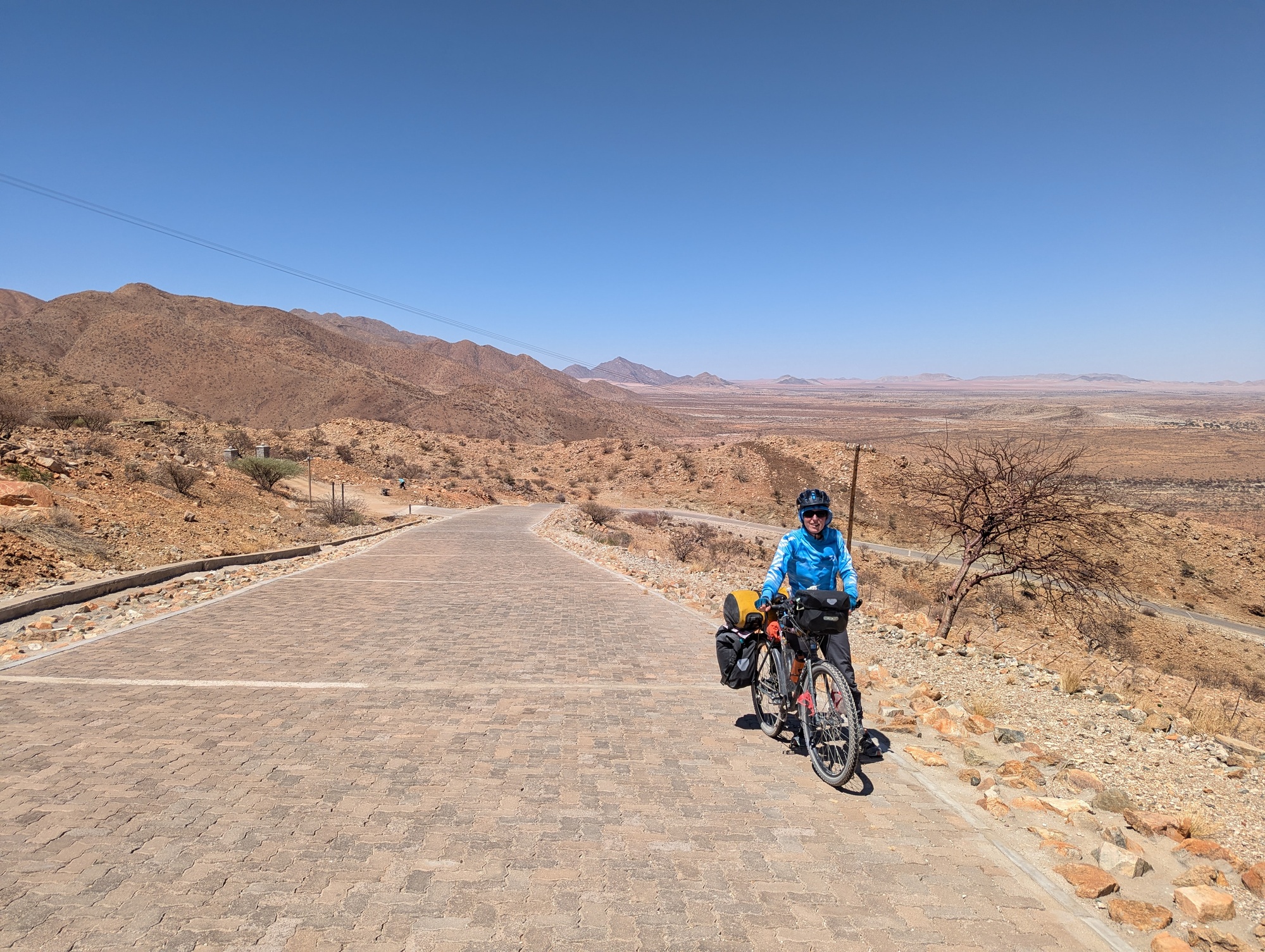 Another early day – aiming to beat some of the heat. It started ok on the road to Swakopmund, tail wind and all. Of course we turned off after 10 km, onto more corrugations. Then sand as well. And a side wind. The wind was the tricky one today. It picked up strength until we found we were being sand blasted by a hair dryer. It’s hard to ride side by side to shelter one from the wind when the road is chopped up – so we both copped it. Oh, and the pass. This road has a small pass (Spreetshoogte Pass) with a climb of ~450 m. That’s ok. The climb is only 4 km long. Apparently the max gradient is 22%. Thankfully the steepest part of the road is paved with bricks. Yeah, we pushed the bikes up that one – with a sleep when nearly at the top (there was a rest spot and a tree). We’d been told (by other cycle tourists!) that this way was quite pretty and should be easy enough. Ok, it was a pretty good view from the top. I don’t think I’d recommend going up that hill to a cyclist.