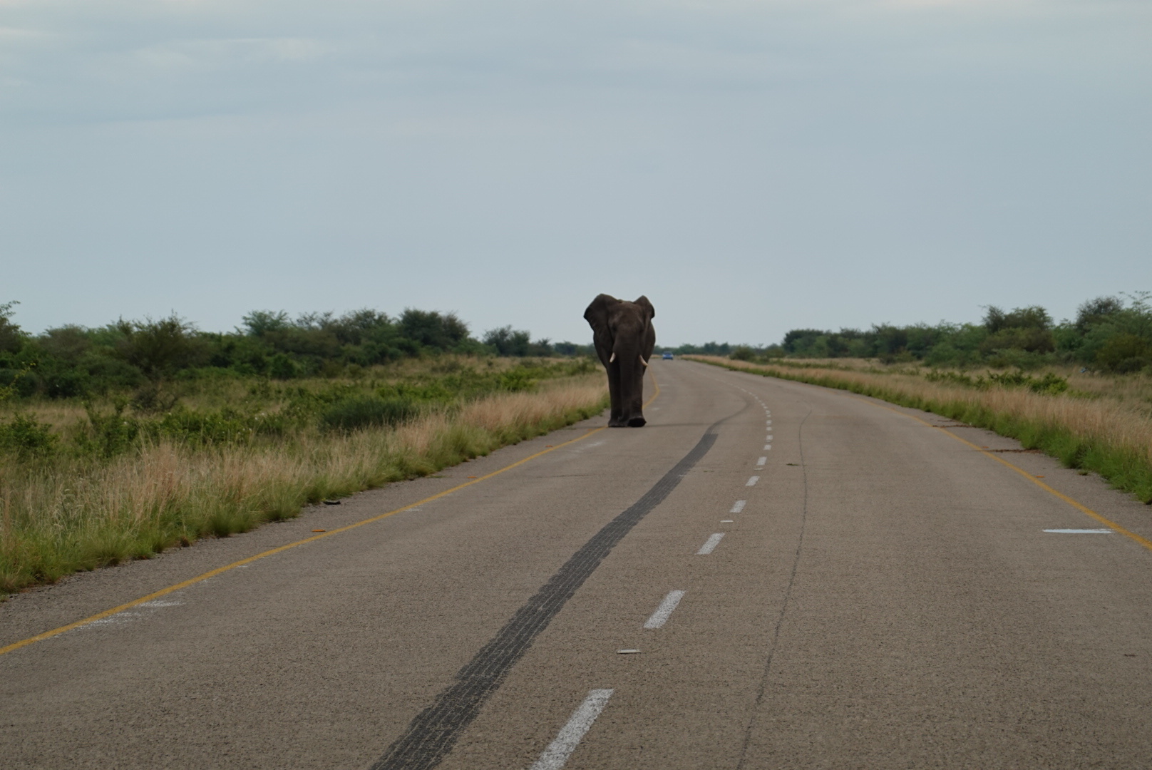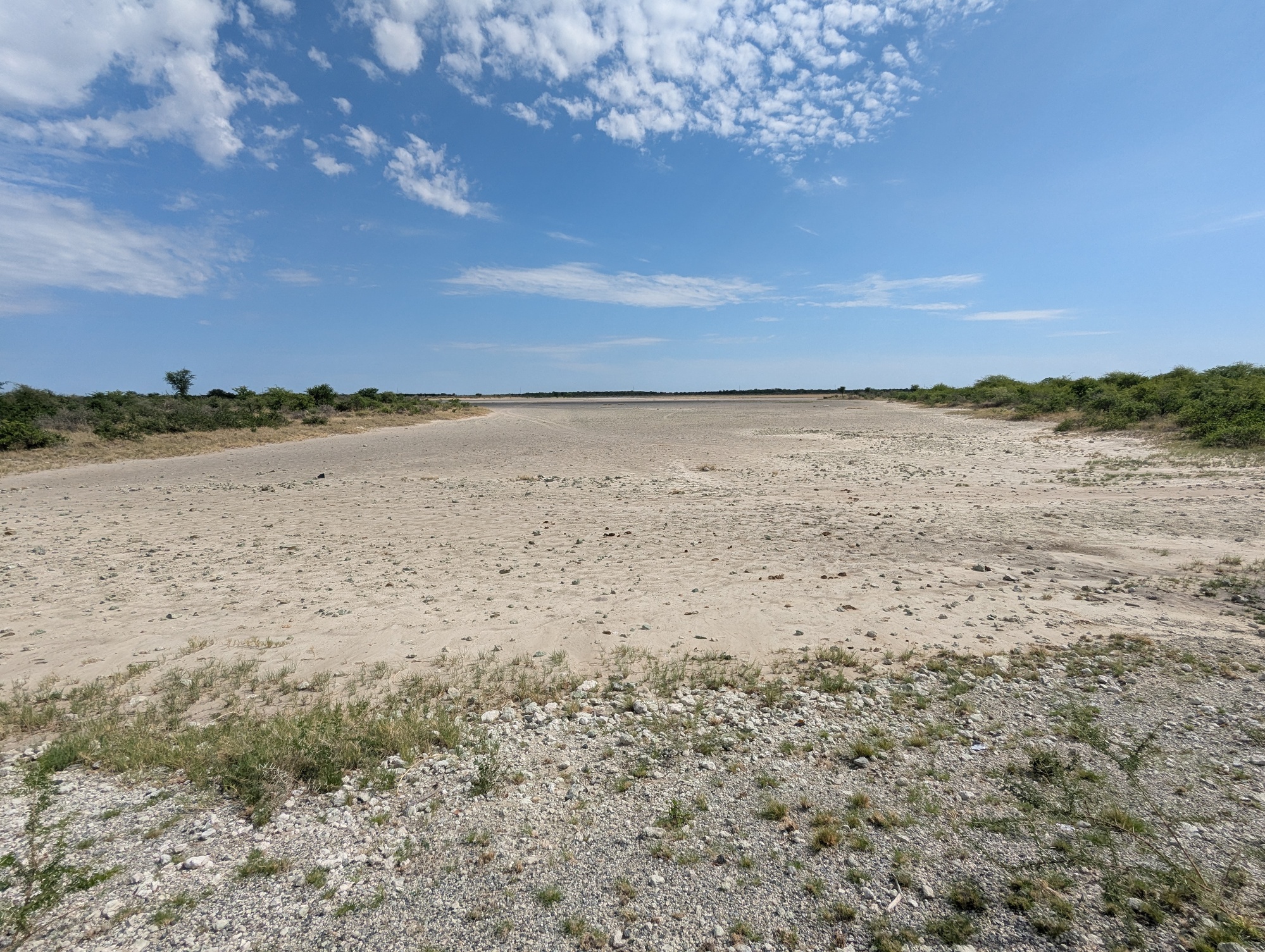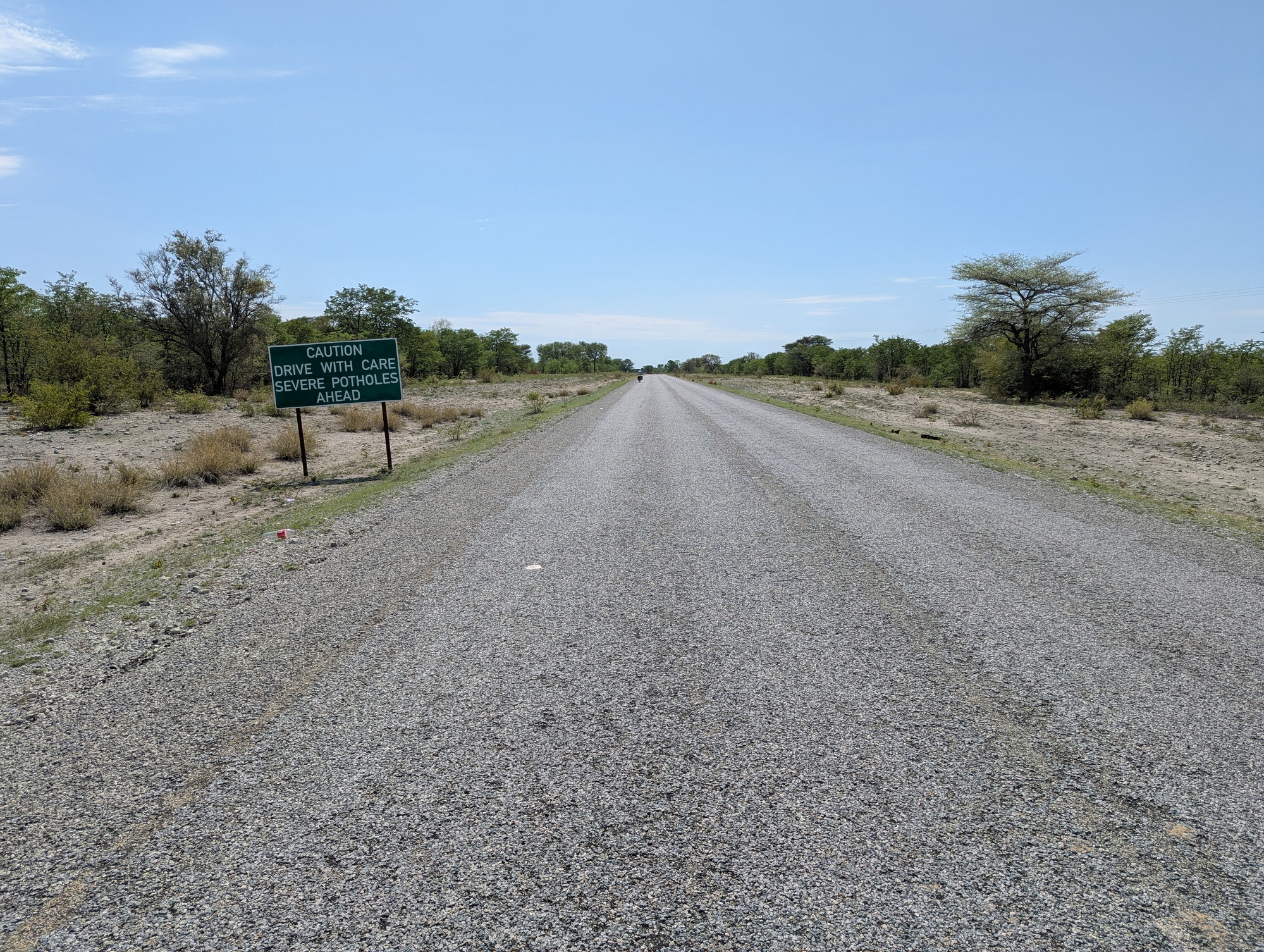 The stretch from Gweta to Nata was also uneventful. It was just hot. Needed to drink a lot. And the road deteriorated for a section outside of Nata. It had been a tar road all the way from Windhoek – perfect tar near to Windhoek, and slowly decreasing quality until this section where the road gave up and was more pothole than tar. The drivers just go around, so the road is gravel and very wide for a few kilometres. We did bump into the French couple on their way to Gweta for Christmas. Hope they have a great trip south!