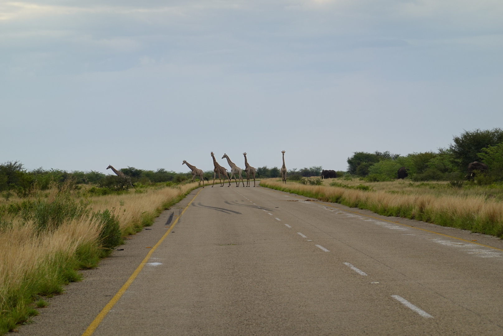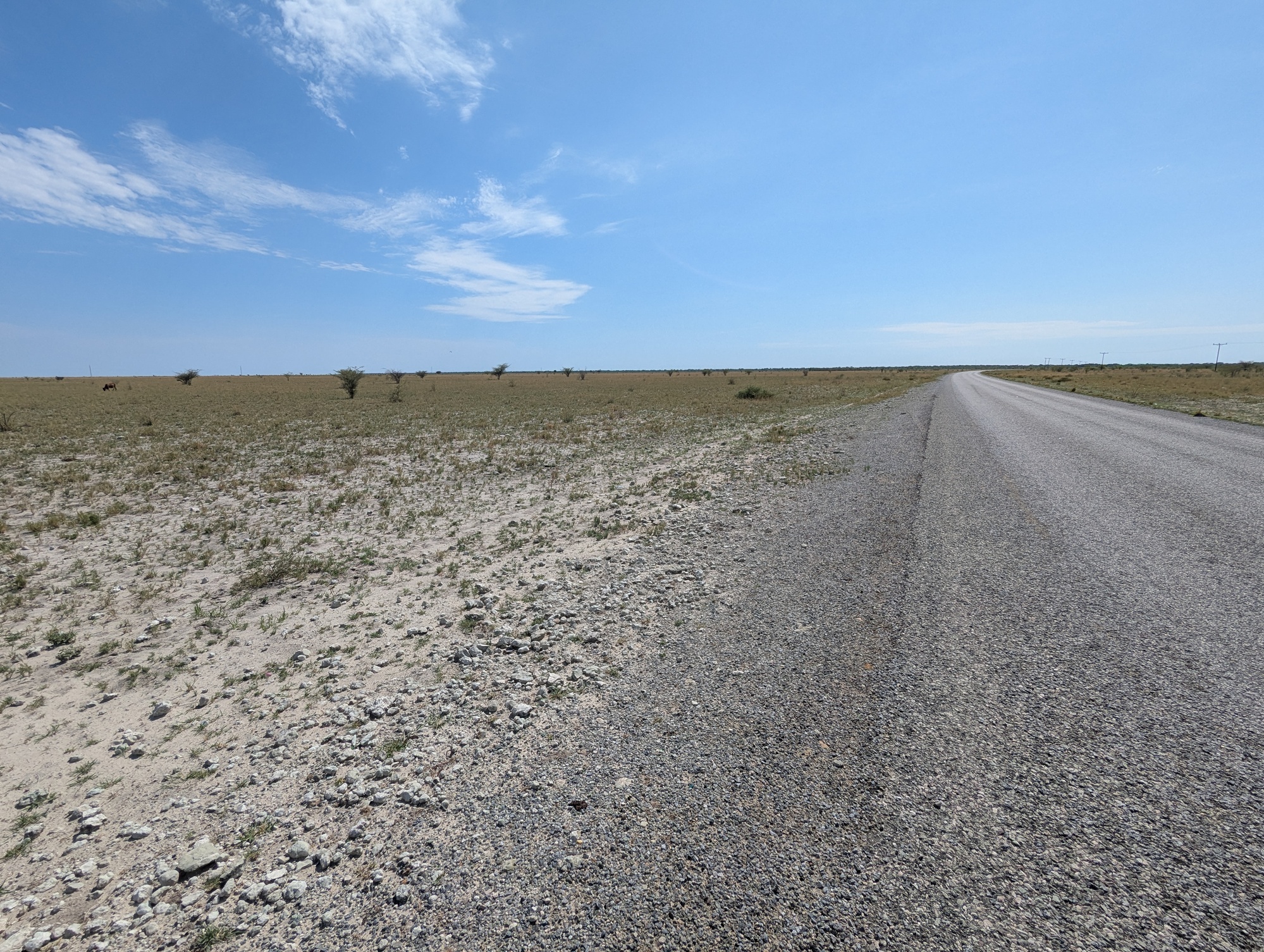 The road verge is mostly grass between the edge of the road for about 20 m before there trees start. In Namibia, the grass is very short (either it hasn’t grown, or someone constantly mows it). Through Botswana this ~20 m zone has been mostly clear of tall vegetation. Some parts are more clear than others. SO now that we are really interested in looking out for wildlife, the grass is taller than most of the rest of the road. And the grass is a mixture of new (green) grass and older, tall, dry grass. Brown. The same colour as most of the predators.