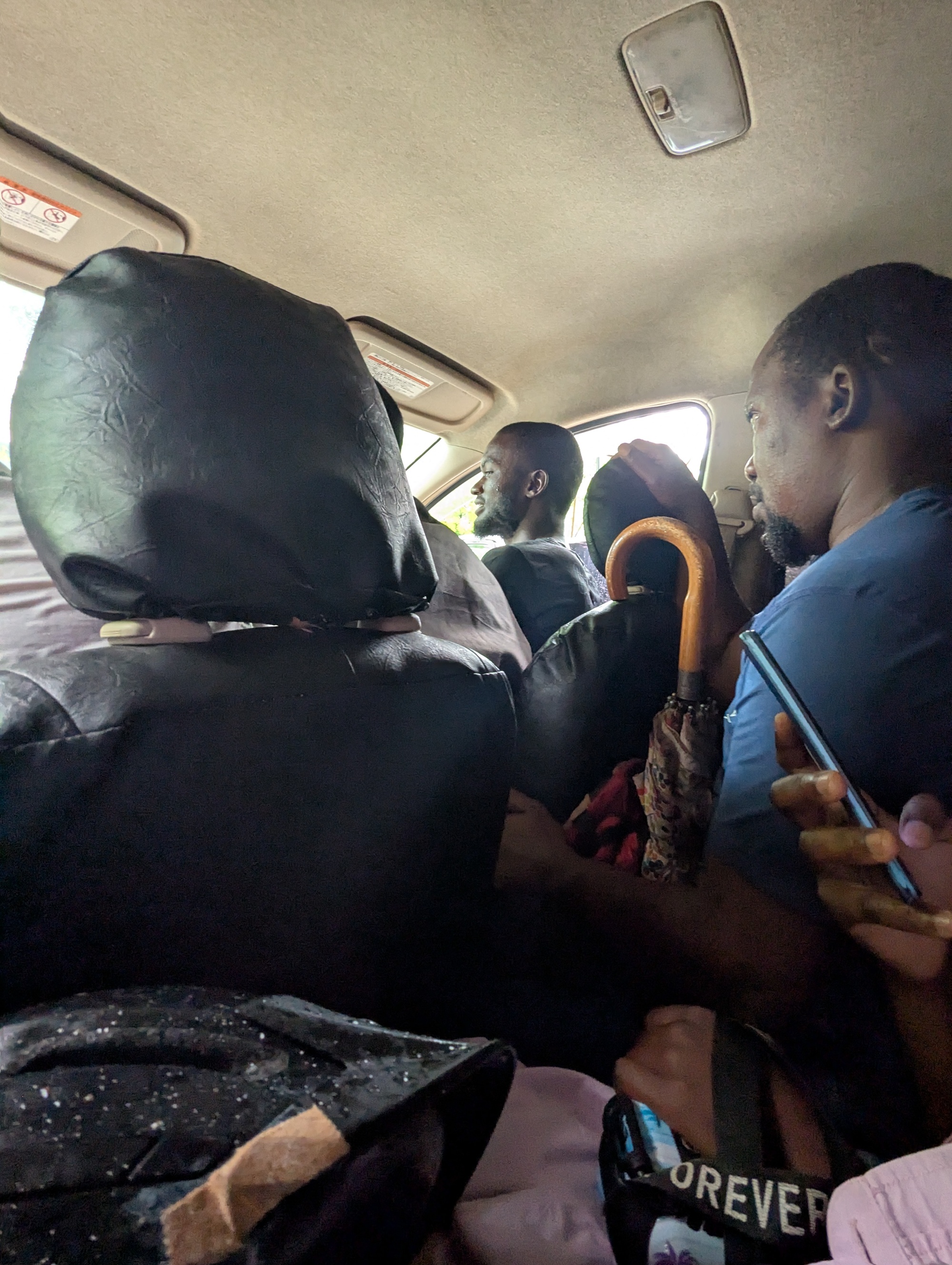 We'd already ridden one way from Chipata and it wasn't the most entertaining road, so decided to hitch a lift back. Which turned into getting a shared taxi. After watching the taxi driver strap the bikes upside-down to the outside of the car we weren't full of confidence they would make it unscathed so, after much discussion, scratching heads and gnashing of teeth, we bought a couple of extra seats in the car and had the bikes relocated inside. Somehow, the same number of people fit in the already full car. I don't think anyone uses "number of seatbelts = max number of passengers" rule of thumb here, but I was surprised to see 7 in the first two rows of this tiny car (and they recon they'd get another row of three people if our big bikes hadn't taken up the space in the back). The tardis would have been impressed.