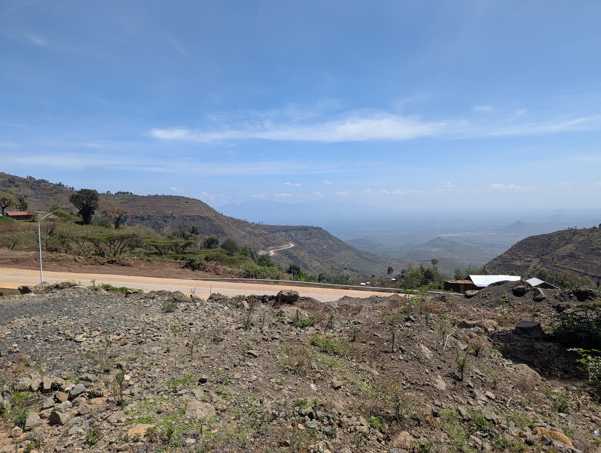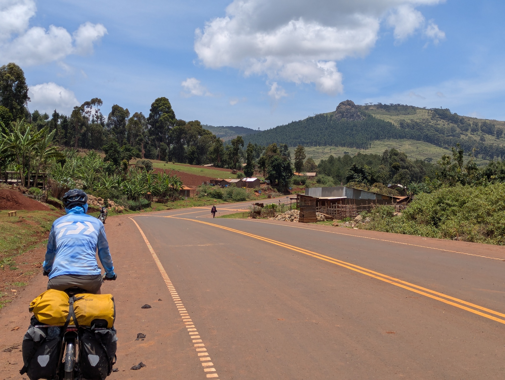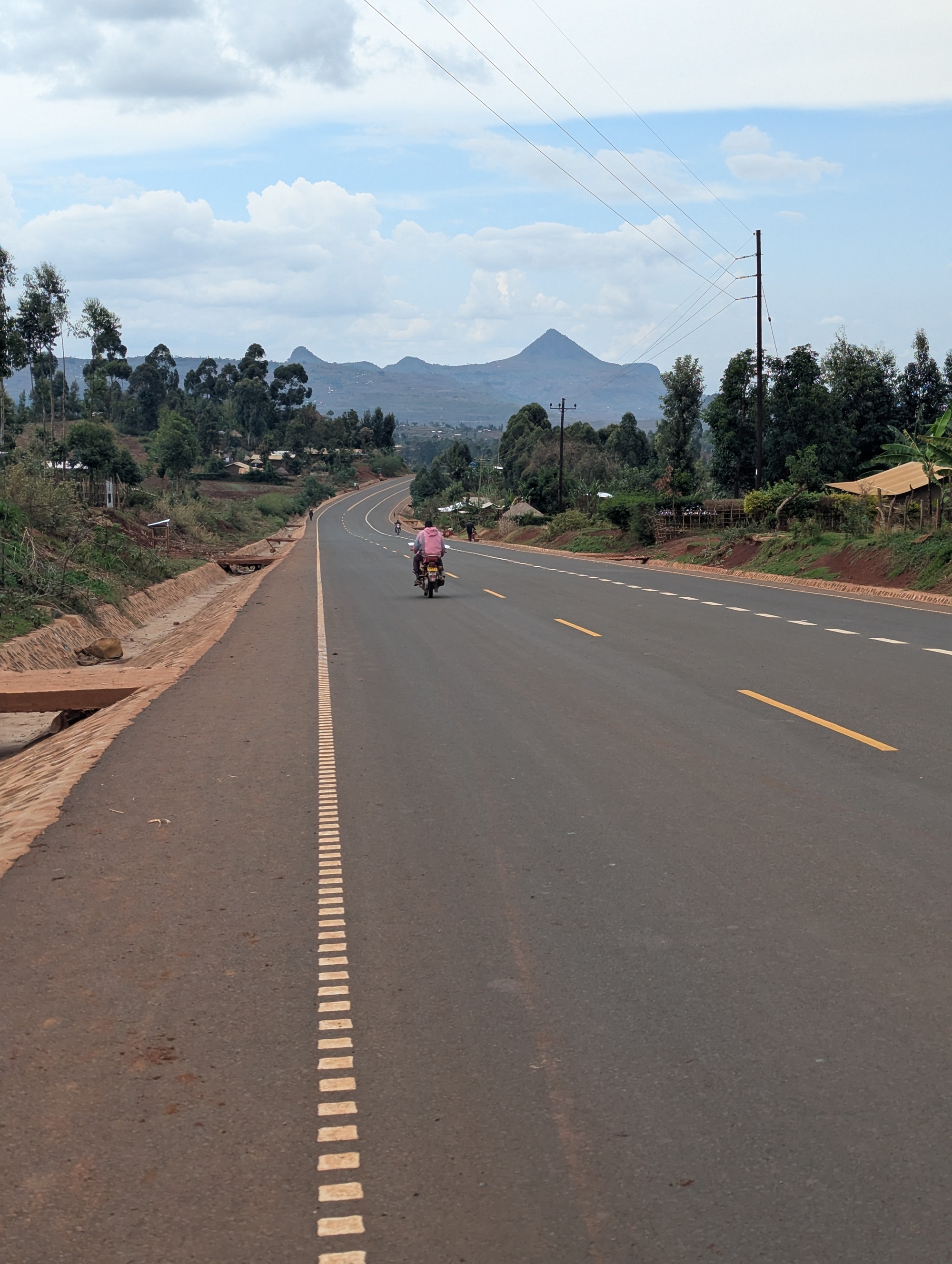 The amazing road continued around the north of Mt Elgon. The road is only a few years old, and evidently of Chinese construction (it looks like a well-made Chinese road, and some of the locals thought we were Chinese). Plenty of ups and downs around the mountain, but lovely smooth tarmac. It’s early in the rainy season here. It’s rained several times at night (occasionally all night) but the rain hasn’t impacted our travels during the day, yet. The rain that has come has made the grass grow like crazy and it’s all green grass, green trees (banana palms and straight, tall blue gums) and rich red earth. The road is also around 1000m above the plain to the north leading to sweeping views. Picturesque.