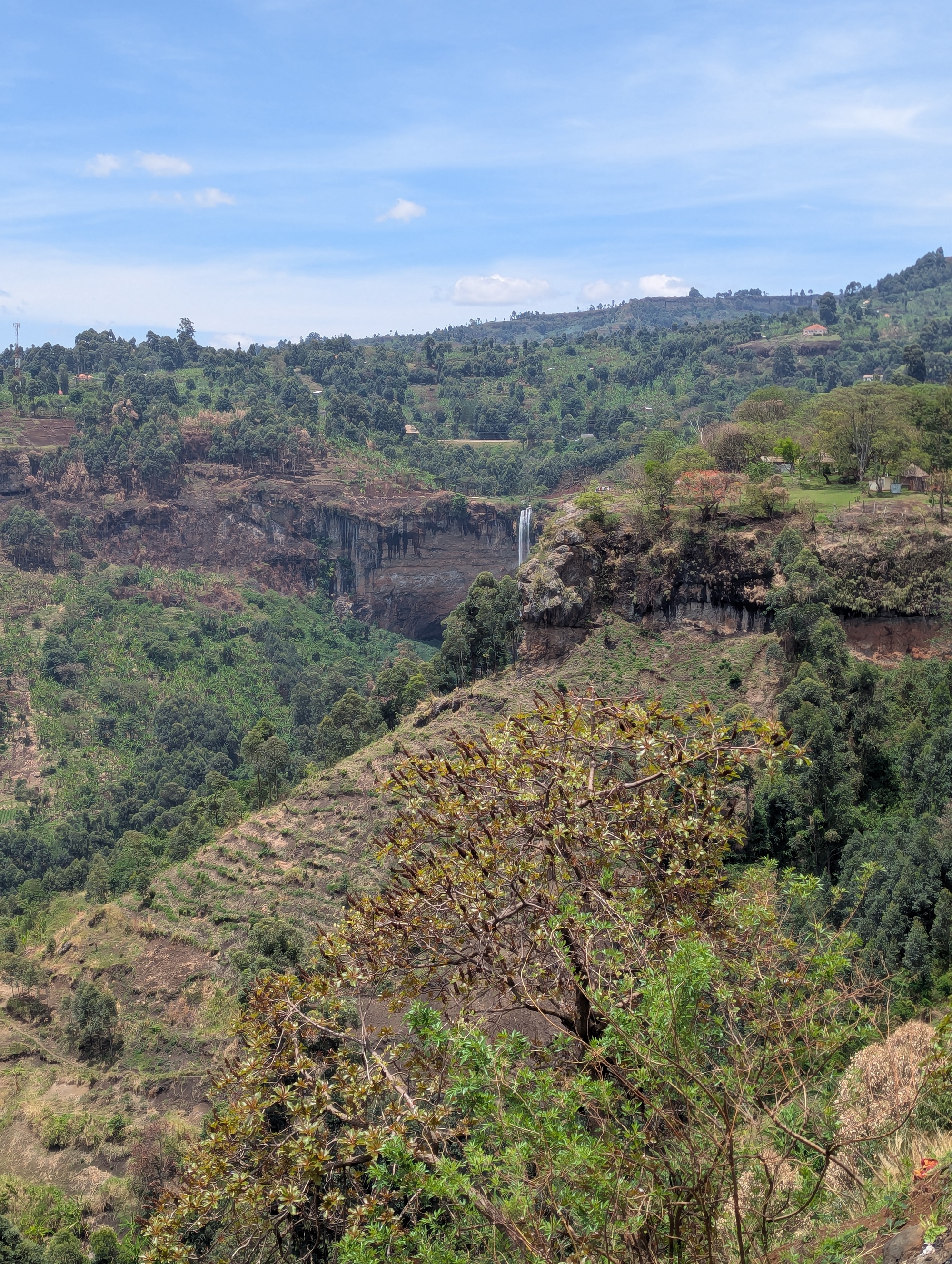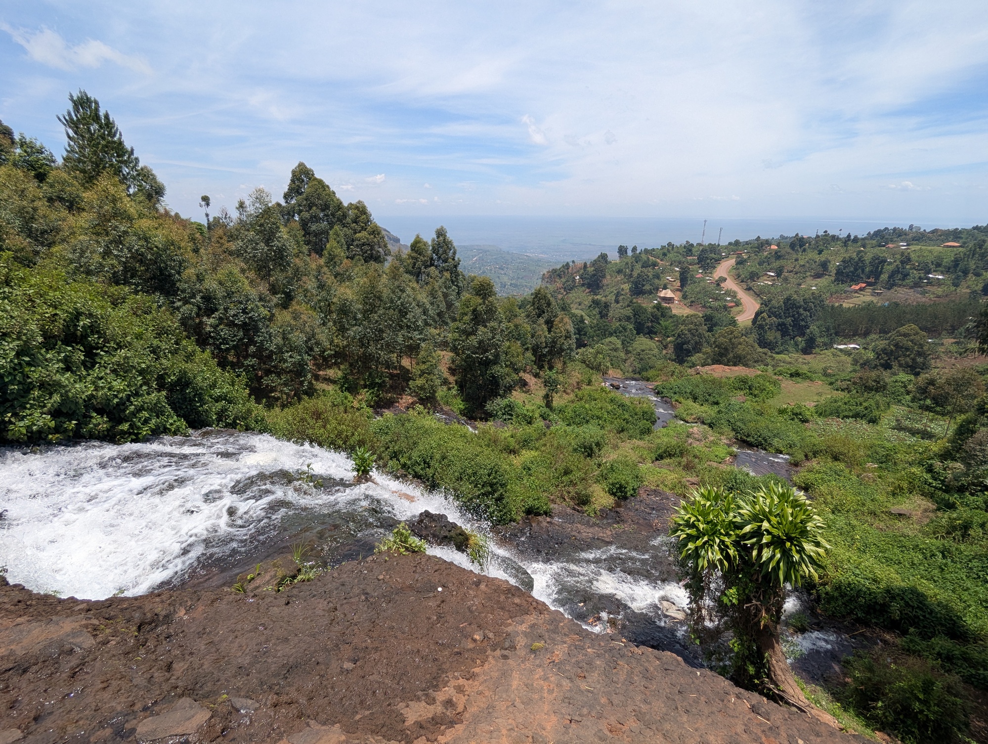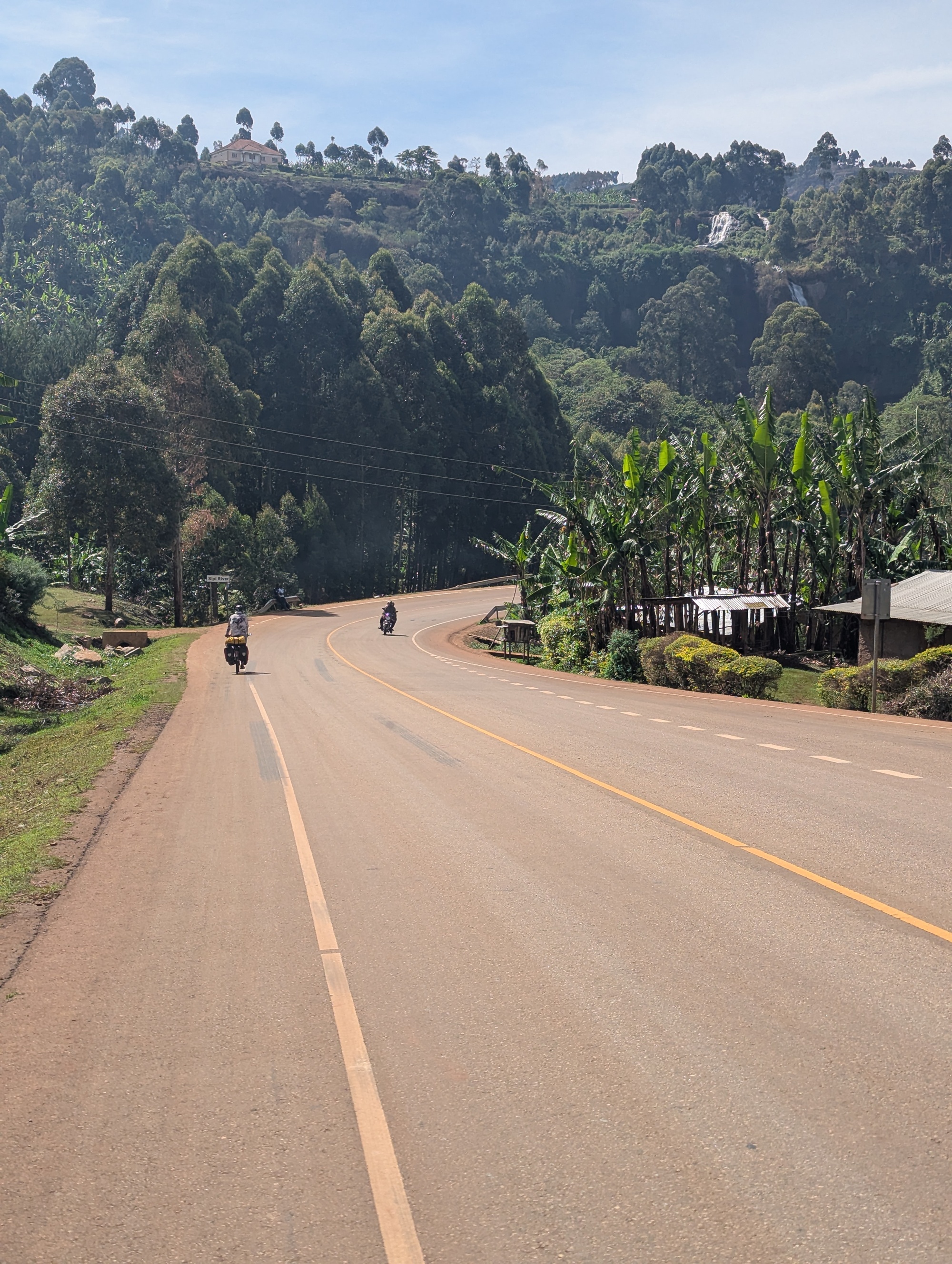 The road we took goes past Sipi Falls. A set of three high falls cascading down Mt Elgon. It’s a bit of a tourist destination. We thought we’d stop and see what the fuss is about, although we know what a waterfall looks like. The local villages have a cooperative / mafia established to prevent you just walking along the local roads to the falls, and we’d read about horror stories of tourists without a guide being extorted, so we succumbed and took a guide. The upper falls is reasonably high (~85m), but somewhat plain (and surrounded by a spider’s web of poly pipes taking water for irrigation). The second falls has a nice cascade followed by a shower of water. We were right under the falls at about midday and, looking up at the falls, the angle of the sun and water made it look pretty special. We asked our guide about the third falls, but he claimed there was nothing of importance further down river. Maybe we’d misunderstood. So, we paid up, and rode on. A few kilometres further along, we looked back, and up, and could clearly see a third falls (apparently 100m high) where there was supposed to be nothing. We’ve been lied to and cheated several times (hey, that’s normal when you’re travelling and at a disadvantage in any negotiation), but this was quite disappointing. Luckily, we saw most of the 3rd falls (at a distance), so we could at least enjoy them. We might keep the guides phone number, but he won’t be getting any positive recommendations from us.