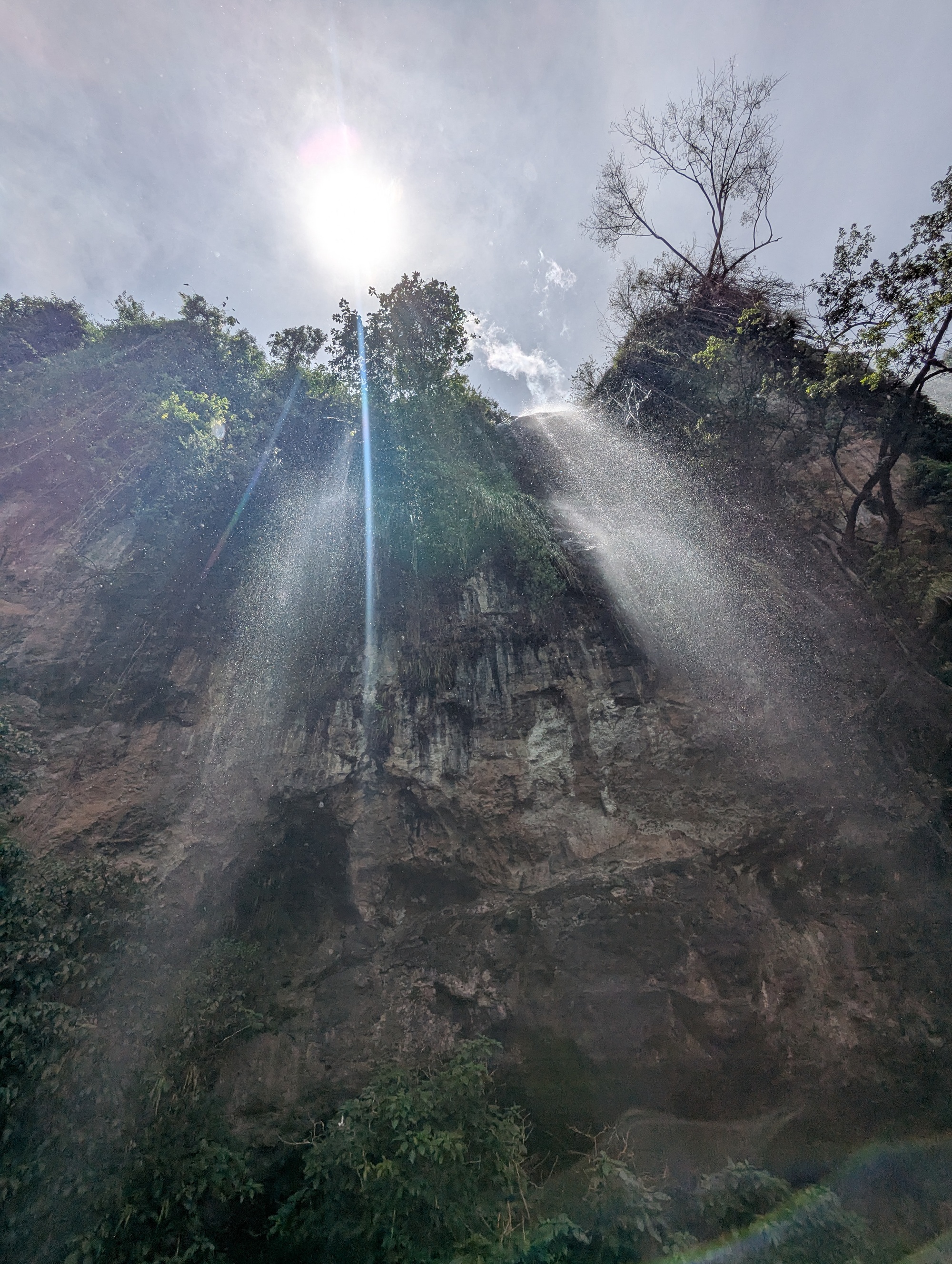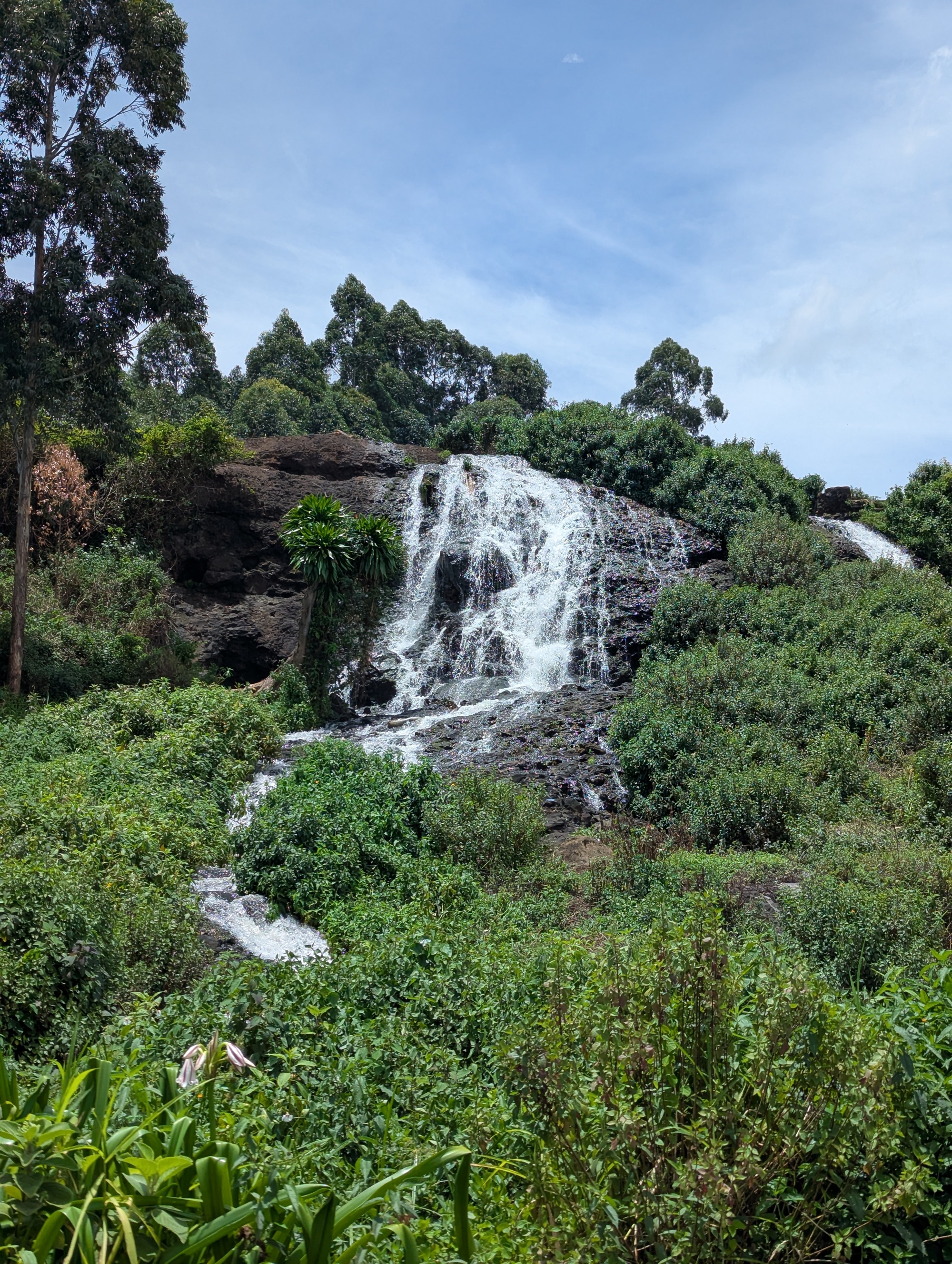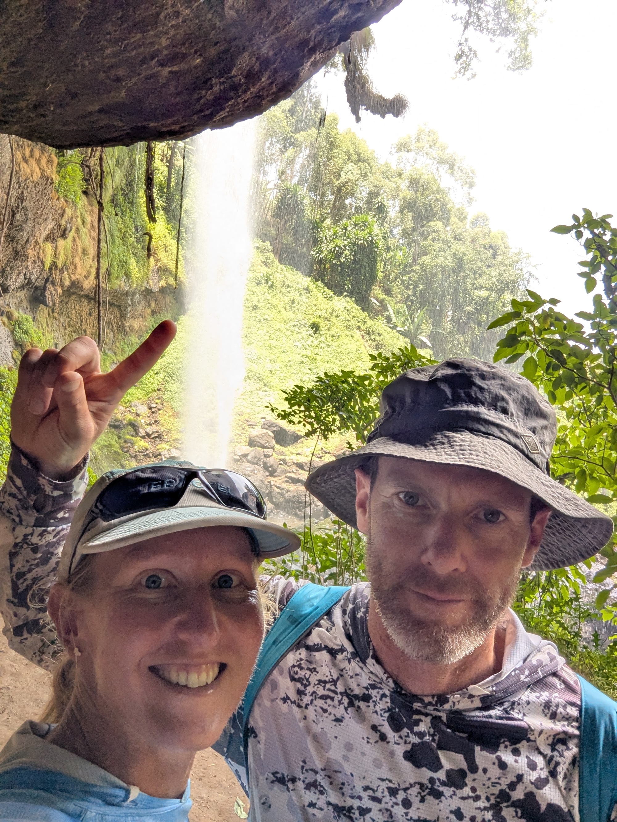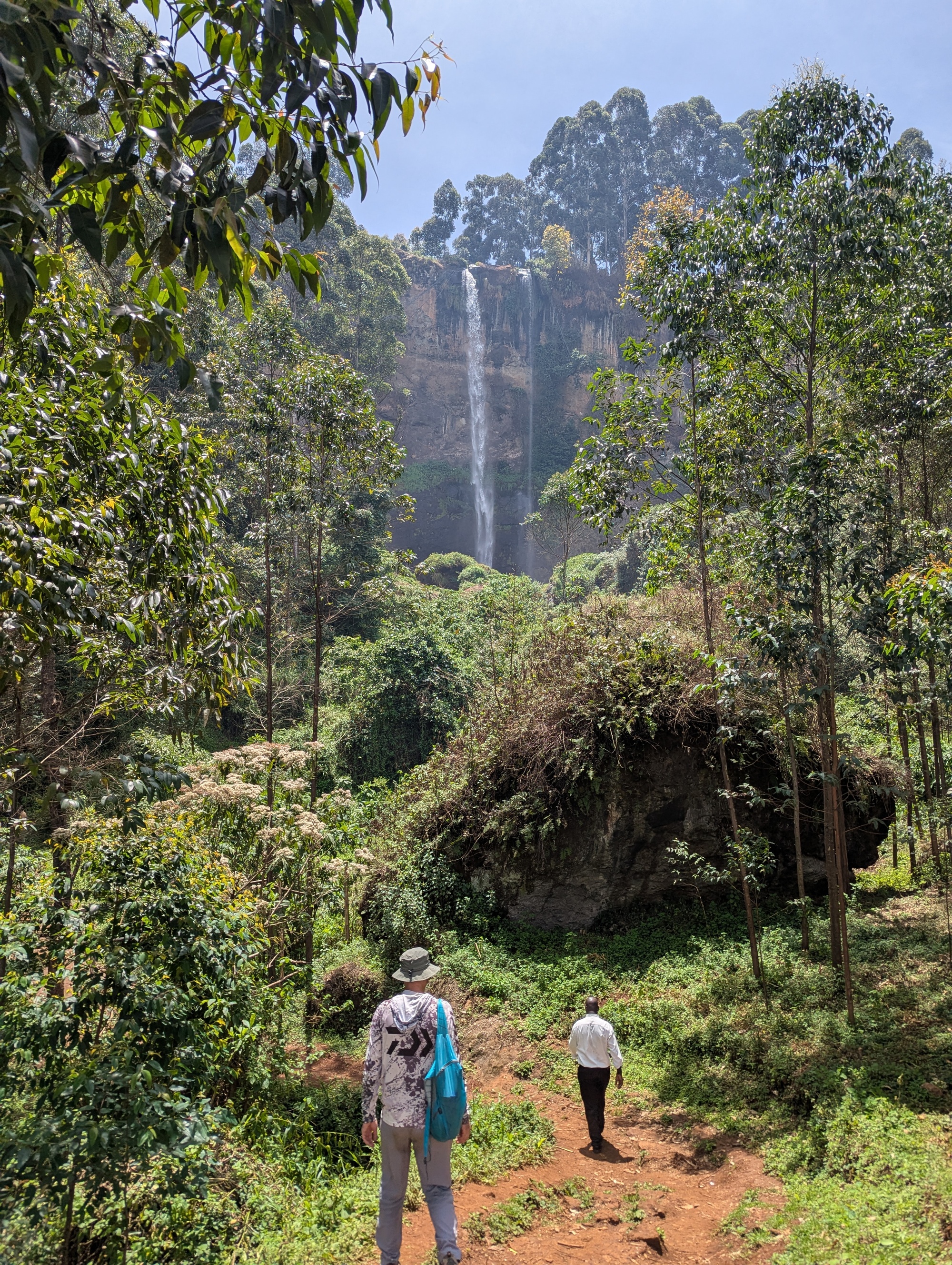 The road we took goes past Sipi Falls. A set of three high falls cascading down Mt Elgon. It’s a bit of a tourist destination. We thought we’d stop and see what the fuss is about, although we know what a waterfall looks like. The local villages have a cooperative / mafia established to prevent you just walking along the local roads to the falls, and we’d read about horror stories of tourists without a guide being extorted, so we succumbed and took a guide. The upper falls is reasonably high (~85m), but somewhat plain (and surrounded by a spider’s web of poly pipes taking water for irrigation). The second falls has a nice cascade followed by a shower of water. We were right under the falls at about midday and, looking up at the falls, the angle of the sun and water made it look pretty special. We asked our guide about the third falls, but he claimed there was nothing of importance further down river. Maybe we’d misunderstood. So, we paid up, and rode on. A few kilometres further along, we looked back, and up, and could clearly see a third falls (apparently 100m high) where there was supposed to be nothing. We’ve been lied to and cheated several times (hey, that’s normal when you’re travelling and at a disadvantage in any negotiation), but this was quite disappointing. Luckily, we saw most of the 3rd falls (at a distance), so we could at least enjoy them. We might keep the guides phone number, but he won’t be getting any positive recommendations from us.