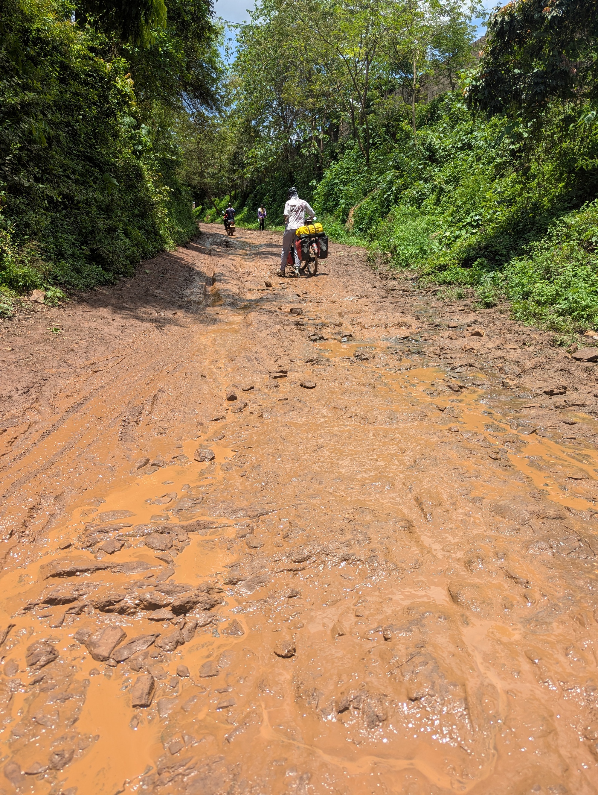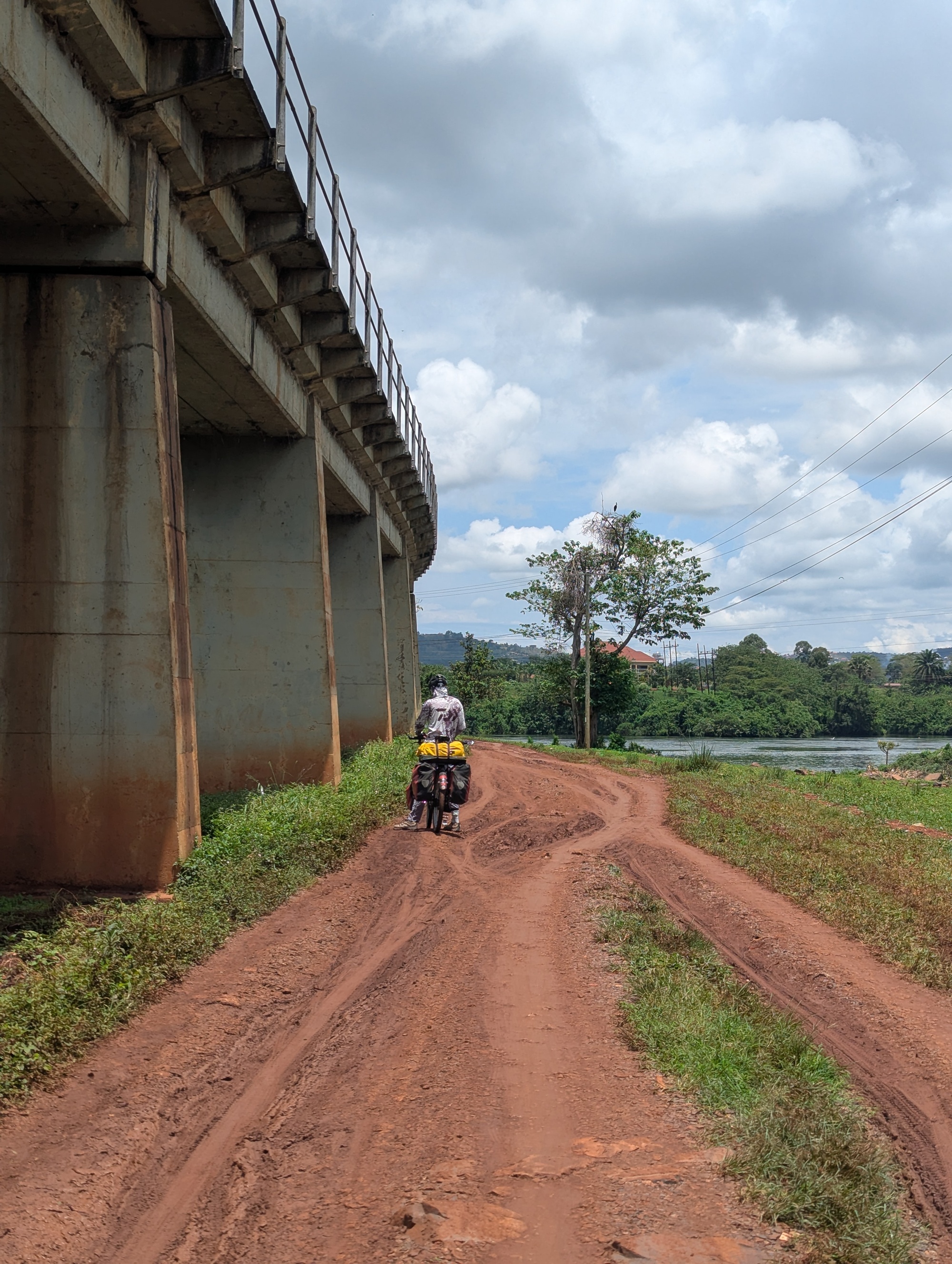 We took a dirt track, that ended up going over a train bridge over the Nile. It hadn’t rained all day that we could tell, but the dirt track was slippery with sloppy mud. Again confirms the only reasonable way to go during the wet season is to stay on asphalt – or love pushing on muddy tracks.