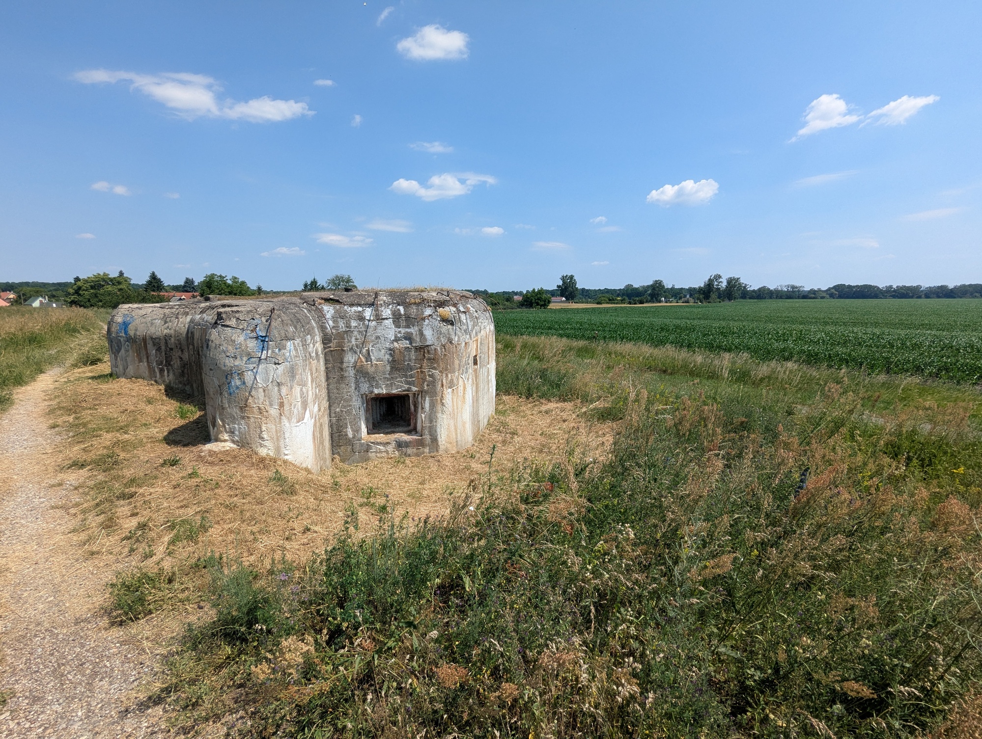 Slovakia only got a few hours. Some of the roads were pretty bad. The Eurovelo path followed the embankment on the March river. Rough ride in parts. Bunkers still in place - I guess in case the Iron Curtain needs to come down again one day.