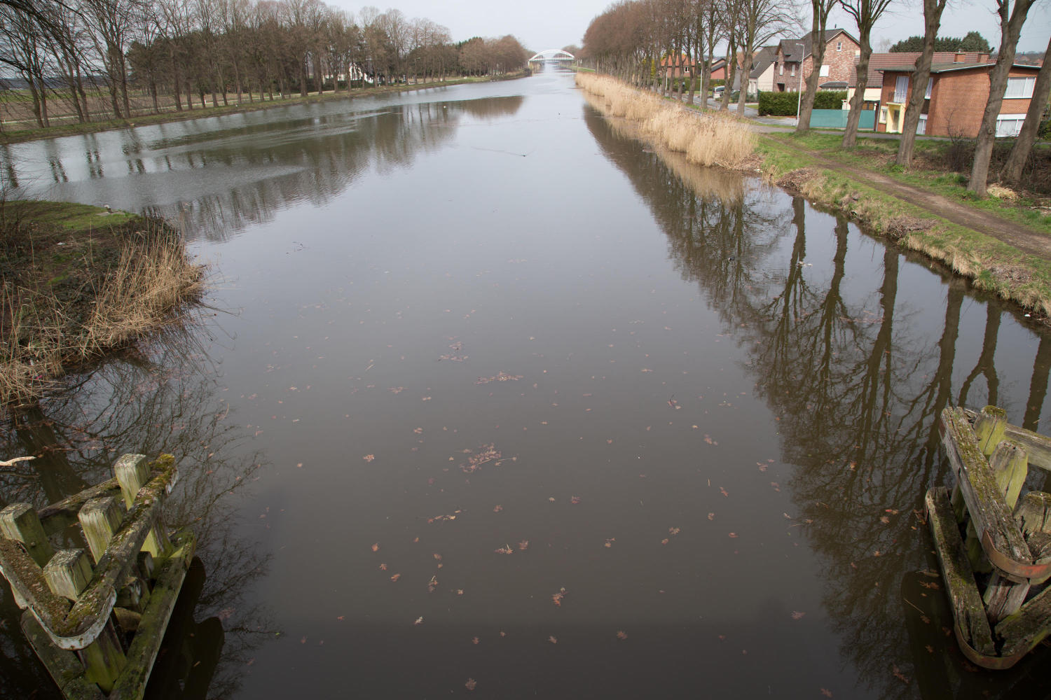 The wind is blowing gently from the south. Sometimes the bike path is lower than the canal, other times we ride on the dike near the water. Always in a straight line. Only occasionally we need to cross over a bridge to the other side of the canal.