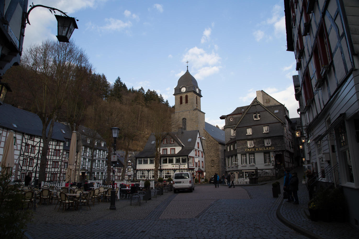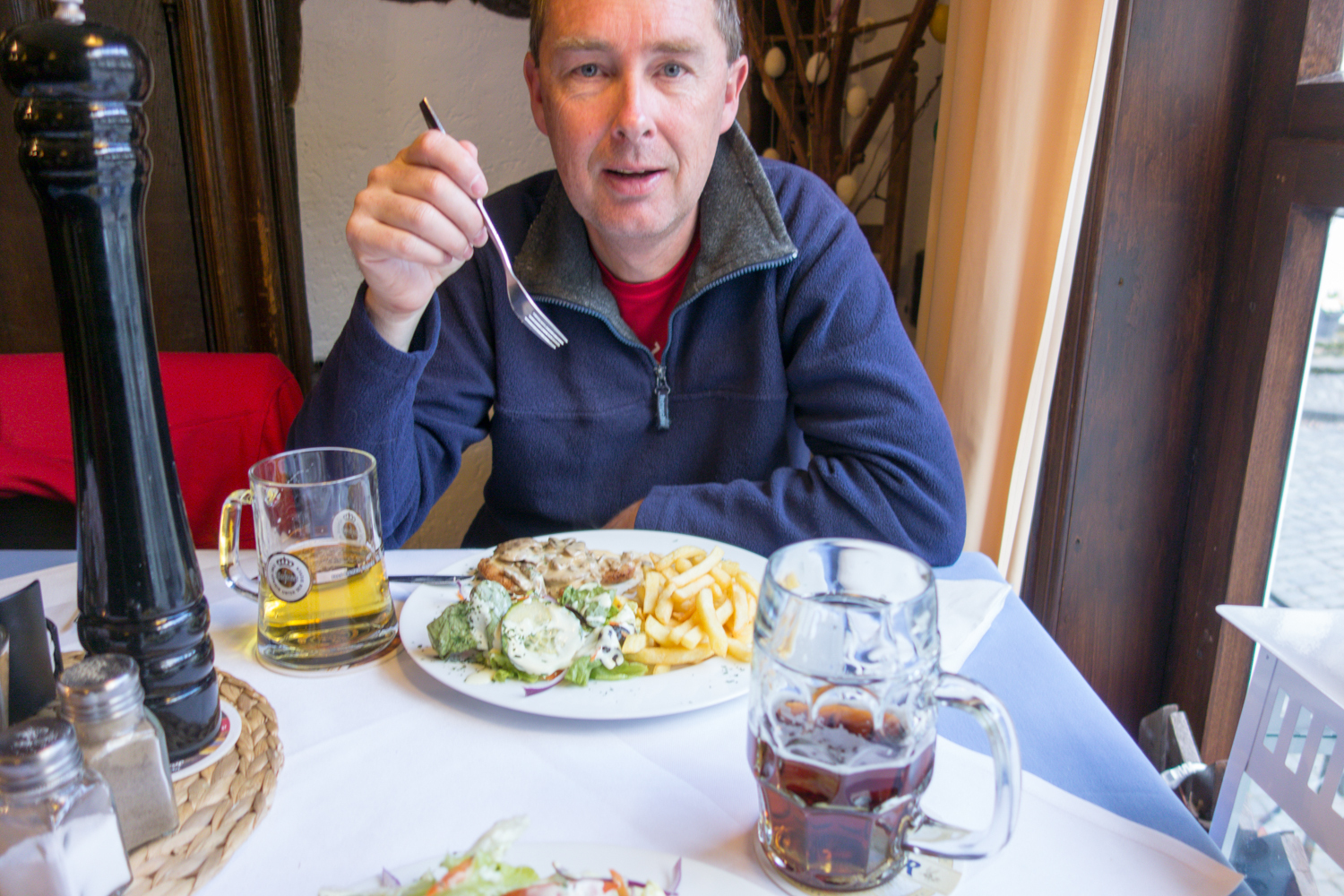 Patrick finds the tourist information office and checks whether any room is available. We have forgotten that it is Easter Weekend and the town is fully booked so we stick to the original plan of camping by the Ruhr river. We find the campground, set up camp, take a hot shower...as always amazing how a hot shower washes away the day on the road...then walk the 1.5kms back to town to look around and have dinner. Back at camp, there is a club house where we can stay out of the cold and reflect on the day. One of the campers gives us a beer....doesn't get any better!