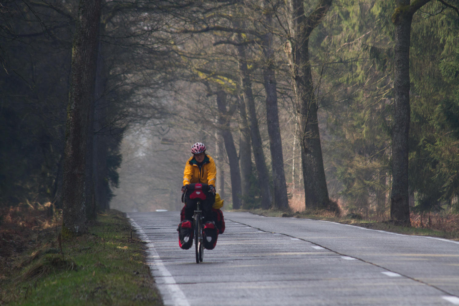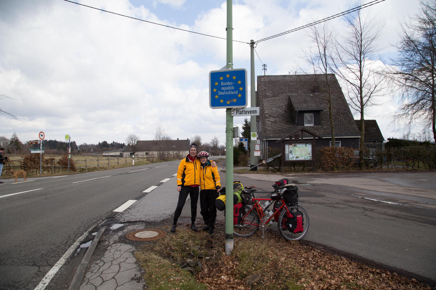 Our bodies hurt getting used to being on the bike all day. We climb to 500 meters, it's cold, it sleets and reach the German border with 5kms to go....we get a downhill.