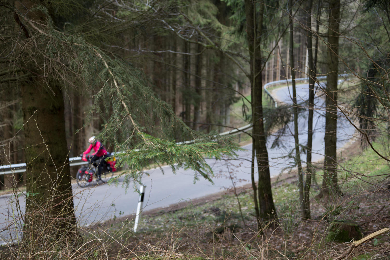 "I can't figure out where the snow is coming from" Patrick says as we are climbing out of the valley away from Monschau. We will have a 600 meter gain in altitude, then lose 200 meters only to regain later in the day. The occasional snowflake dropping down on us must be because of the relative humidity. The sky is blue and the temperature 25 degrees. My, oh my, it was cold packing up the tent and gear this morning. Frost covered our bikes and Patrick's riding shorts had frozen stiff overnight along with the water in our drinking bottles.