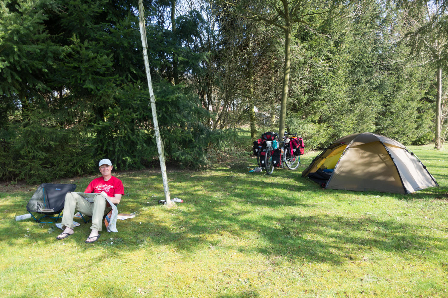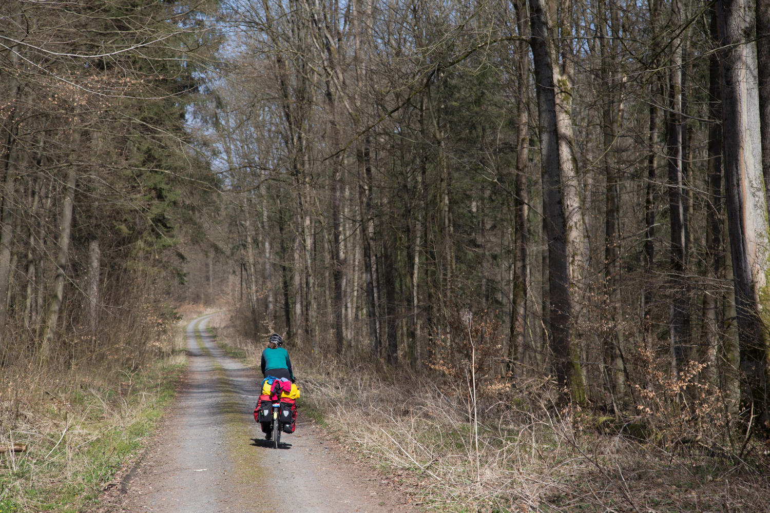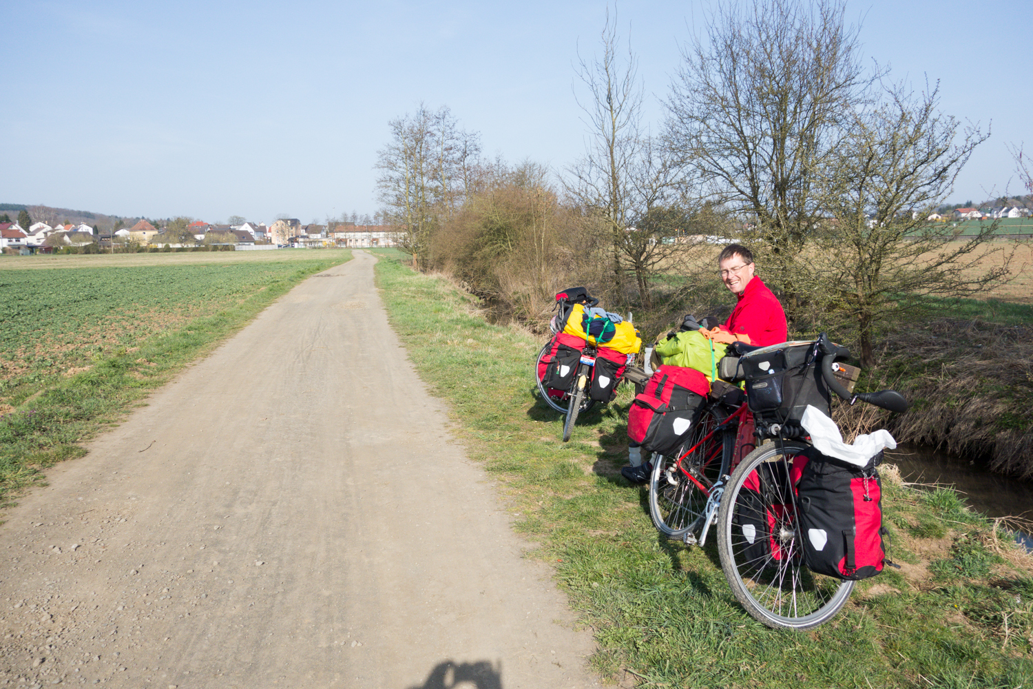 The morning air is still chilly and the tent is wet from the dew. We continue to follow the R-7 route but lose it through Giessen and start cycling on the road. Slowly getting used to traffic as most of our riding so far has been on bike paths and designated bike routes. The bike paths are nice even if it means weaving extra kilometers through towns and fields and forest.