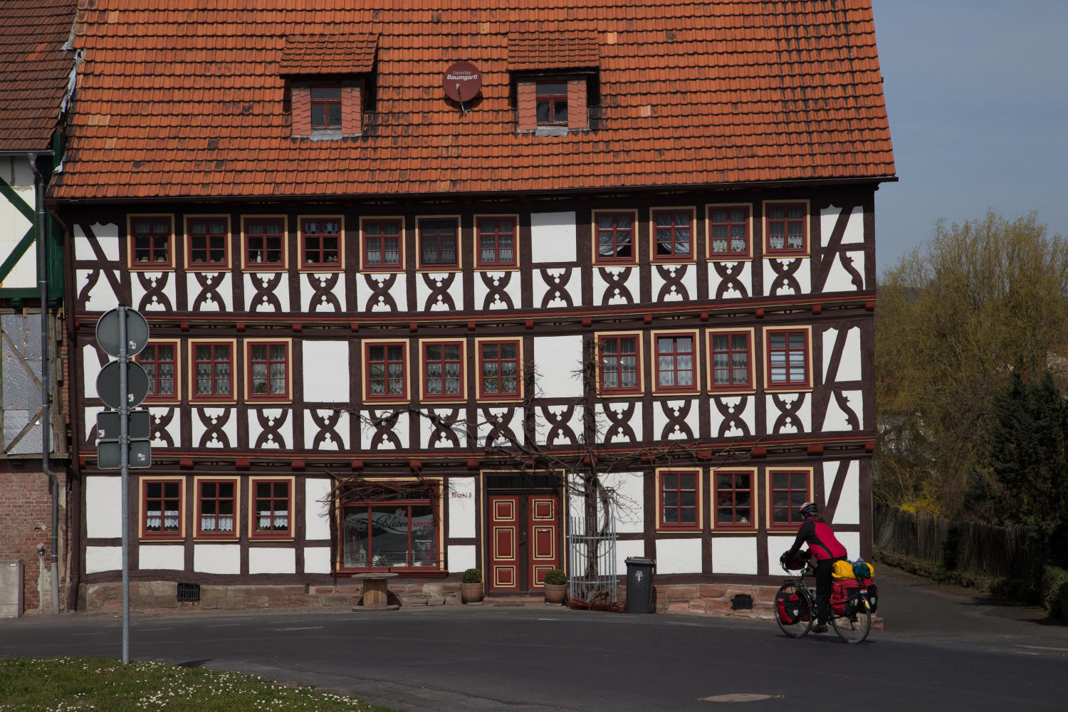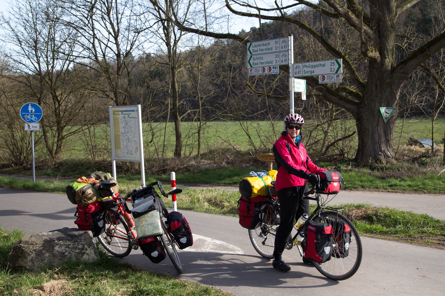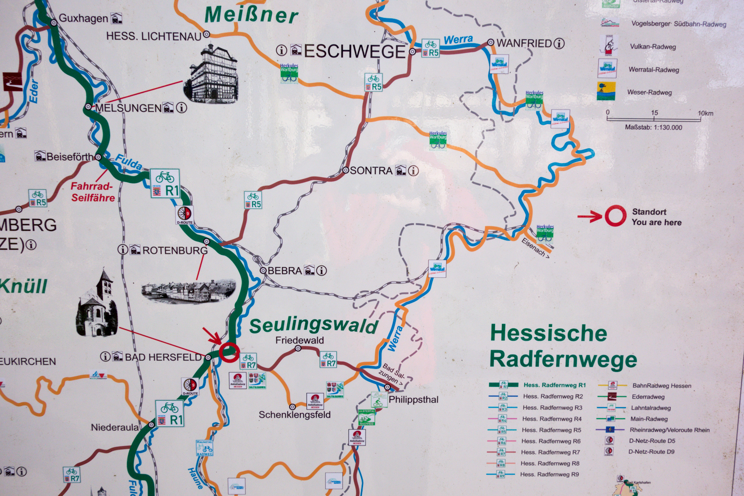 We continue on R-7 until changing to following the Wera Valley Bike Route. We cross the line where the Iron Curtain divided Germany until 1989. There was a pyramid of barbed wire at the side of the sign.